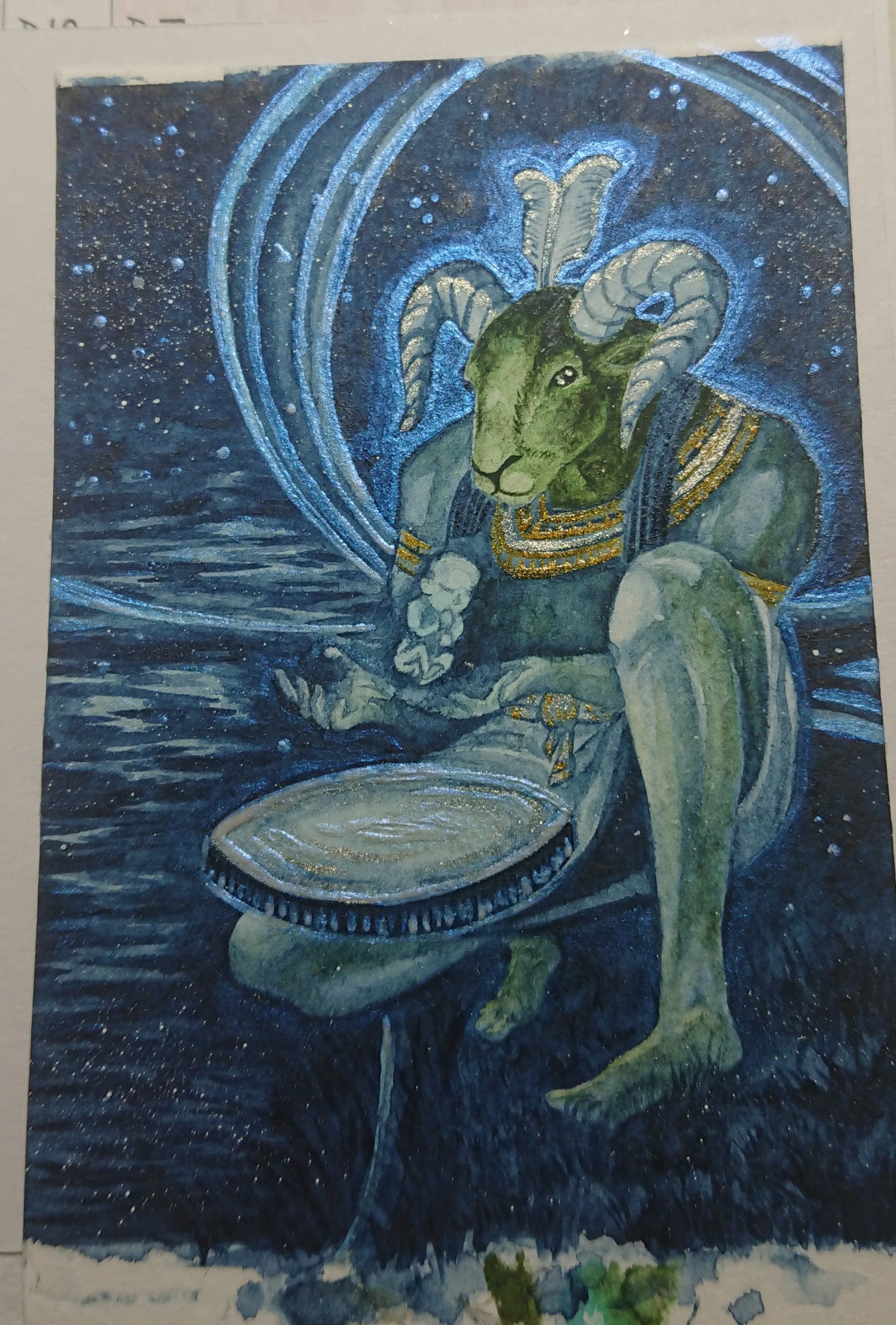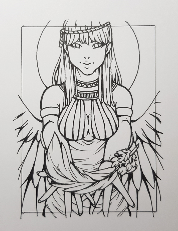 Es soll Maat darstellen, wie sie die Feder der Maat zum betrachter hält, mit welcher sein Herz im Totengericht aufgewogen wird. :) Ich wollte erst Ra machen, aber irgendwie fand ich Maat dann im Endeffekt doch besser und es hatte ‘gefluppt’ :D