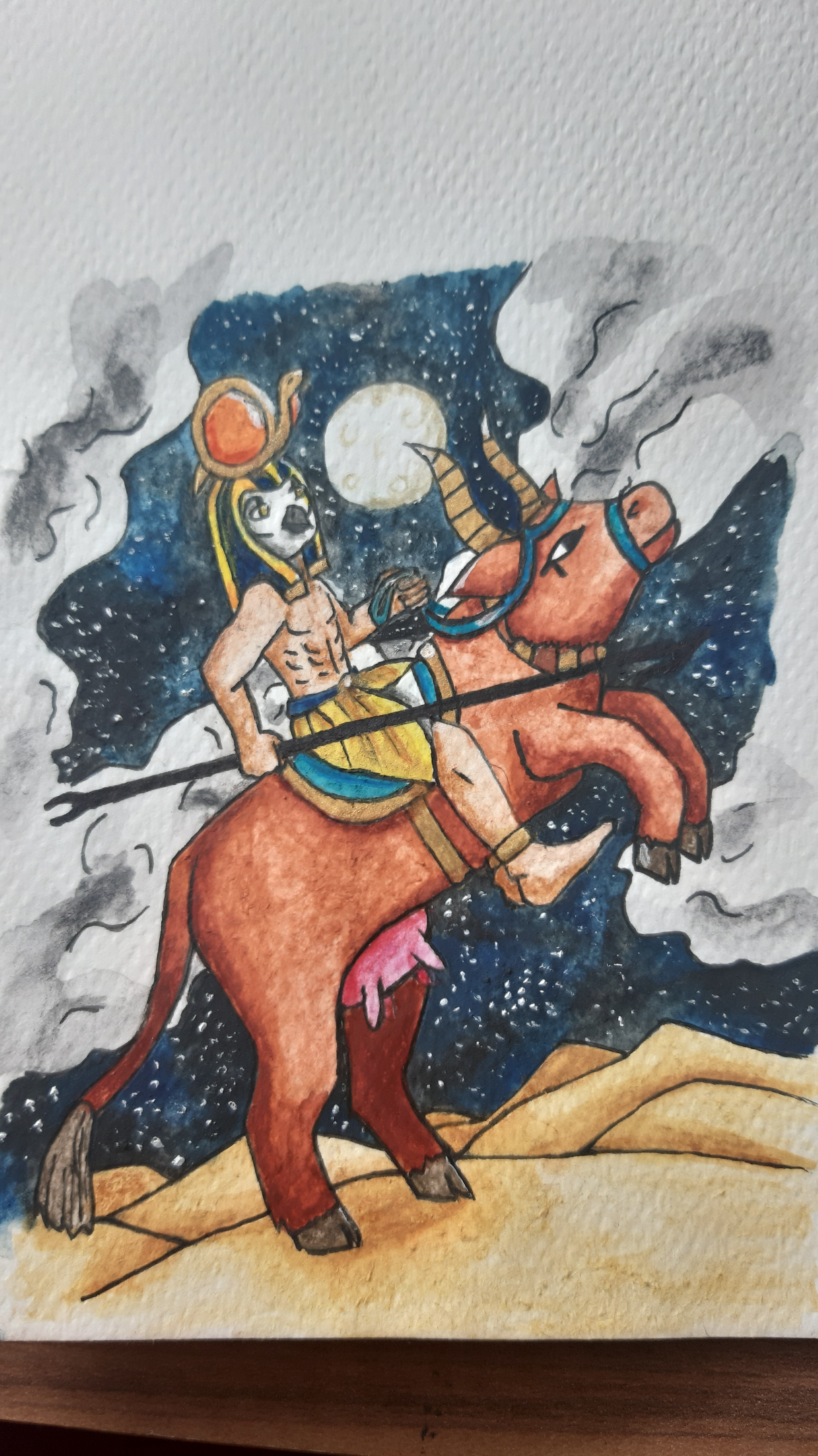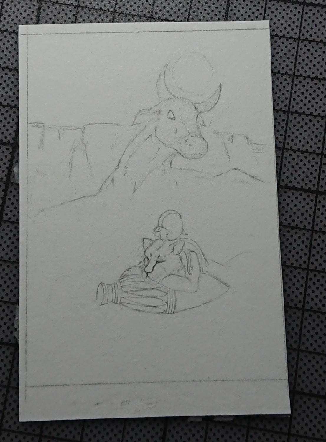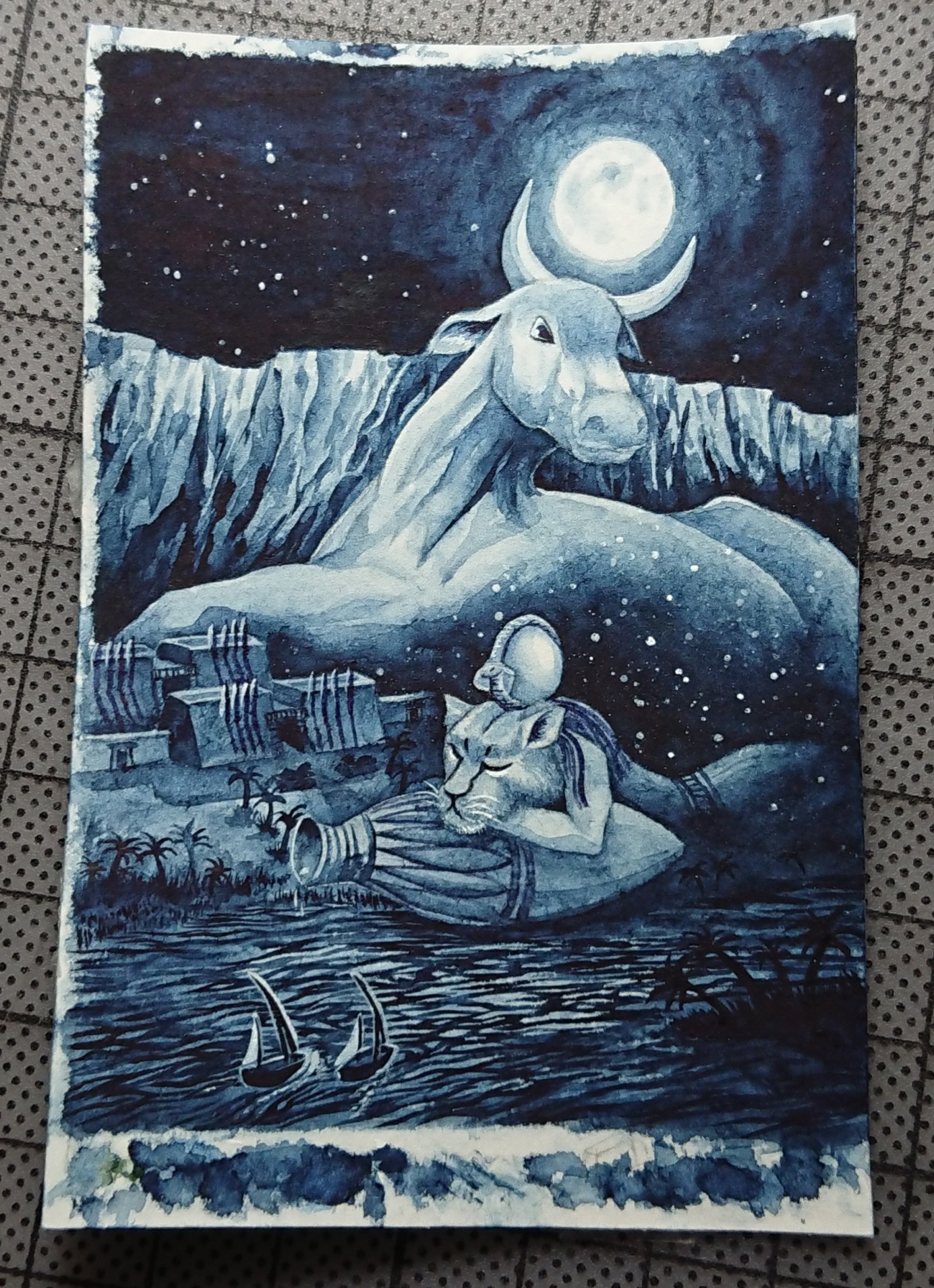 So mein zweiter Beitrag ist jetzt auch fertig. Hier habe ich Re/Ra gezeichnet, der auf Nut in Form einer Kuh in den Himmel aufsteigt.