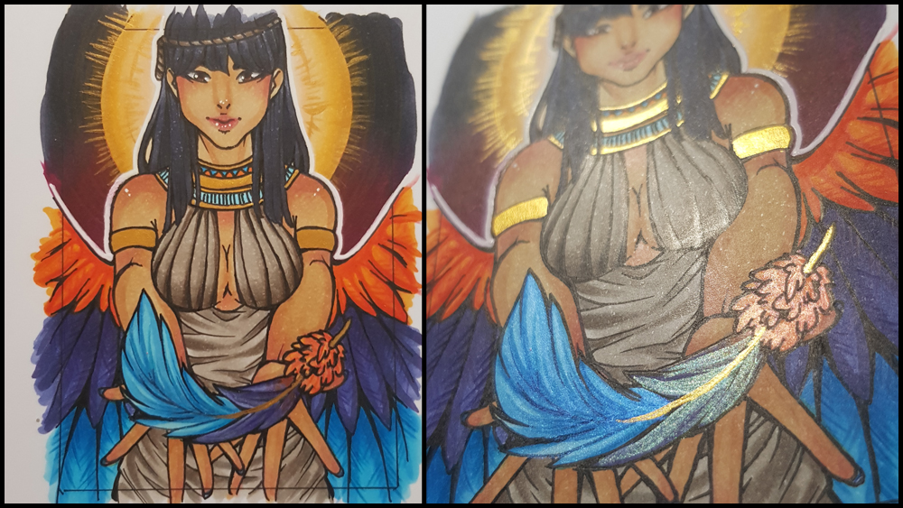 Ich hoffe, das die Colo so gefällt und in Ordnung ist :3. Hab natürlich wieder für die goldenen Teile der Karte die Metallic Goldfarbe genutzt, aber auch die Feder in Maat’s Hand ist leicht am Schimmern je nach Lichteinfall.