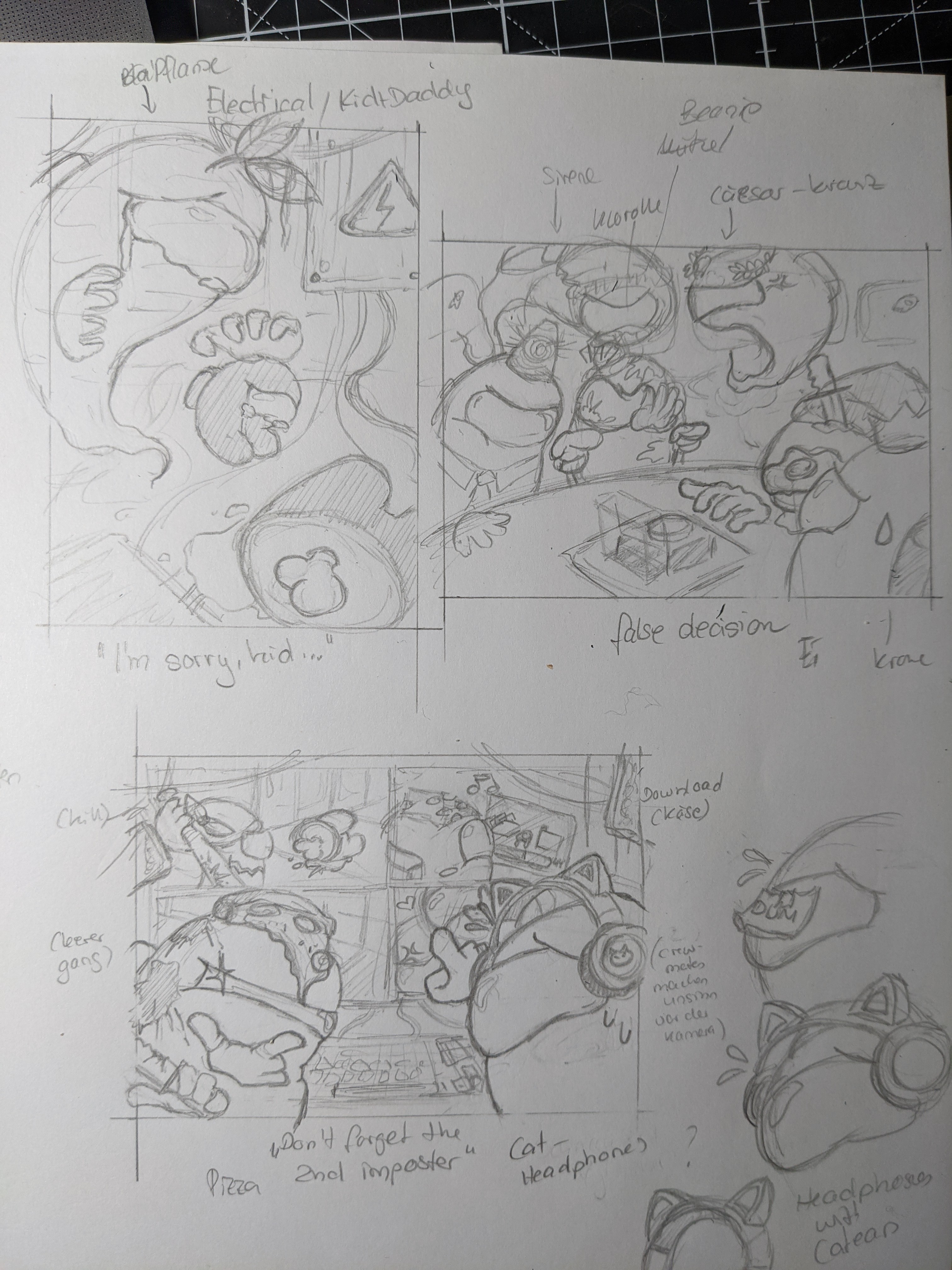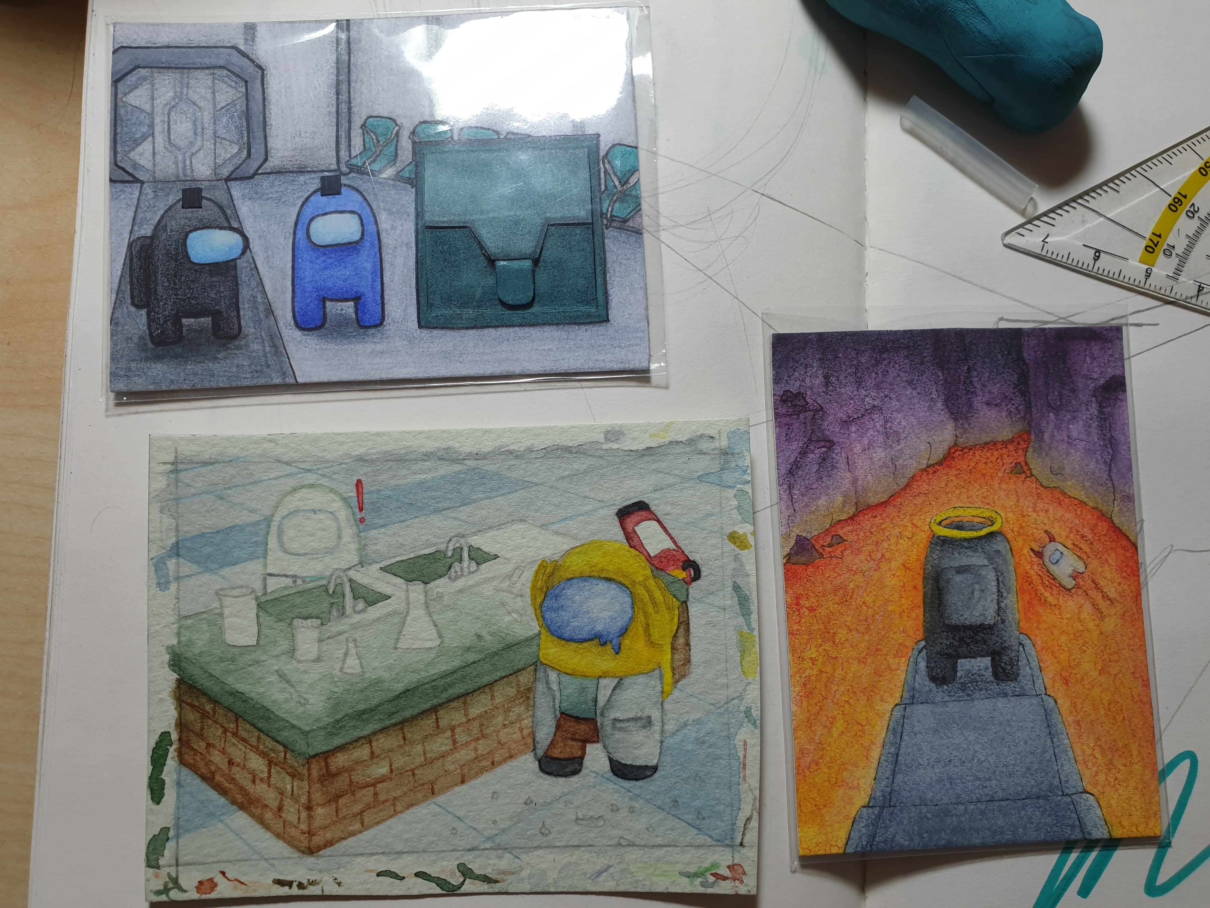 So in etwa stell ich mir die Karten zumindest vor (sorry, doch kein Comic xD). Hier und da werde ich vermutlich die Posen noch anpassen, damit man sie etwas besser erkennen kann (gerade bei der 2. wo sie am Tisch stehen oder in den Kamera-Ansichten).