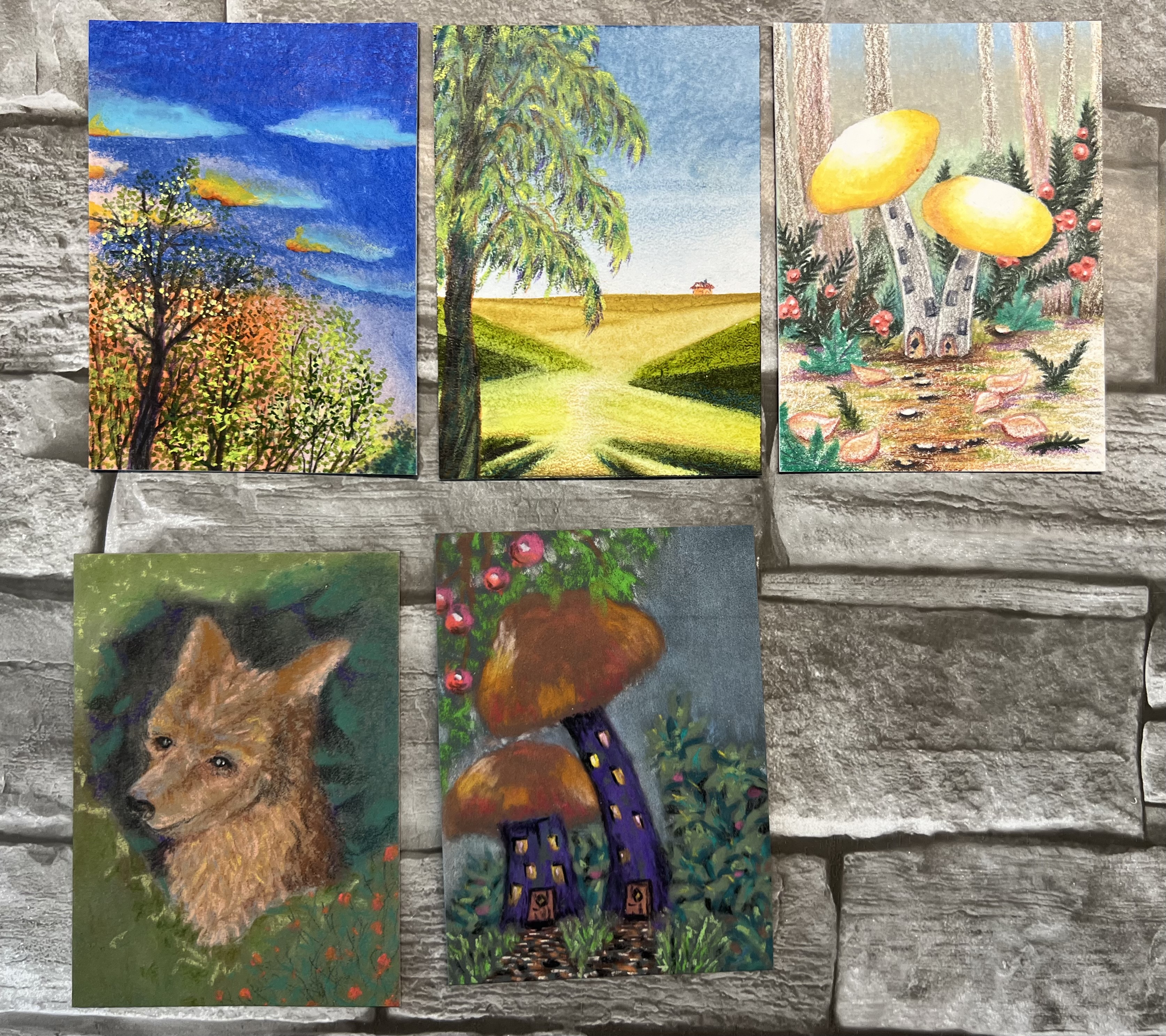 Momentan tendiere ich dazu, die lockeren Bäume Landschaft, die hellen Buntstifte Pilze und den Wolfwelpen einzureichen, falls zugelassen. Wenn die STA-Teilnehmer aber eins der anderen Karten lieber hätten, würde ich natürlich entgegenkommen, wenn die Karten zugelassen sind.