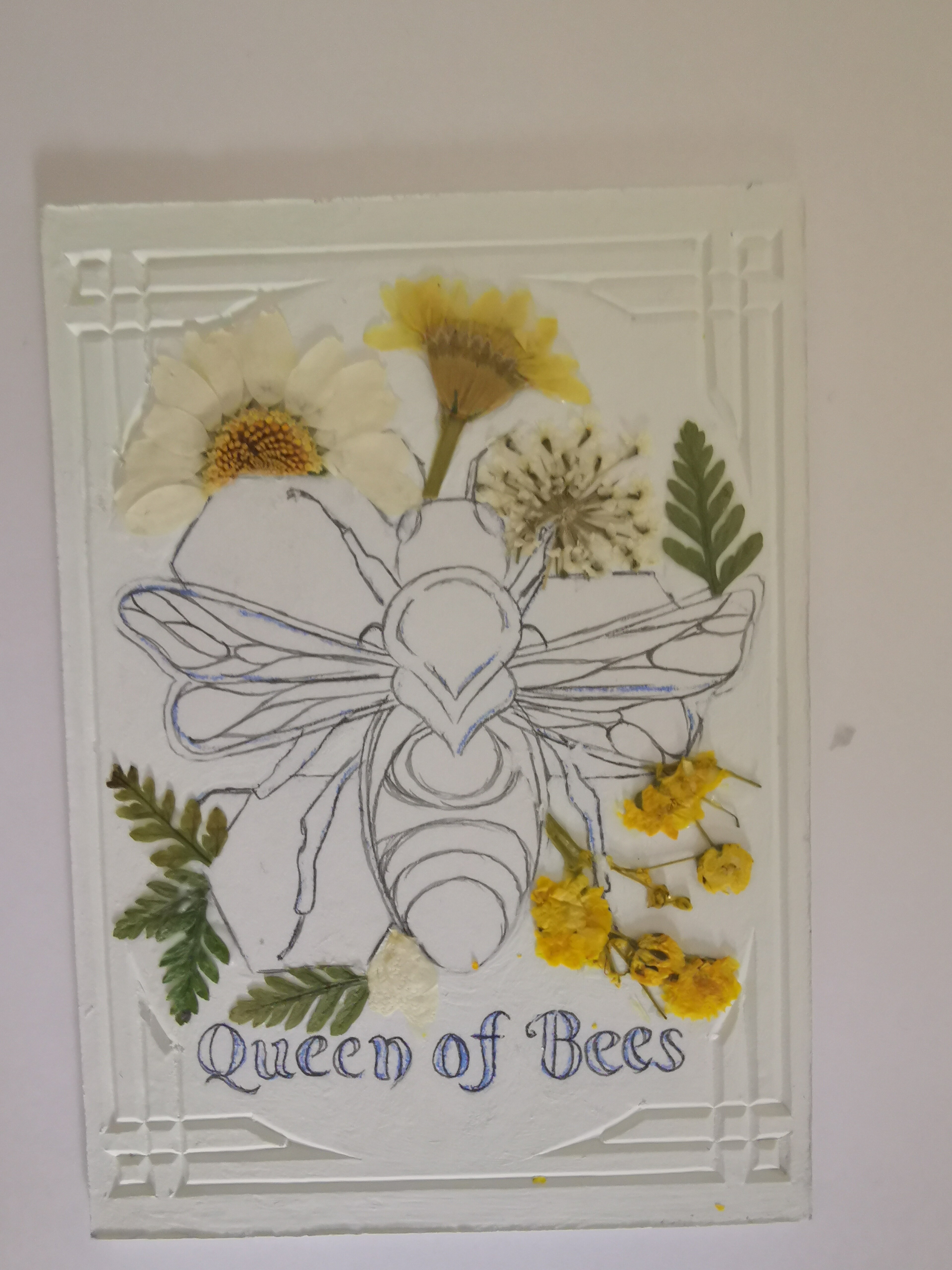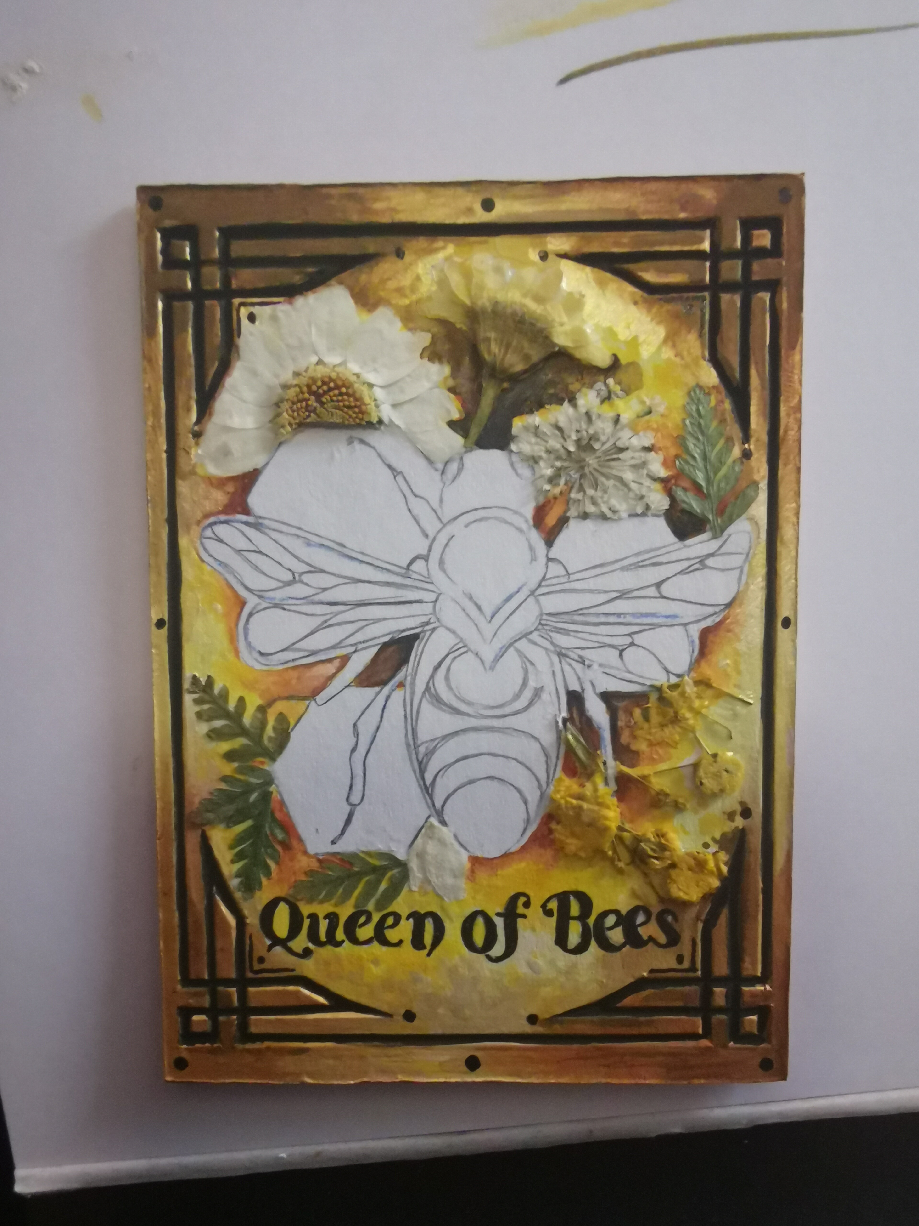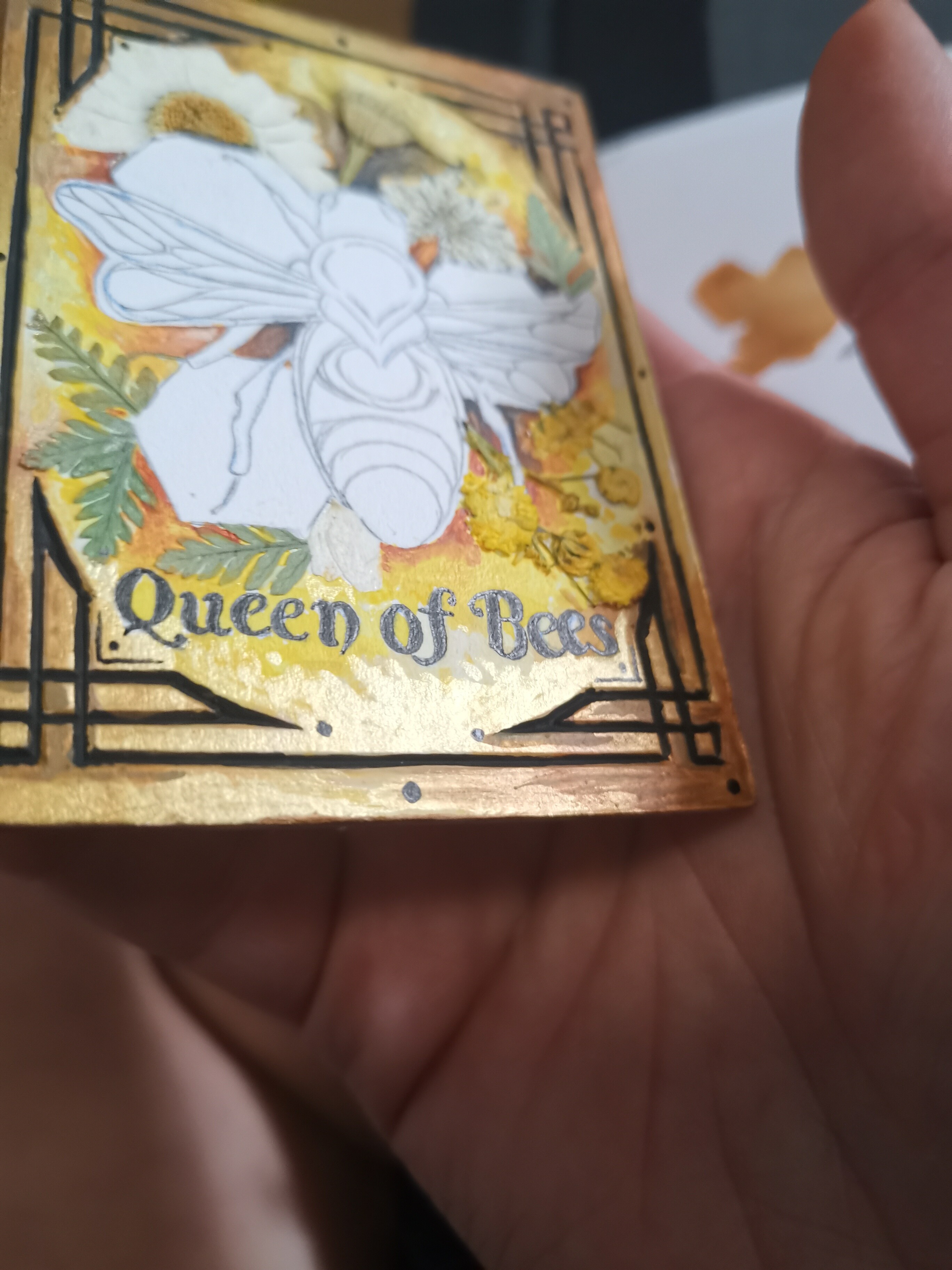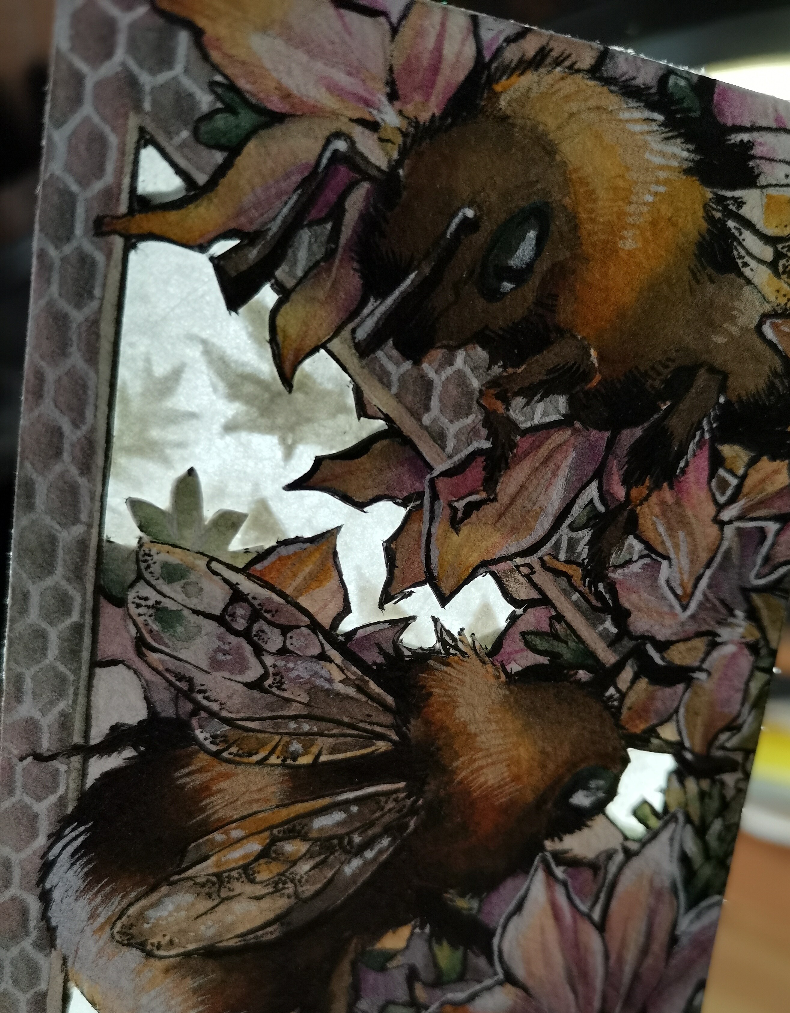 @NadineHArtwork Ist der Rahmen gestanzt? :o Das sieht richtig schick aus! Besonders mit den getrockneten Blüten. <3 Auf die Ausarbeitung der Biene bin ich sehr gespannt!