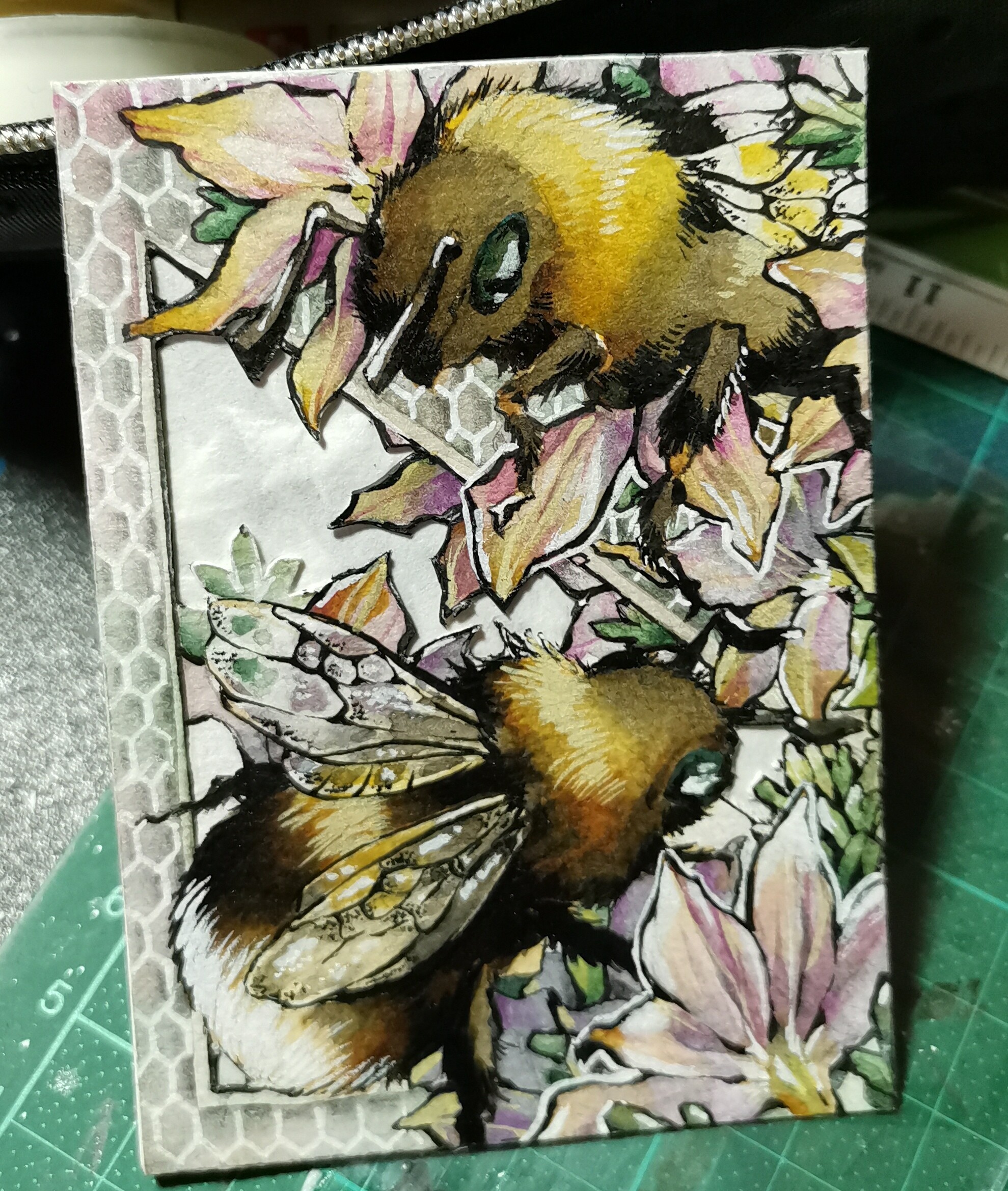 So, meine Hummelkarte ist soweit. (vielleicht nachher noch ein bisschen nachdunkeln bei der Hummel oben, wenn ich bei meiner dritten Karte eh gerade nochmal sepia raushole xD)