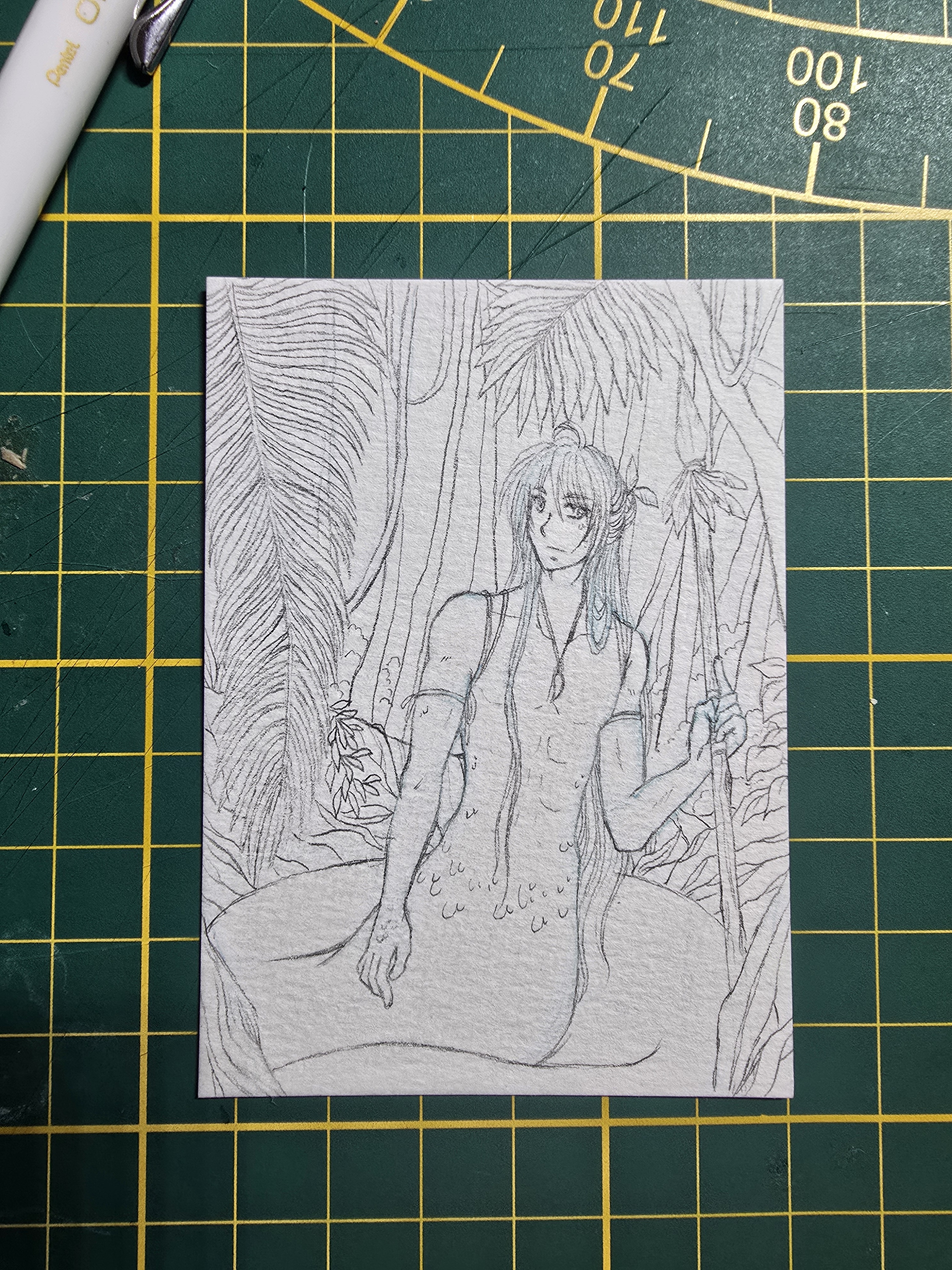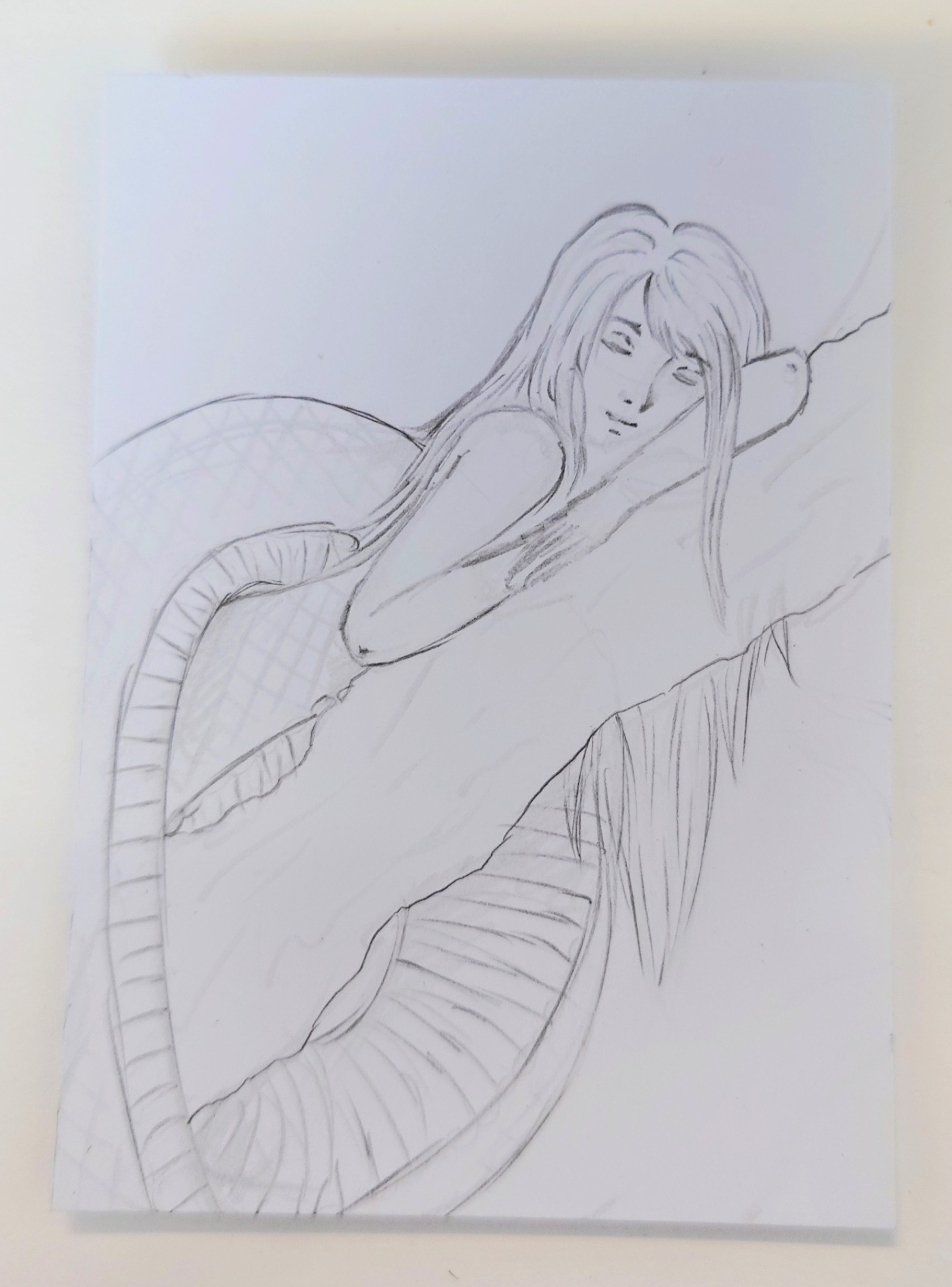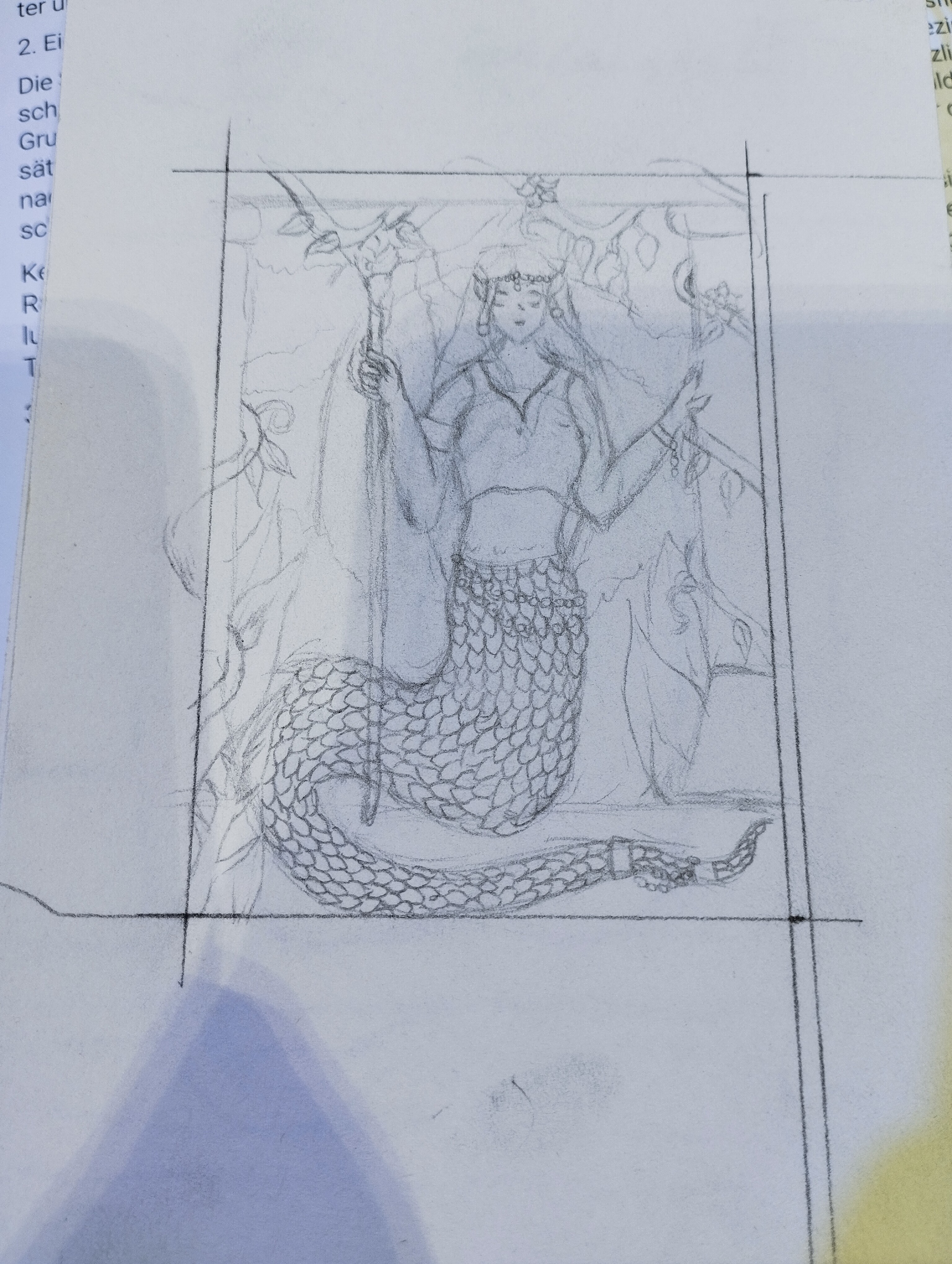 Zu sehen ist eine schlafende Schlangenfrau. Ihr Schwanz ist um sie geschlungen und hält sie am Baum fest. Ich hätte auch gerne noch die Schwanzspitze mit drauf gepackt, aber das sah immer so angespannt aus. Die Karte soll Ruhe und Gelassenheit ausstrahlen, aber trotzdem wollte ich ein spannendes Motiv. Hintergrund wird vermutlich Dschungel werden und ich möchte eine Nachtstimmung zeichnen, ich hoffe es wird nicht zu düster…