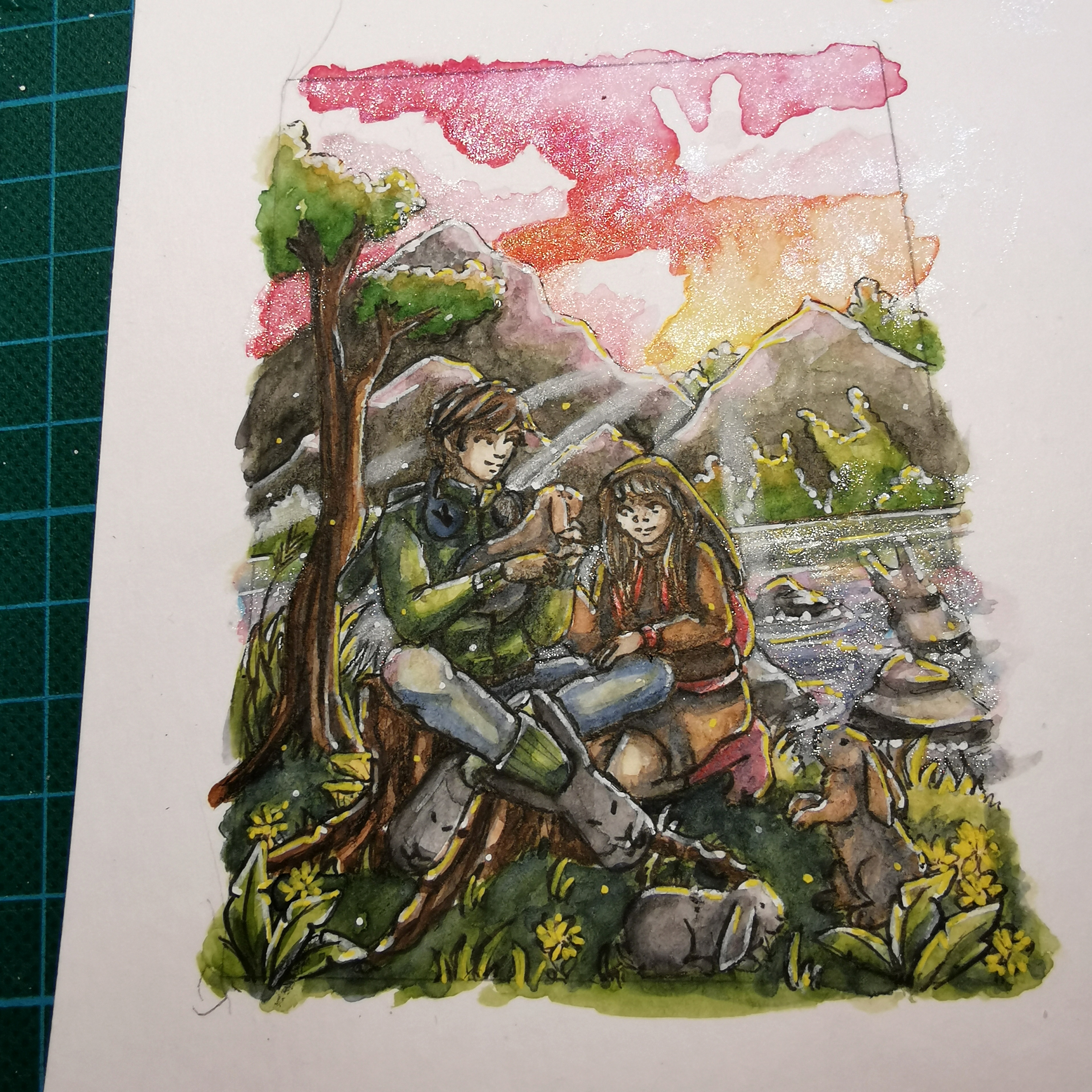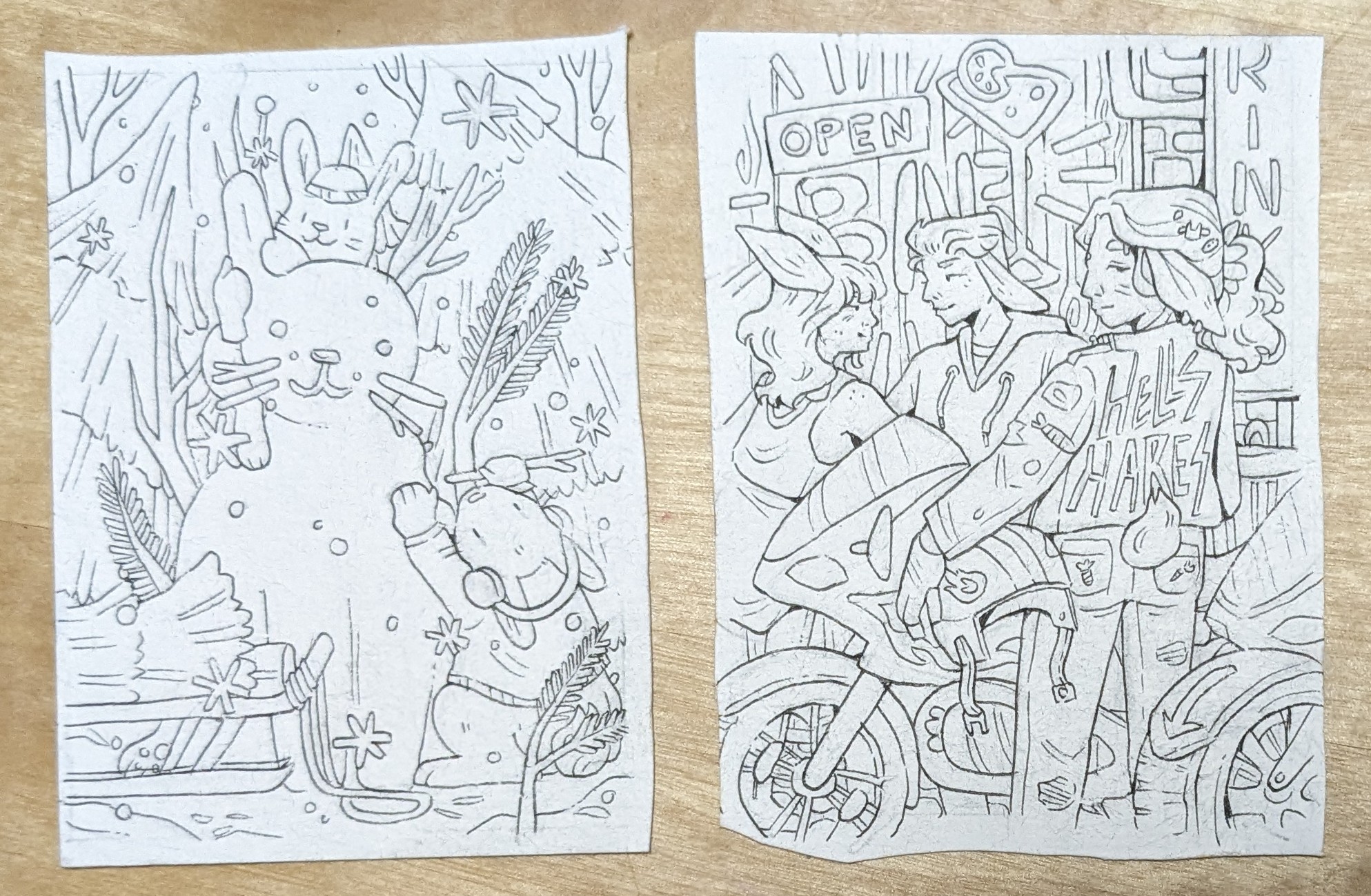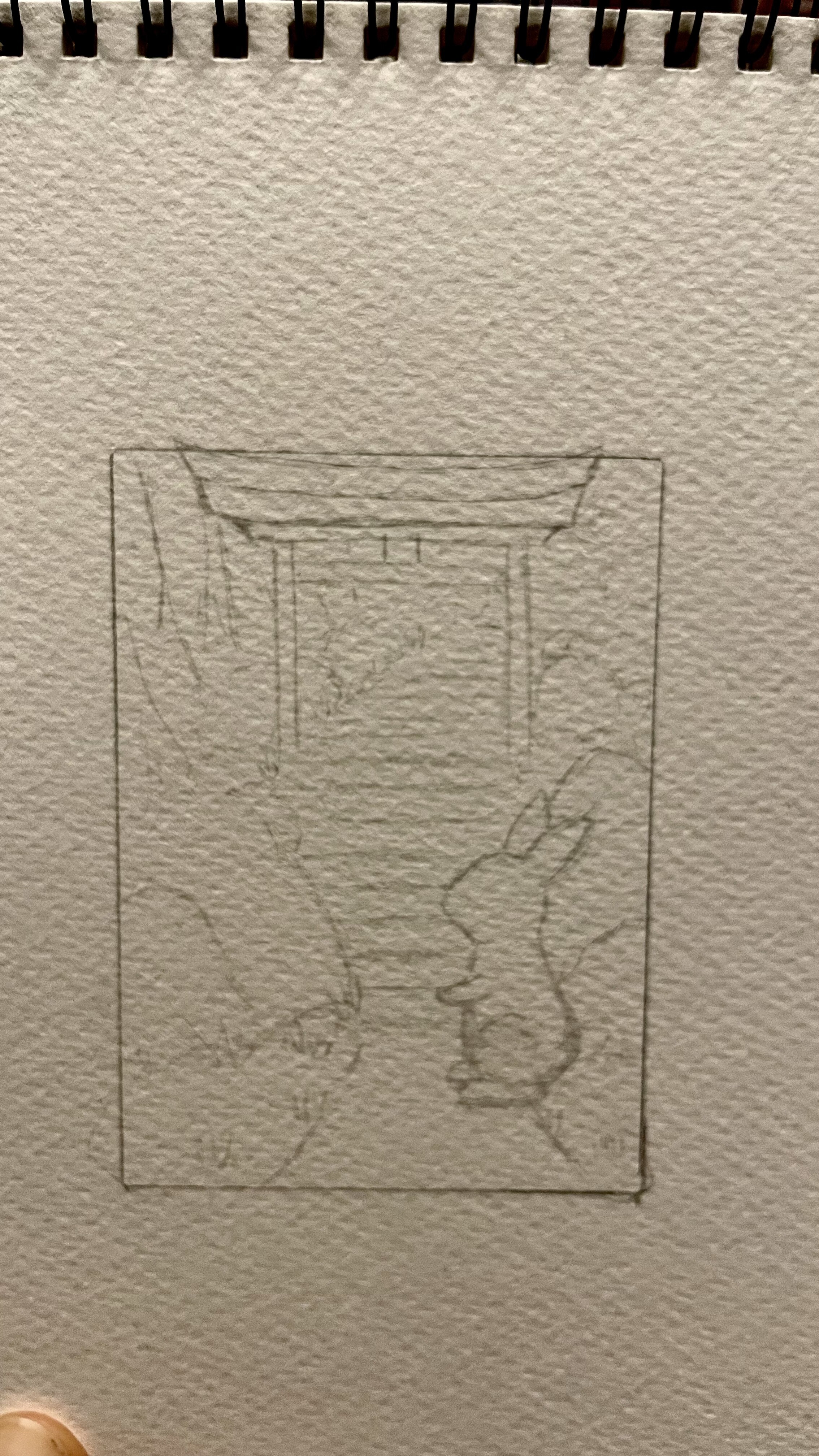Ich hätte nun auch eine Skizze für mein zweites Kärtchen soweit. Wsl erkennt man es nicht so gut. Meine Idee ist ein Häschen vor einer Treppe zu einem Torii Tor und Natur im Hintergrund :)
