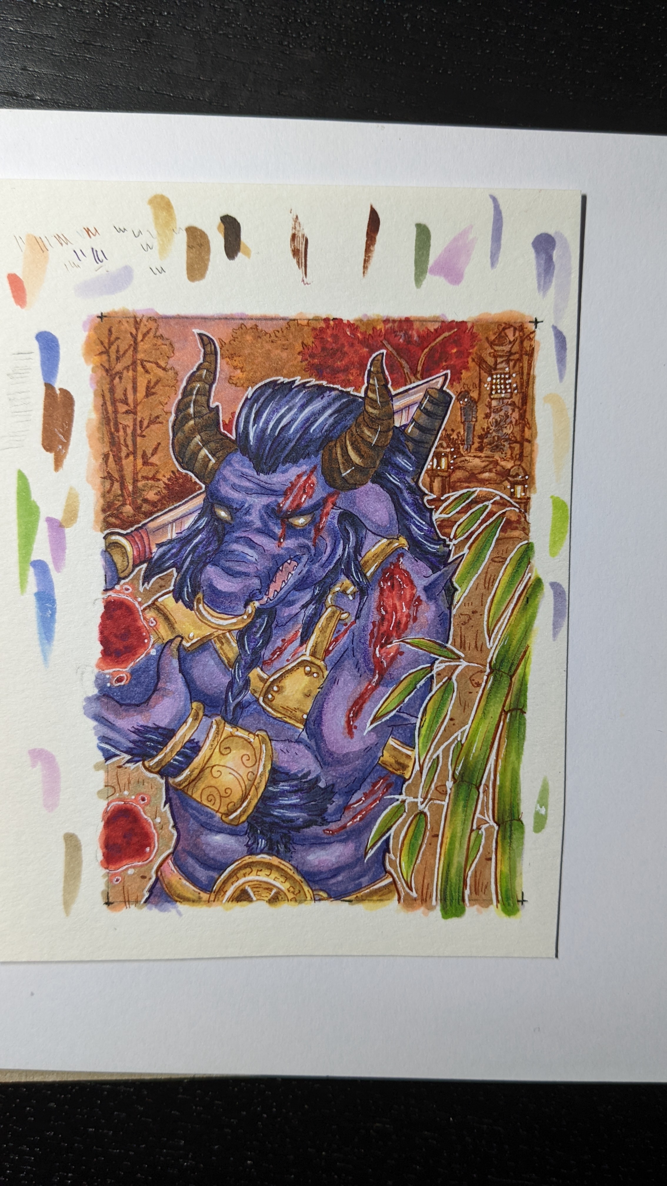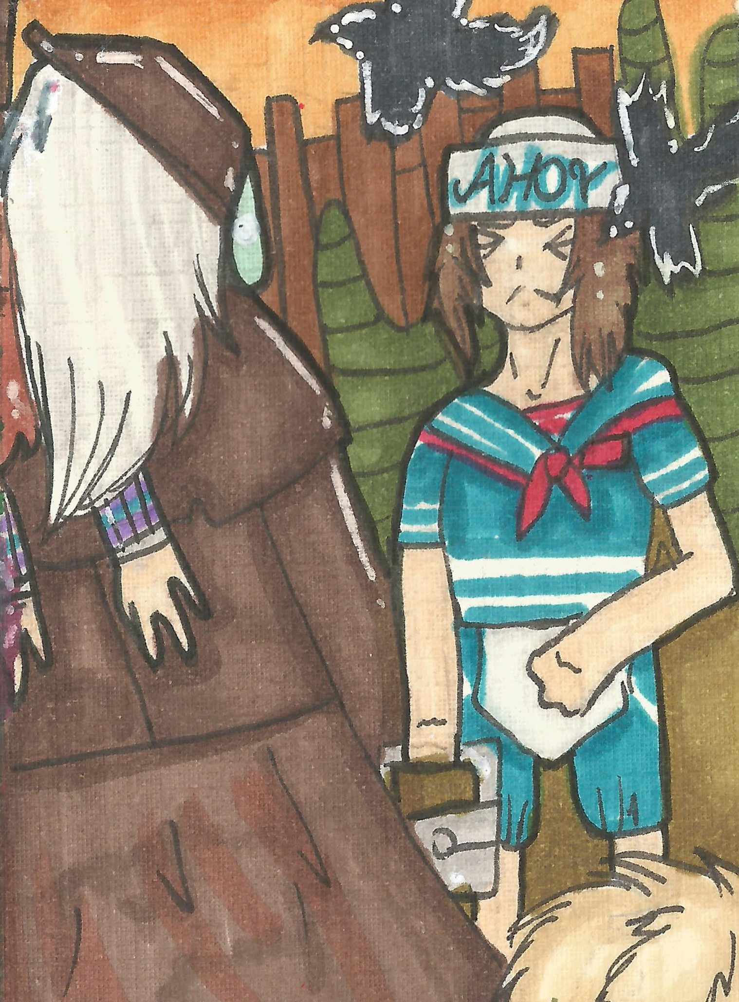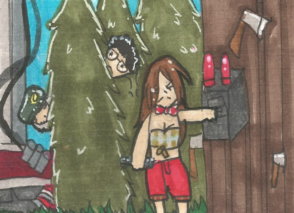 Einmal meine angekündigte Karte mit Legion (die Frenzy-Fenster-Vault-Bewegung macht mich noch fertig, ich hoffe, man erkennts trotzdem. bei der Reinzeichnung werde ich nochmal genauer arbeiten) und Nea im Graffiti-Outfit, die gerade beim Hex-Totem cleansing gestört wird.
