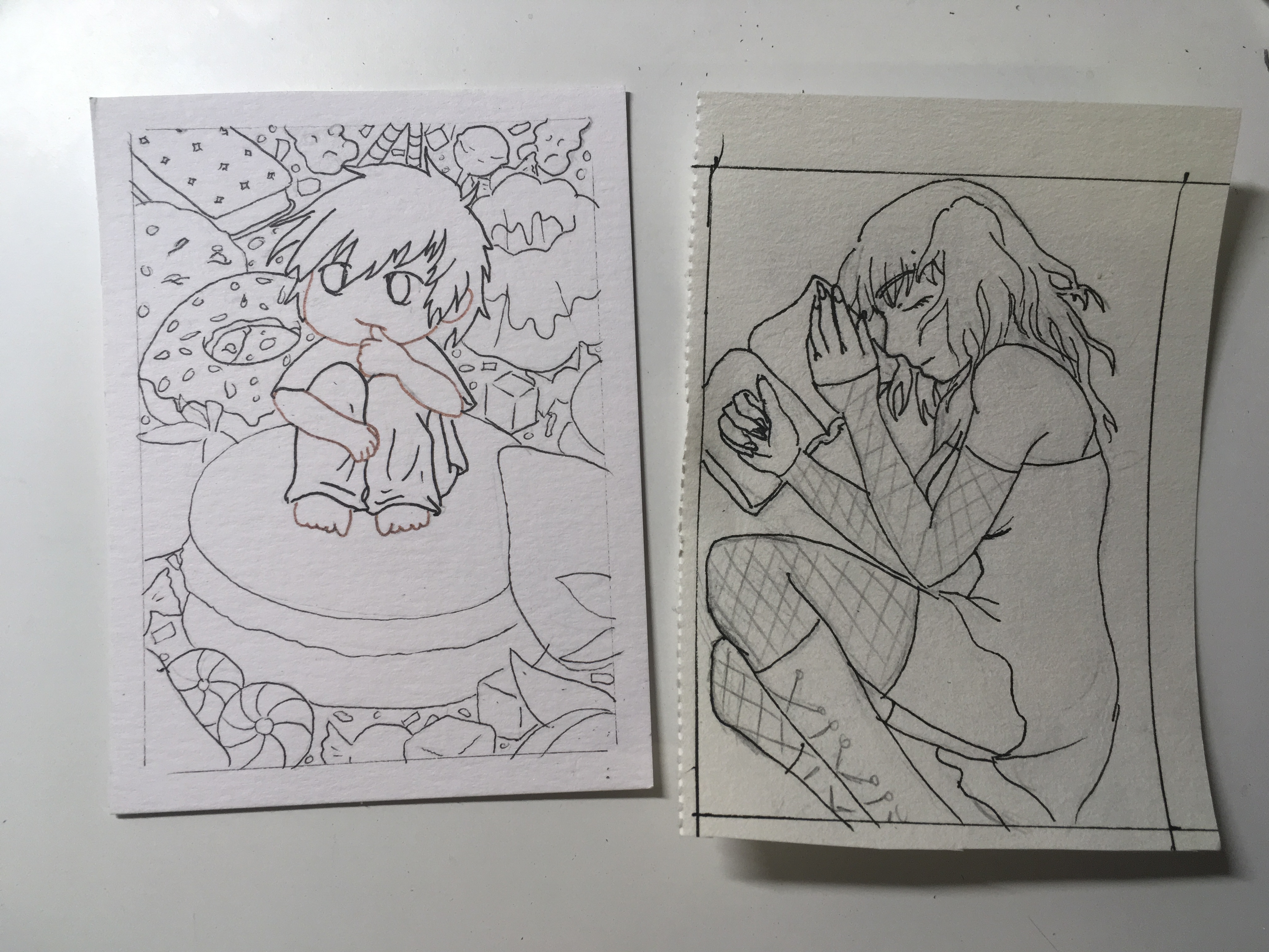 Hab mal mit den Skizzen angefangen und aufs Aquarellpapier übertragen. Hoffe das ist soweit ok. :D