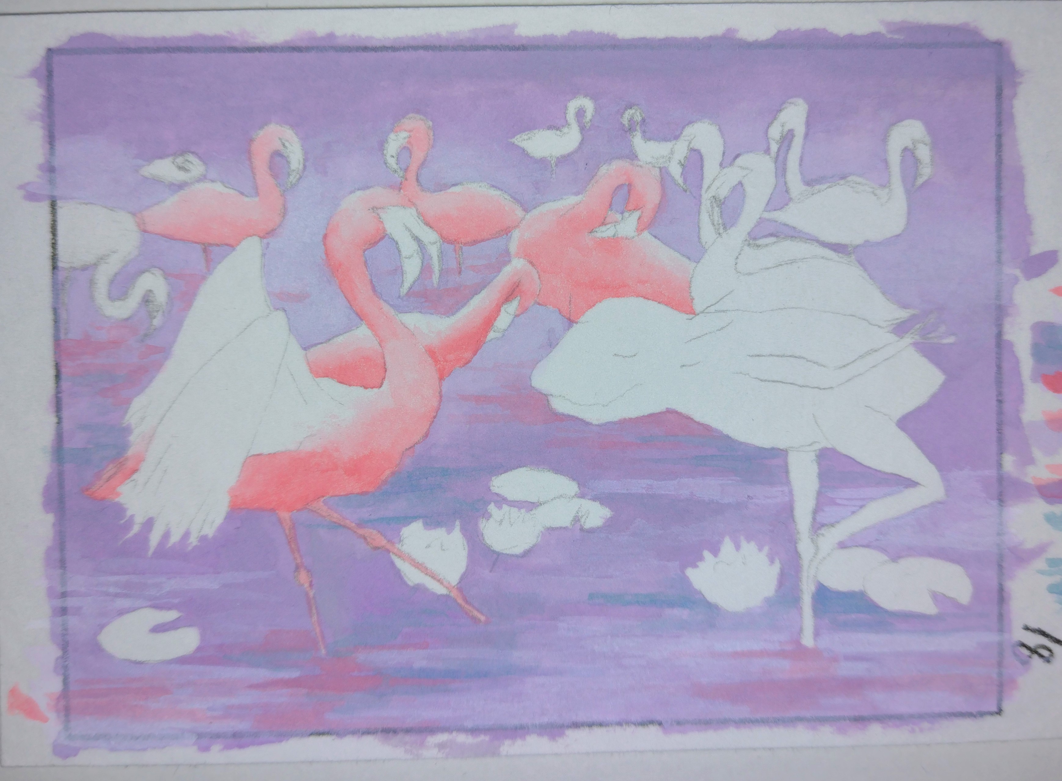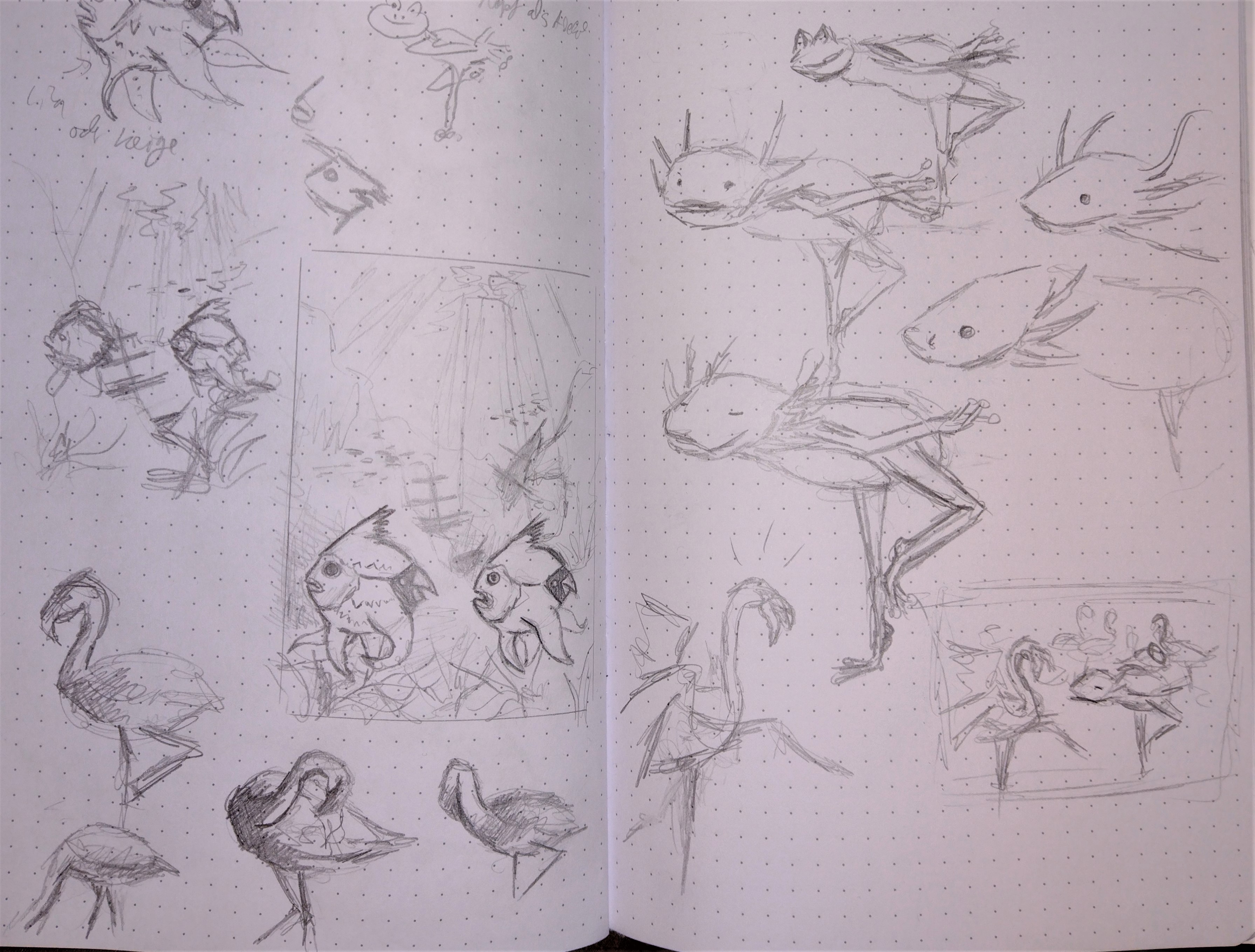 Wie angekündigt habe ich einen Frosch mit einem Axelot gemischt und ihn in eine Flamingopose gebracht. Daneben steht ein offensichtlich schockierter echter Flamingo und in den Hintergrund soll ein ganzer Schwarm gemütlich dastehender Flamingos. Aktuell plane ich, den Pseudo-Flamingo genauso Rosa wie die echten Flamingos zu halten, aber so ganz sicher bin ich mir damit nicht. Man könnte ihm ja auch Froschgrün geben, damit er nochmal mehr hervorsticht