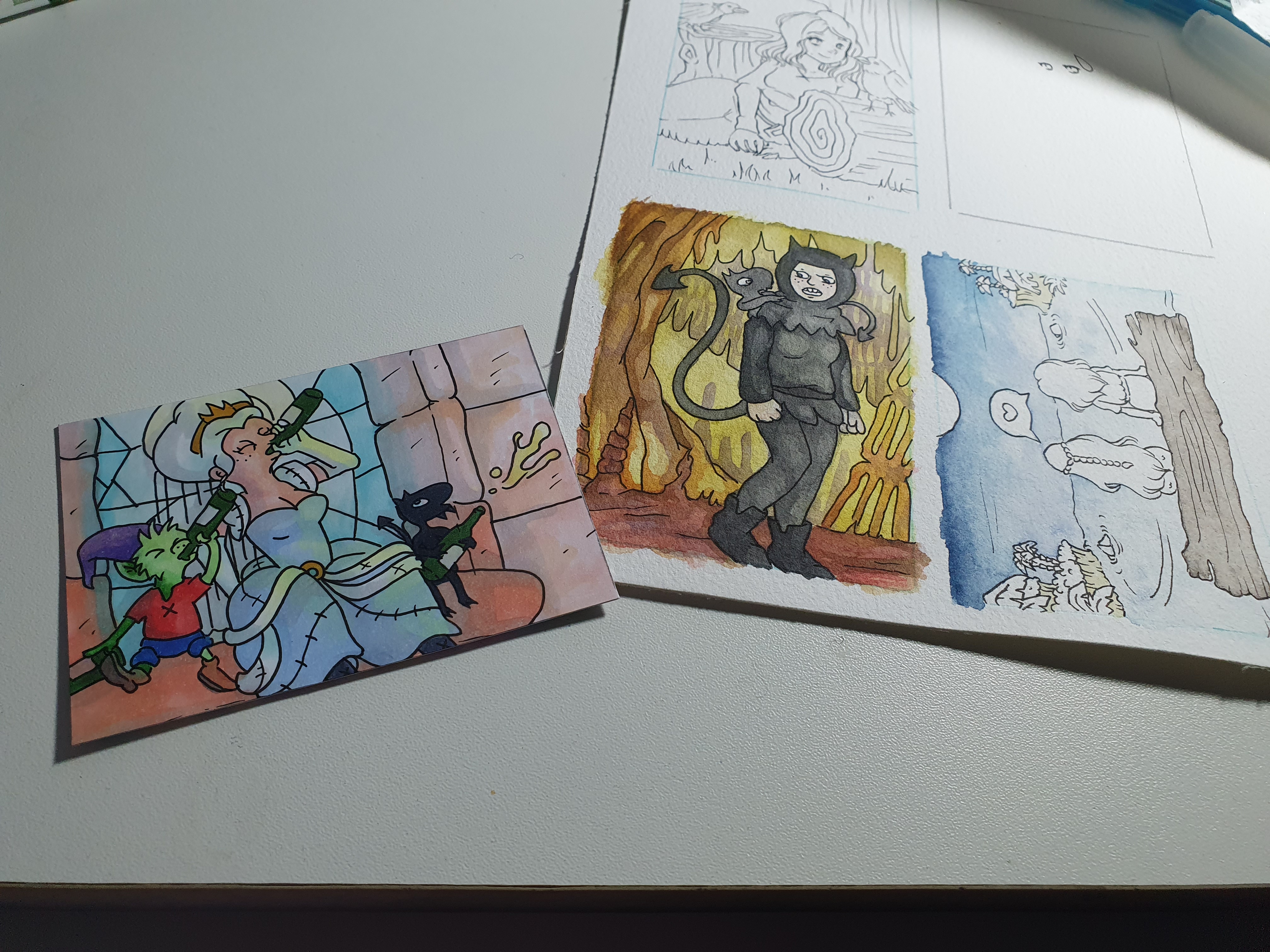 Ich will mich nicht rausreden, aber es hat auch viel mit der Papierstruktur bei der Mora-Karte zumindest (wegen den weißen Flächen zum Beispiel, weil ich gerne Papier mit Struktur nutze). Womöglich war es nicht das Beste Papier für Wasserfarben was dann natürlich meine Schuld ist, aber ich habe beide Karten überarbeitet: