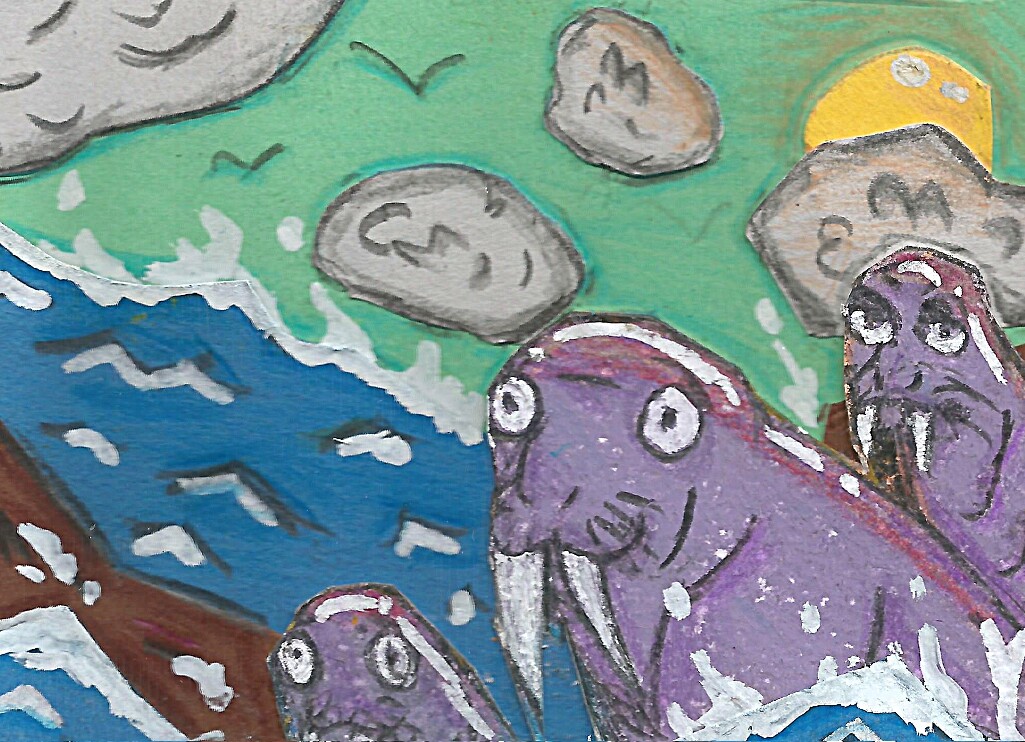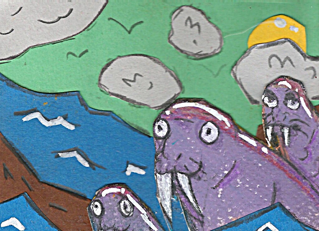 Hihi, die Walrösser sind ja cool :D Ich finde, die sind dir richtig gut gelungen^^ Mich irritiert nur, dass der Himmel grün ist ':) An manchen stellen hast du ja auch ein bisschen mit blau nachgearbeitet (unter den Vögeln und um die Wolken rum). Vielleicht könntest du da noch ein bisschen was rausholen?^^Ansonsten finde ich die Karte echt genial :)