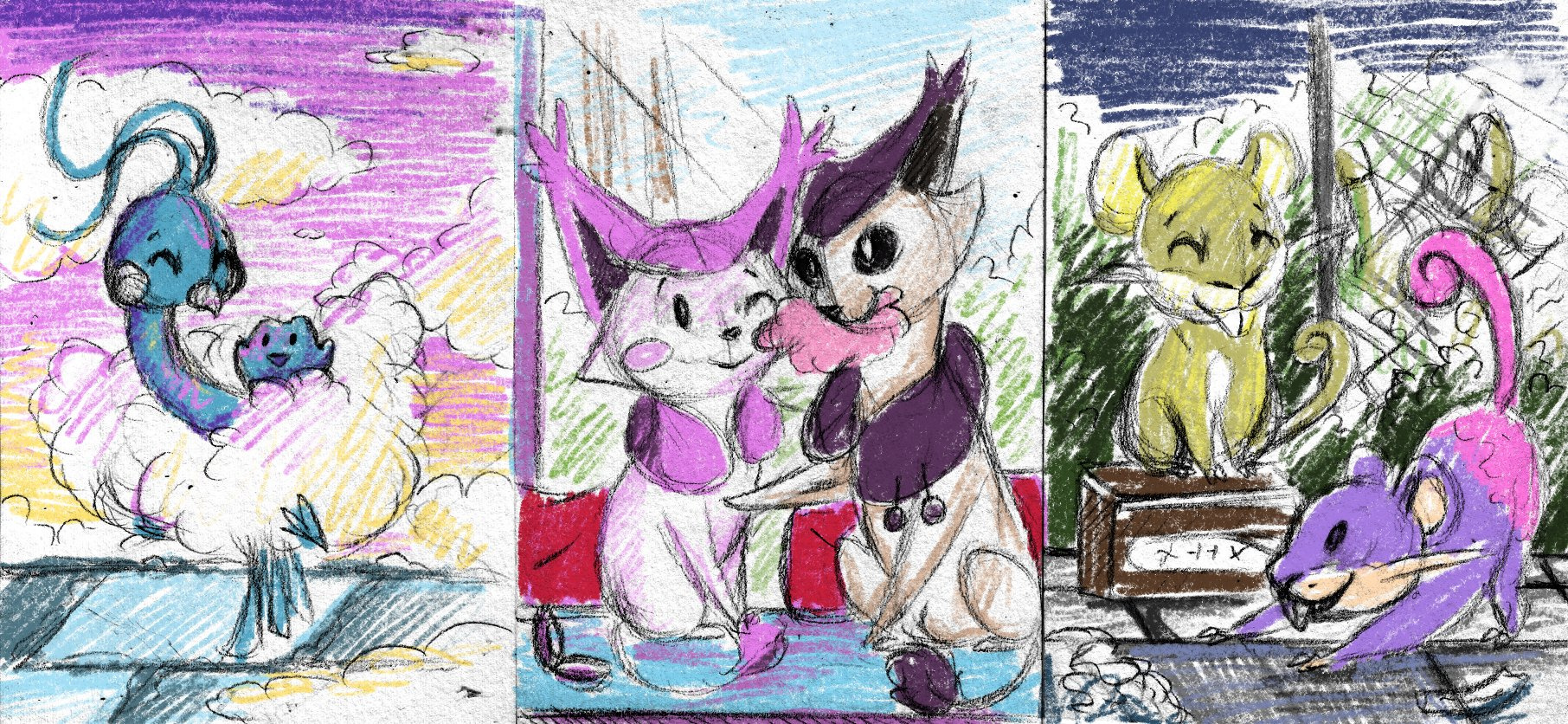 Vielleicht könntest Du den Hintergrund ändern und ihn z.B. dunkler machen (einen Sternenhimmel vielleicht??), Dann würden die beiden Pokemon mehr herausstechen und Du hättest insgesamt weniger gleiche Farbtöne nebeneinander??