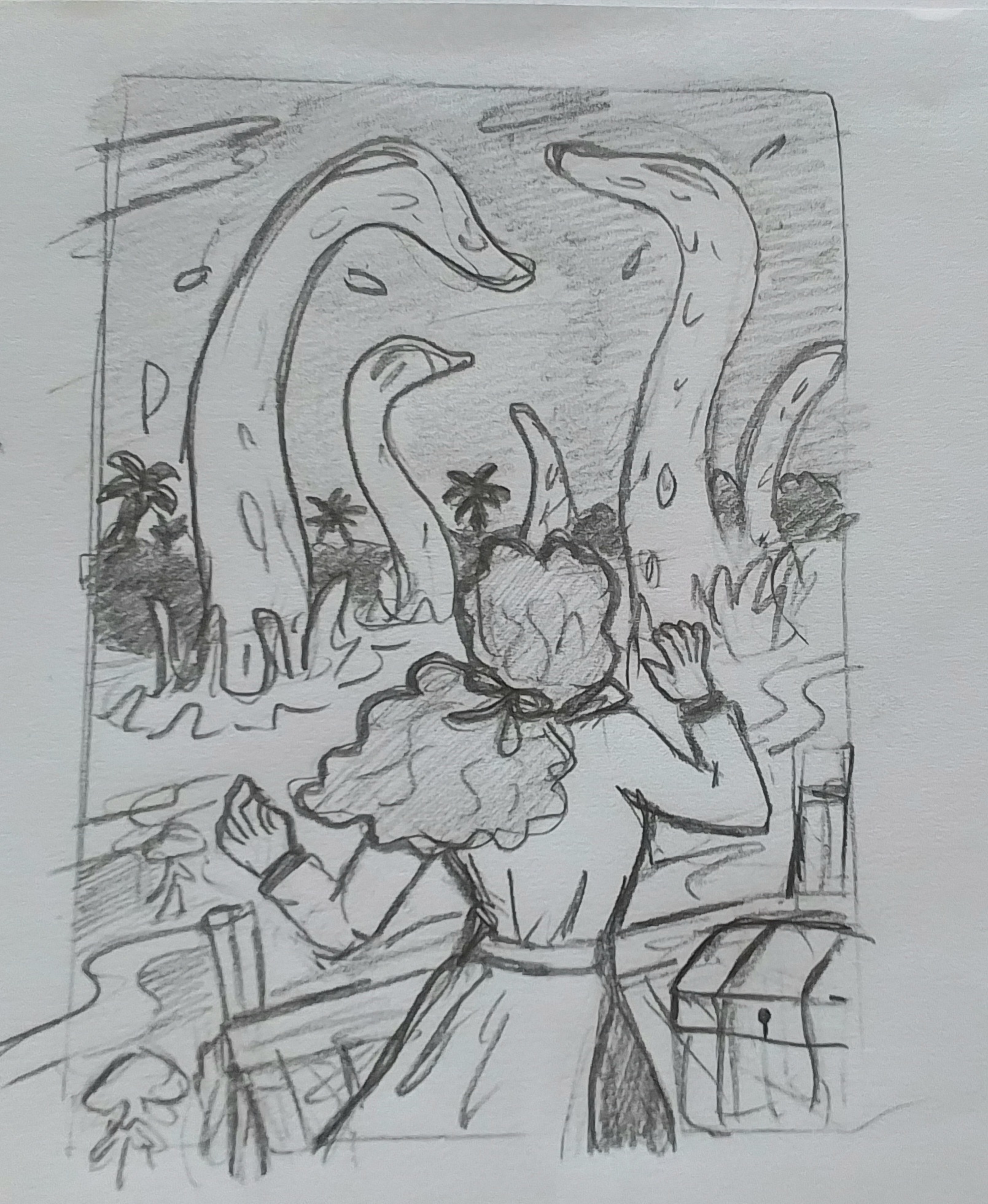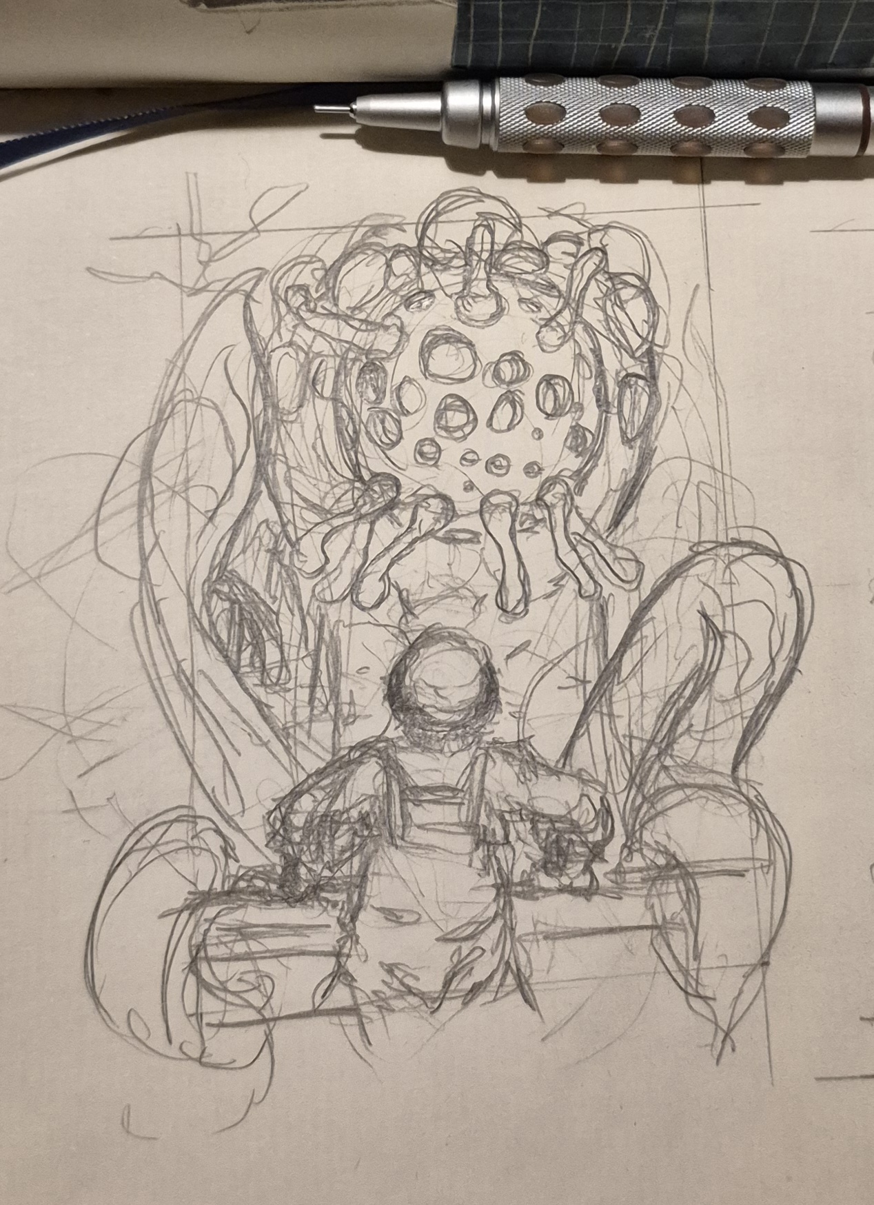 Ich habe eine grobe Skizze gemacht vom Sternenbecken und der Wissenschaftlerin am kleinen Außenposten… Den Ort finde ich so schön und auch so mystisch mit den Tentakeln aus den tiefsten Tiefen.