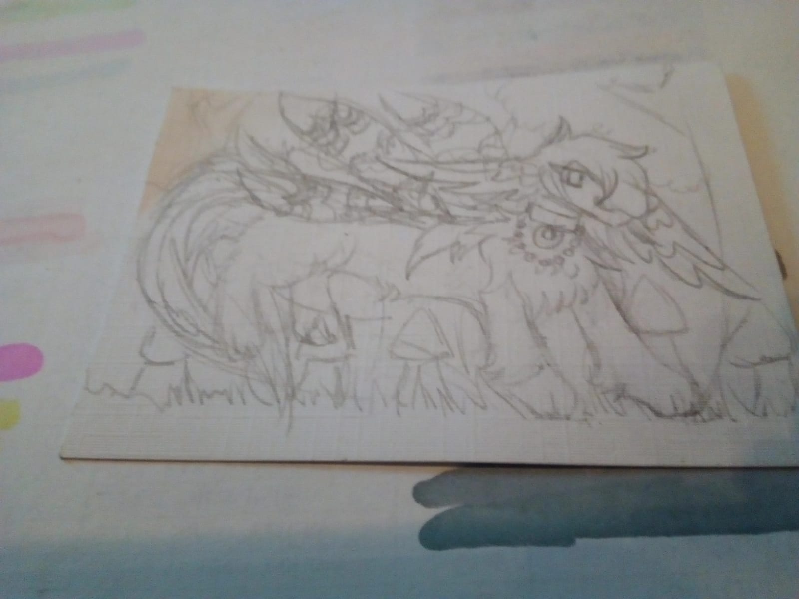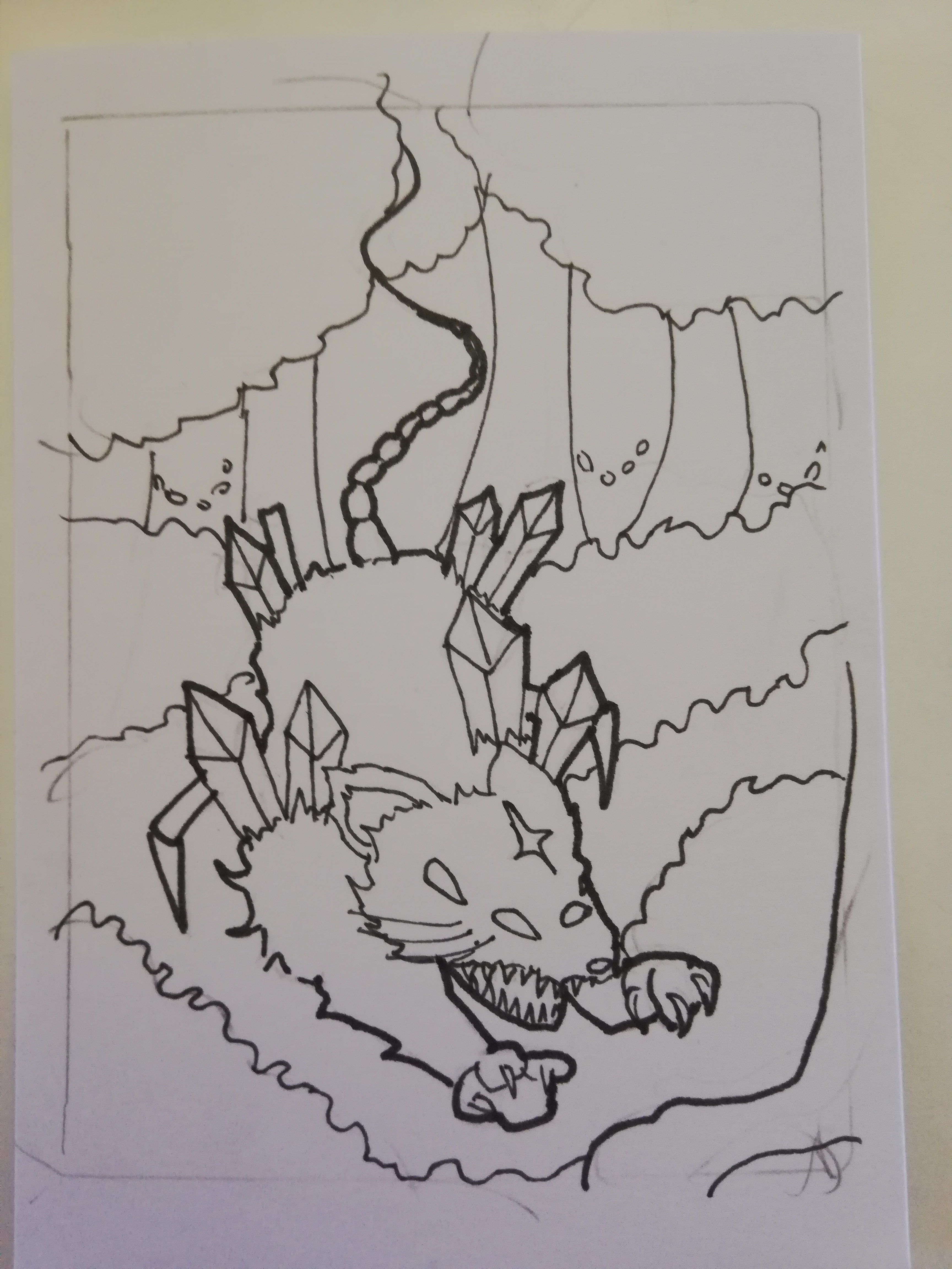 @Kyuuru Wenn Du den Feenhund zeichnest, zeichne ihn bitte etwas kleiner und in eine vielleicht für das Wesen spannendere/passendere Pose? Schleicht, frisst, lauert, jault so ein Feenhund? Er nimmt zur Zeit etwas zuviel Platz von der Karte ein und man erkennt leider wenig von seiner Umgebung.