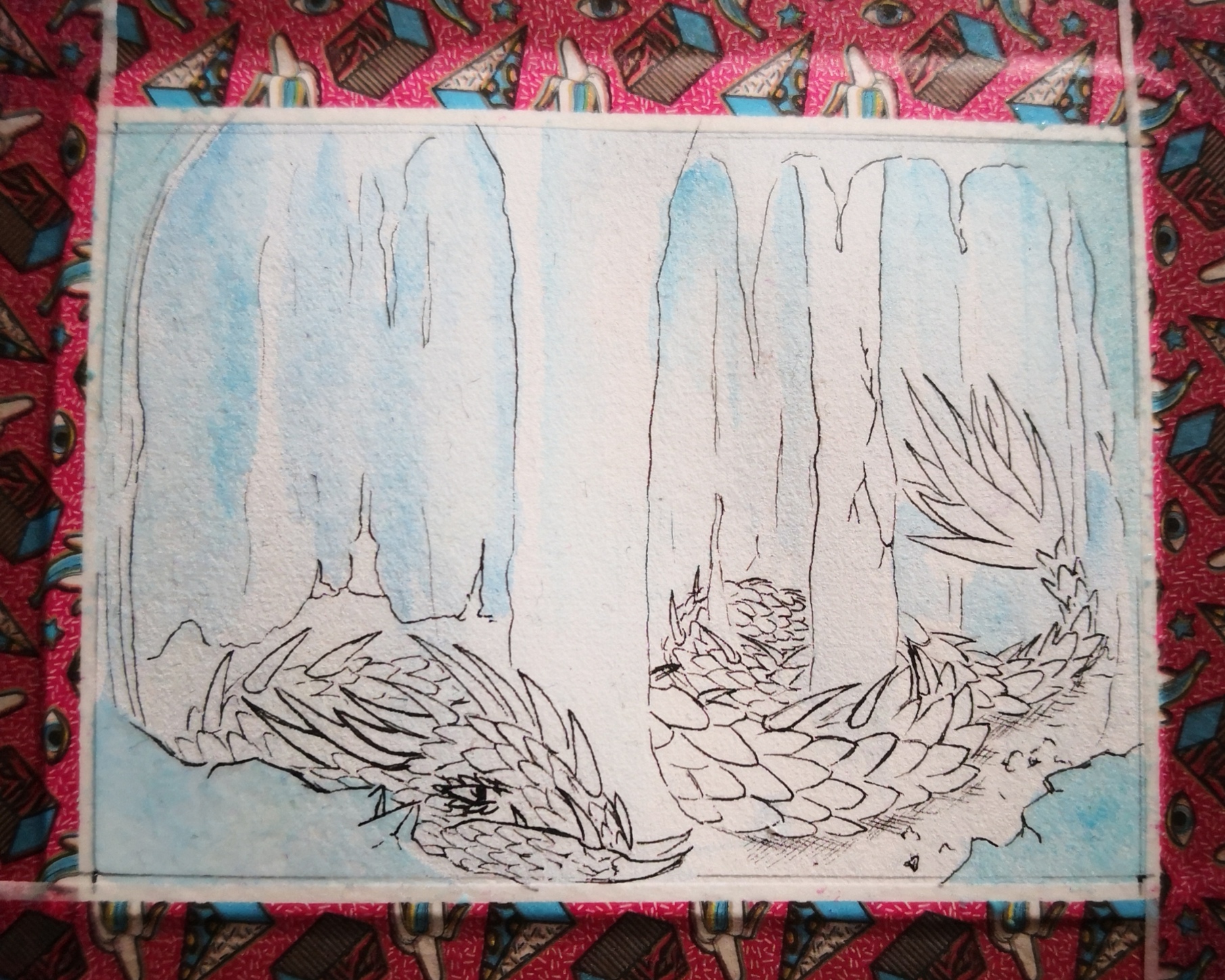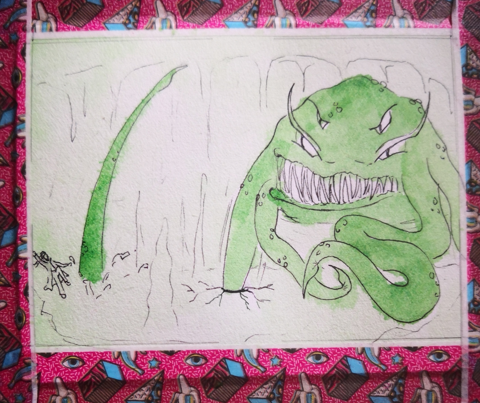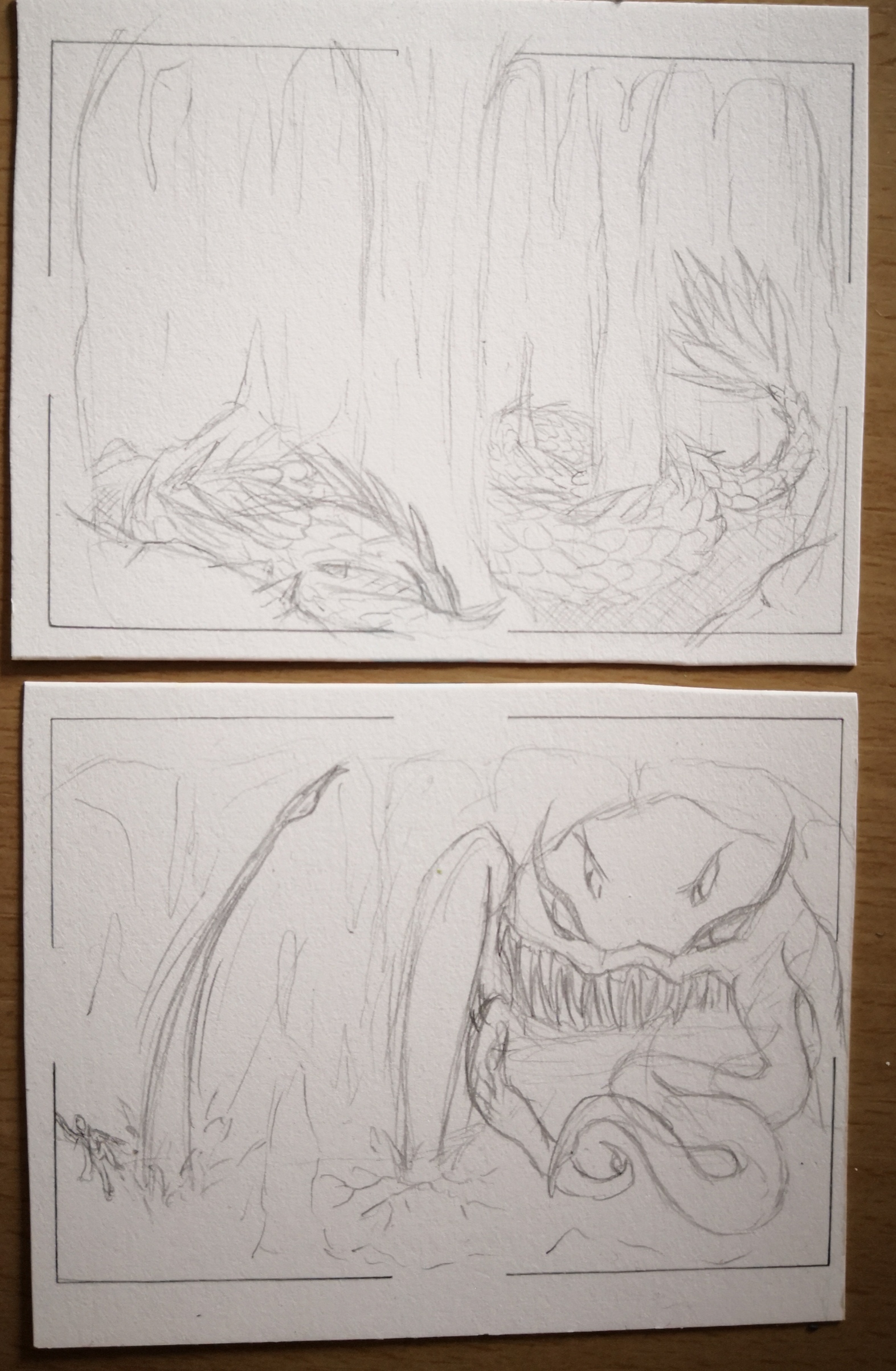 Bei einer weiteren Karte habe ich bereits mein Monster und ungefähre Vorstellungen der Umgebung, aber noch nicht ausgearbeitet. Bei der dritten bin ich allerdings noch etwas ratlos und muss mir dieses Wochenende noch Inspirationen holen (wobei ich schon weiß, in welche Richtung es gehen soll)