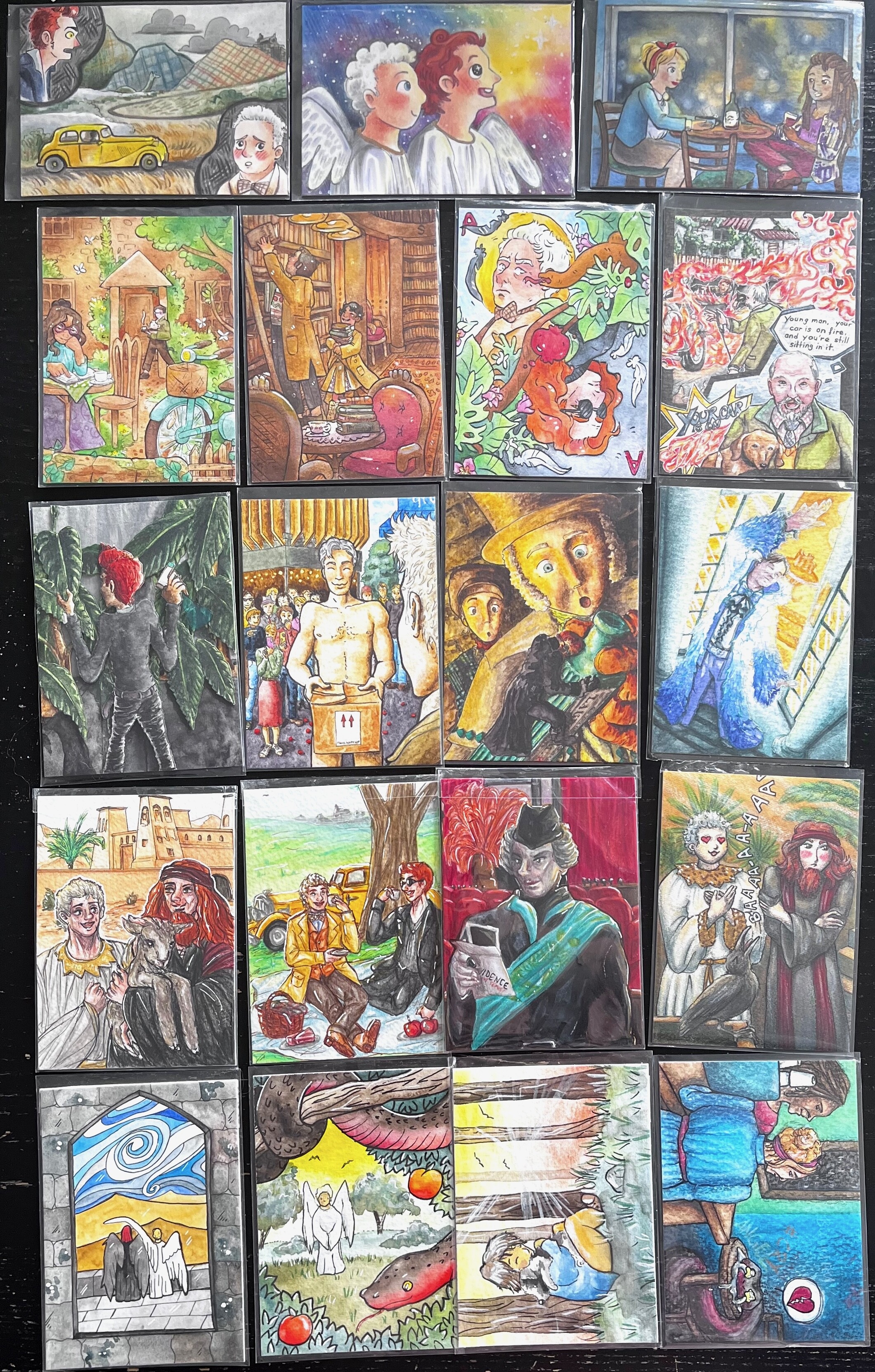 Dabei war das beliebteste Motiv Crowley mit 12 von 19 Karten, dicht gefolgt von Aziraphale mit 10 Karten, danach kommen rote Äpfel mit 3 Karten.