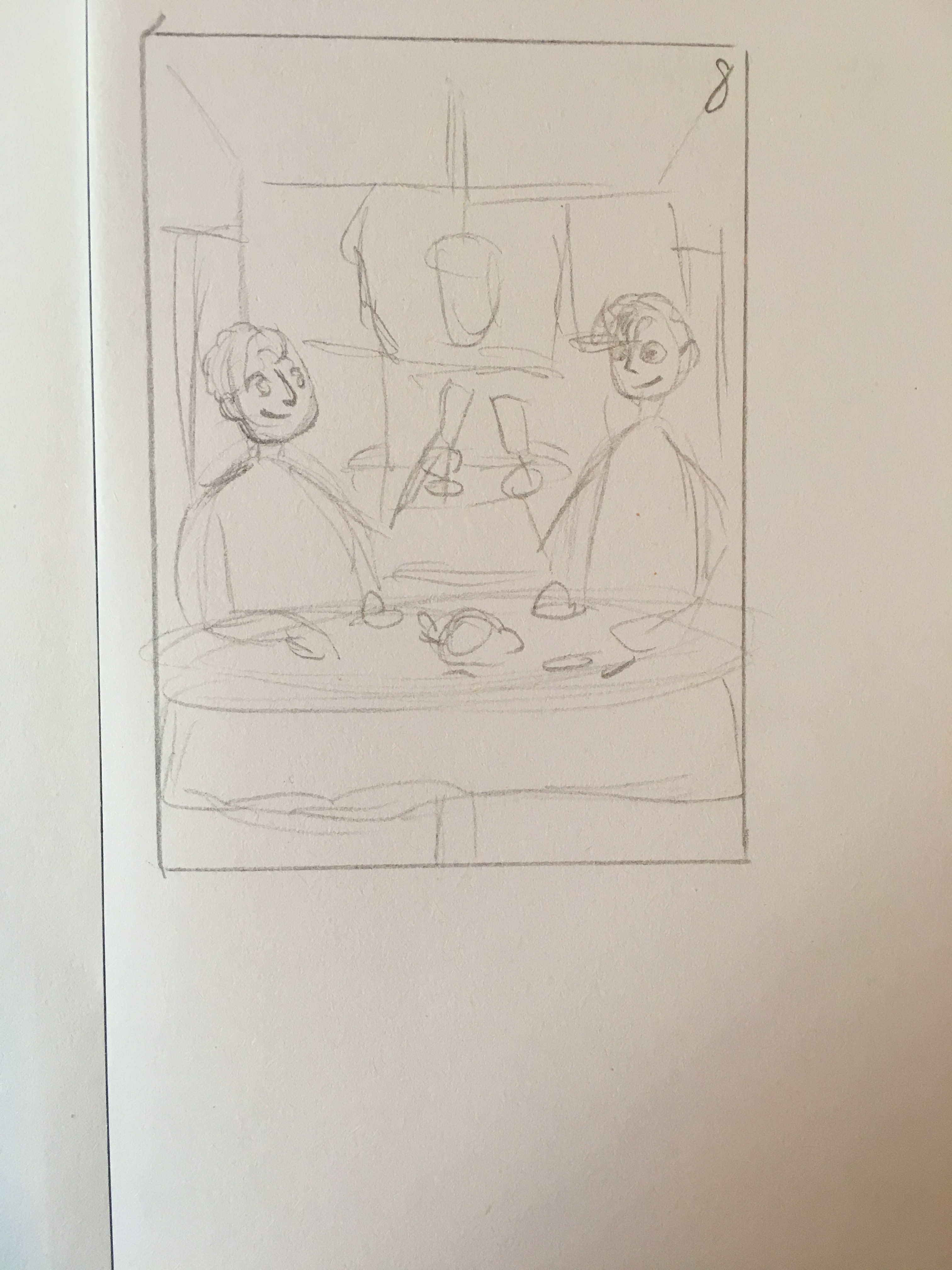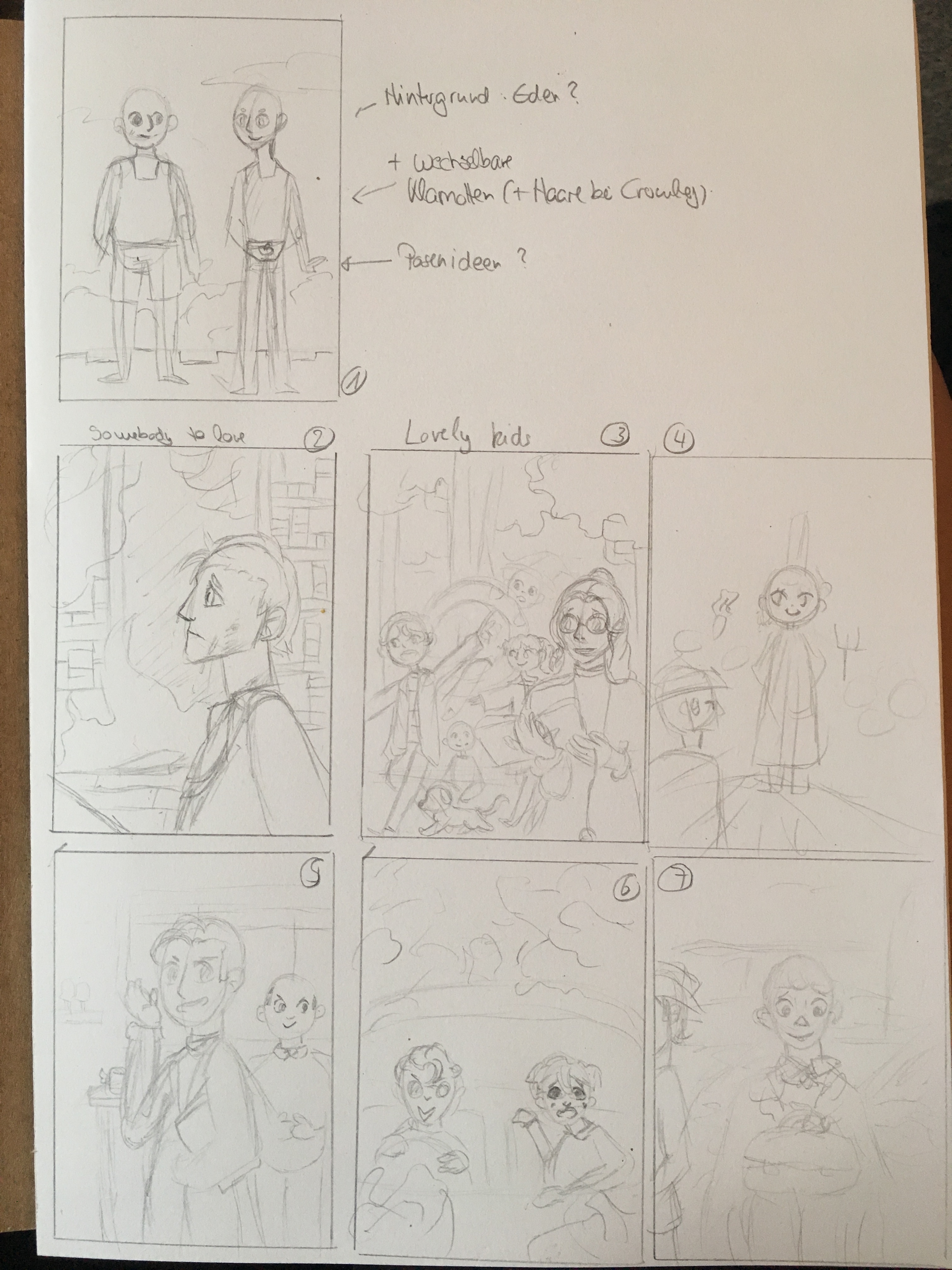 7: sehr grob. Aber als reinskizze würde ich versuchen den Moment einzufangen indem man die pure Liebe für Crowleys Aktion sieht (ihn vielleicht mehr reinrücken. Tutel wäre: Lift Home)