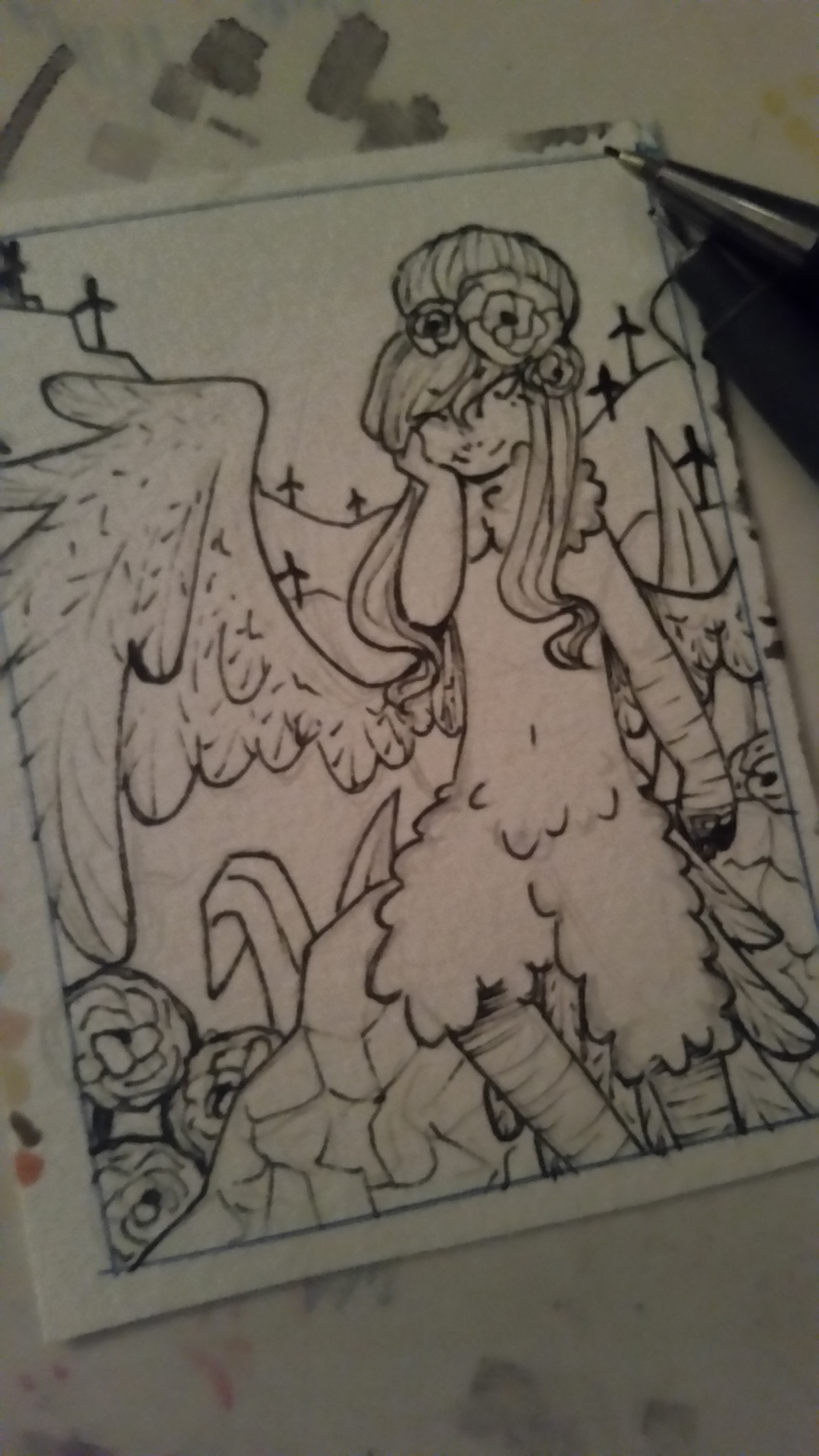 Eine ganz kleine Ergänzung hätte ich noch - ich seh dass du nen sehr freien Stil mit diesem Fleckigen hast und ich finde gerade im Hintergrund kommt das cool, aber auch damit kannst du z.B. klaren Fokus setzen. Ich war mal so frei und hab ganz schnell die unruhigen Stellen noch bisschen übermalt und beim Flügel den Übergang den du angefangen hast deutlicher und mit einen Muster ergänzt, bei den Beinen hab ich den Übergang auch noch etwas weicher gemacht, damit man aber trotzdem noch dass Gescheckerte erkennt. Falls es dir gefällt - magst du die Teile noch bisschen sauberer machen? :)