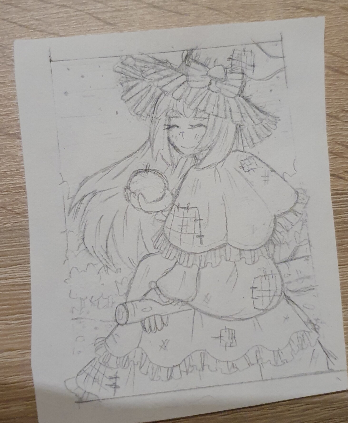 Ich hab hier die Skizze für die zweite Karte. Der Gedanke dahinter ist eine Erntedank Hexe, deren Outfit an eine Vogelscheuche angelehnt ist. Bin mir nicht ganz sicher, ob das zu wild ist für das Thema oder passt?