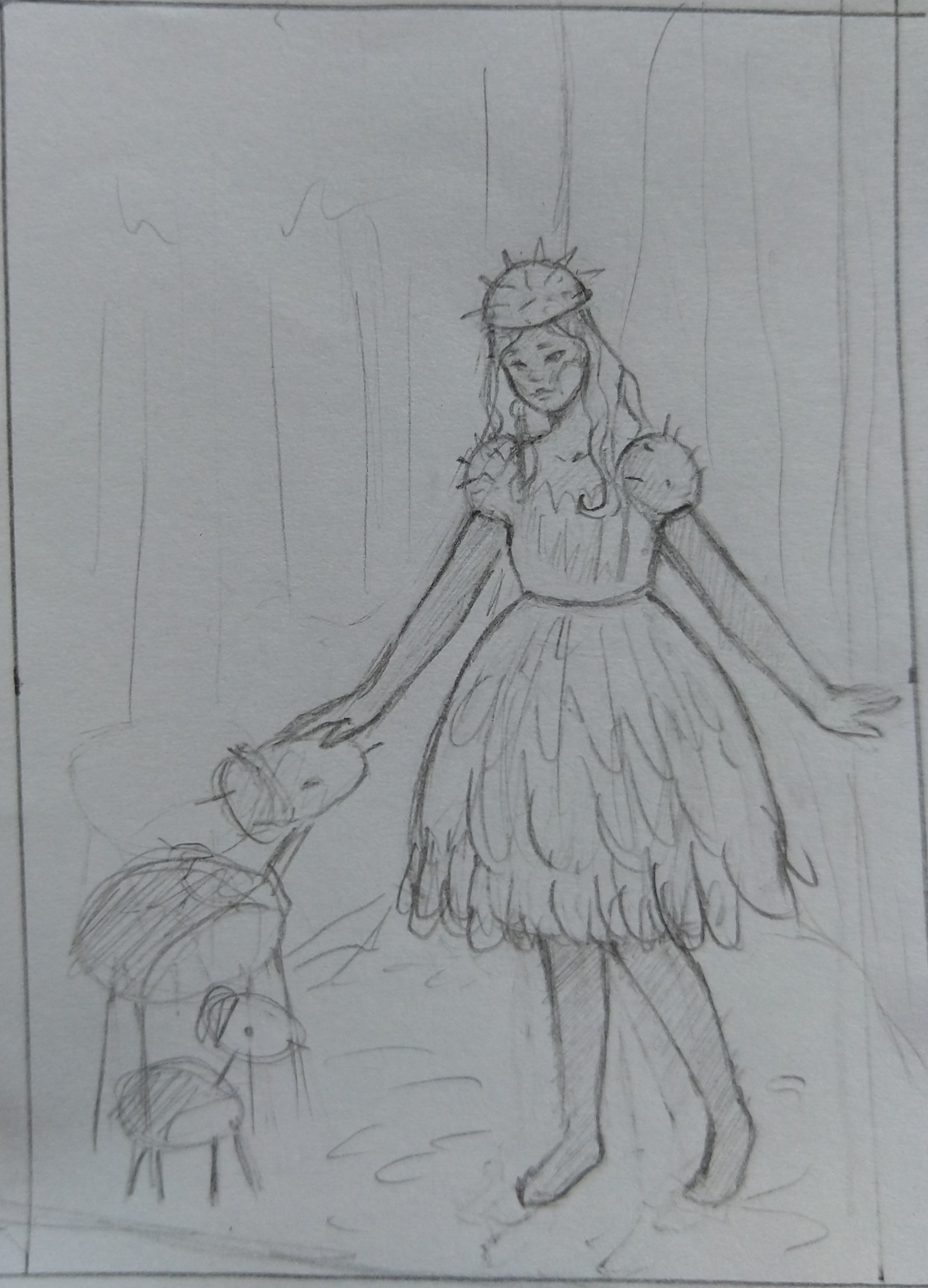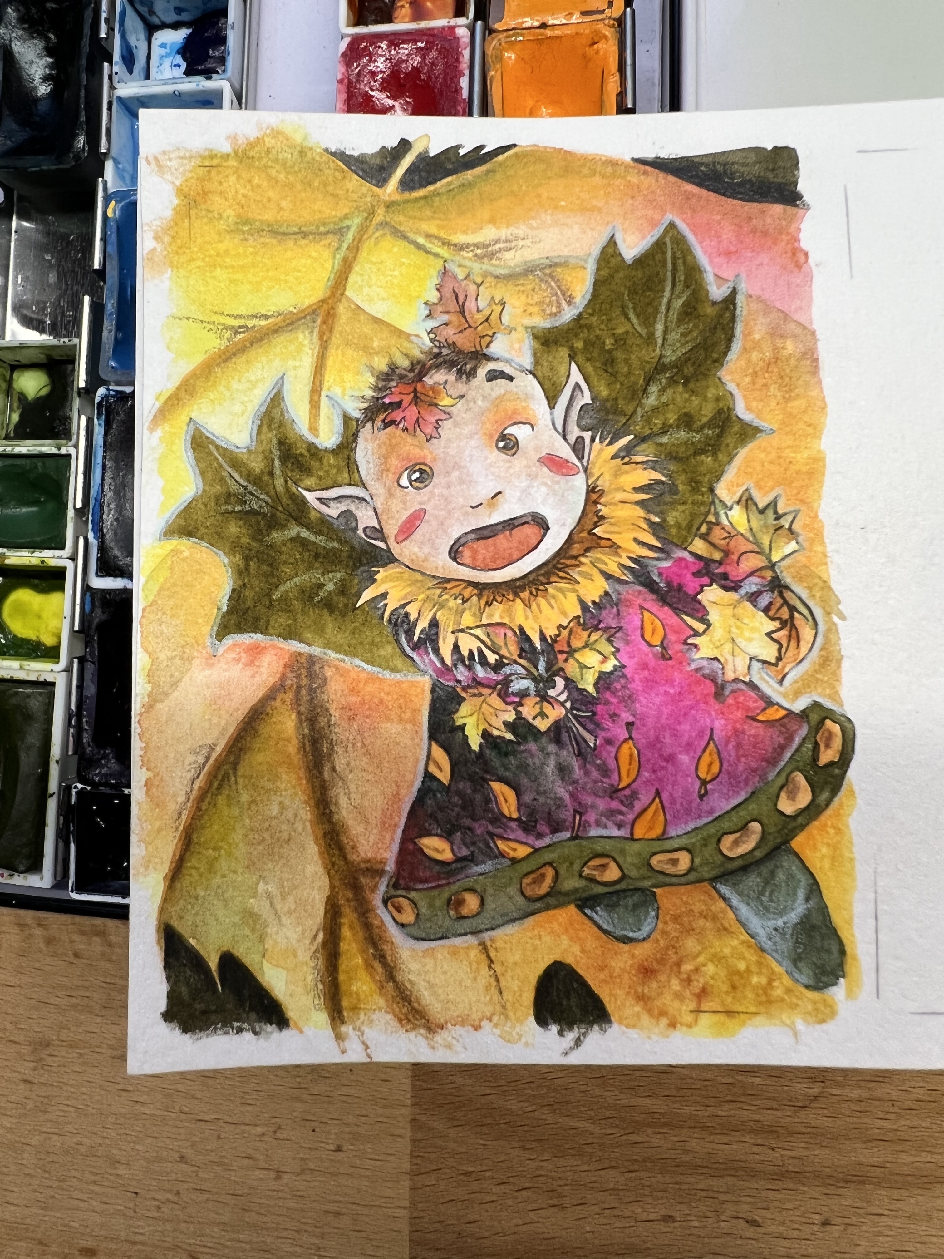 Zu sehen ist ein Herbstelf, und er ist nur so groß wie ein durchschnittlicher Herbstblatt, dass im Hintergrund angedeutet ist. Auf seinen Gewand sollten Herbstblätter und Kastanien sein…