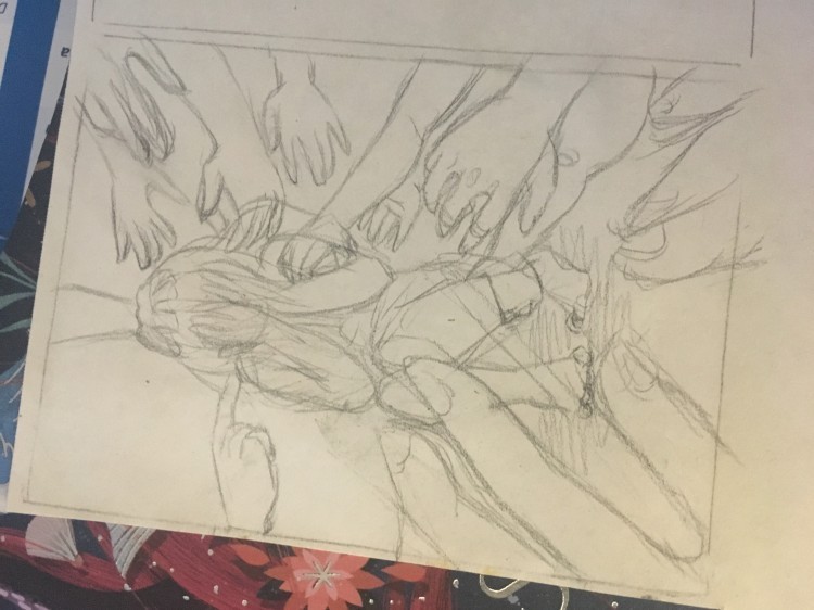Die Skizze die ich bisher gemacht habe zu Posten würde sich noch nicht lohnen weil außer mir da noch keiner was erkennt, aber bei Karte 1: Schlafparalyse ist geplant wie jemand mit vor Angst aufgerissenen Augen im Bett liegt während eine schwarze Gestalt an ihrem Bett steht.