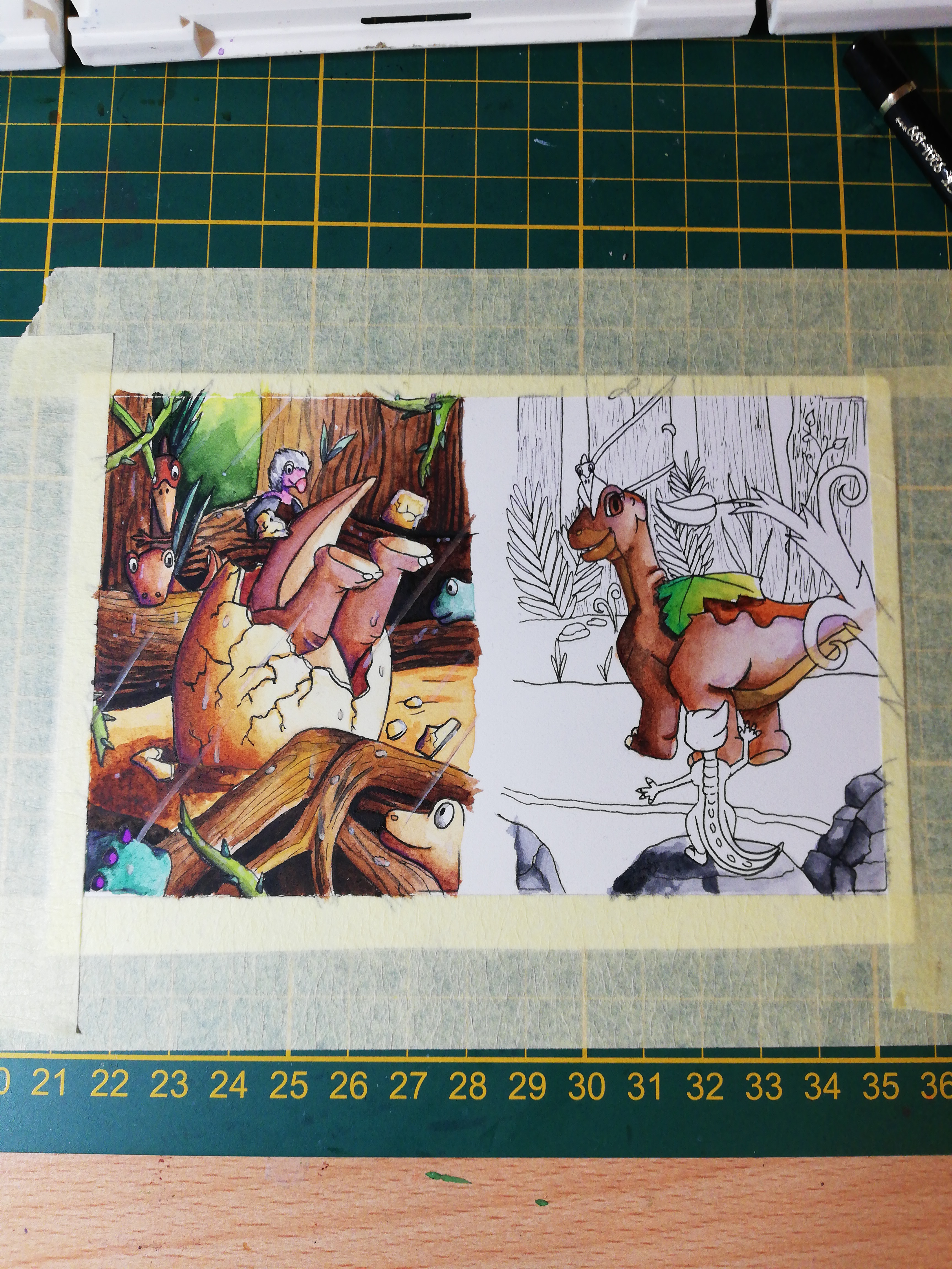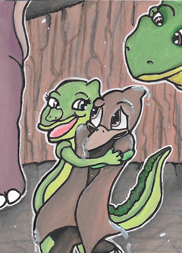 Spike mit ducky und der mama von ducky würde ich zeichnen - klar ich kann ihn realistisch machen wenn ihr das wollt. also n dino dino aber is das dann noch in einem land vor unserer zeit?