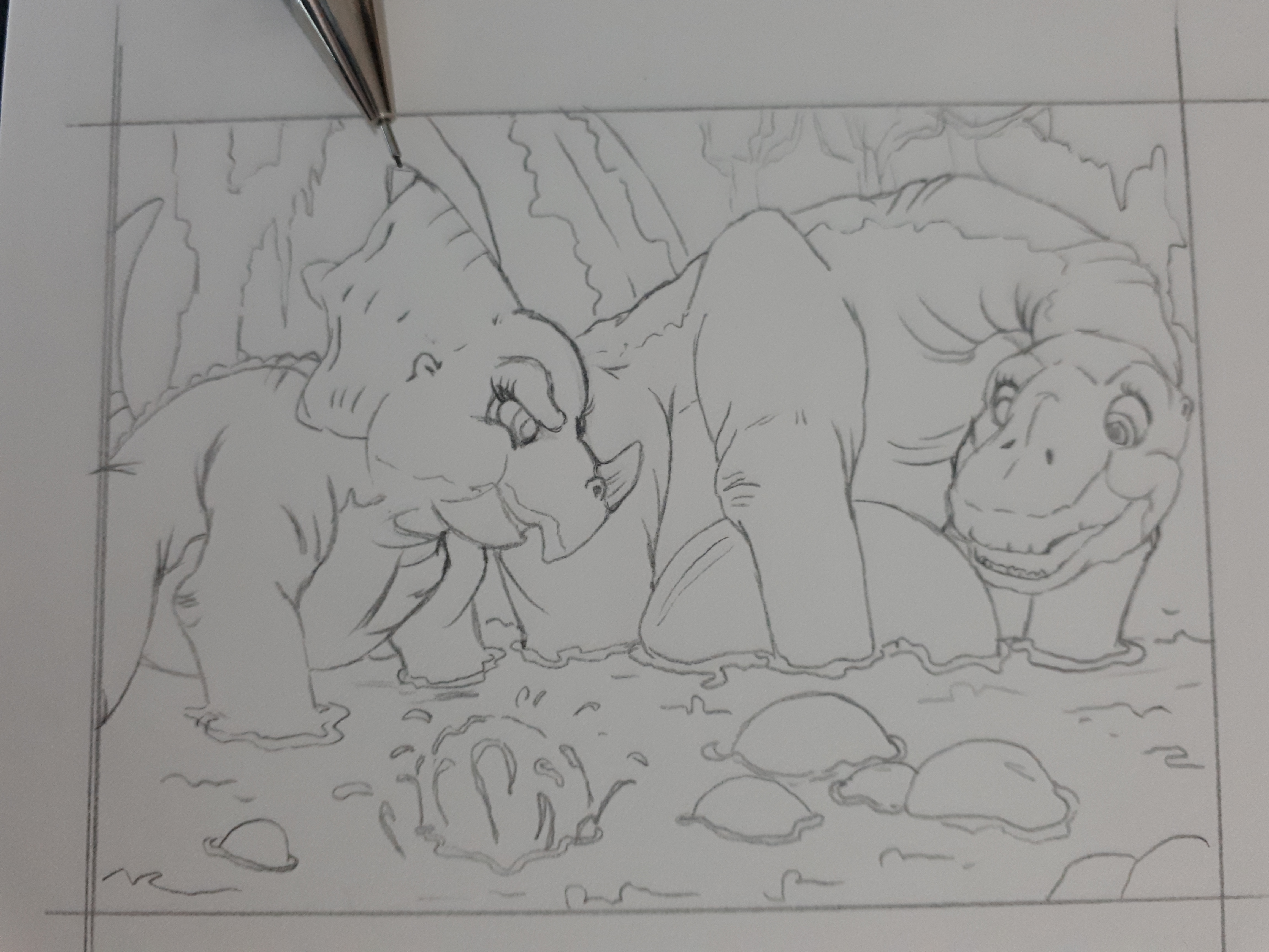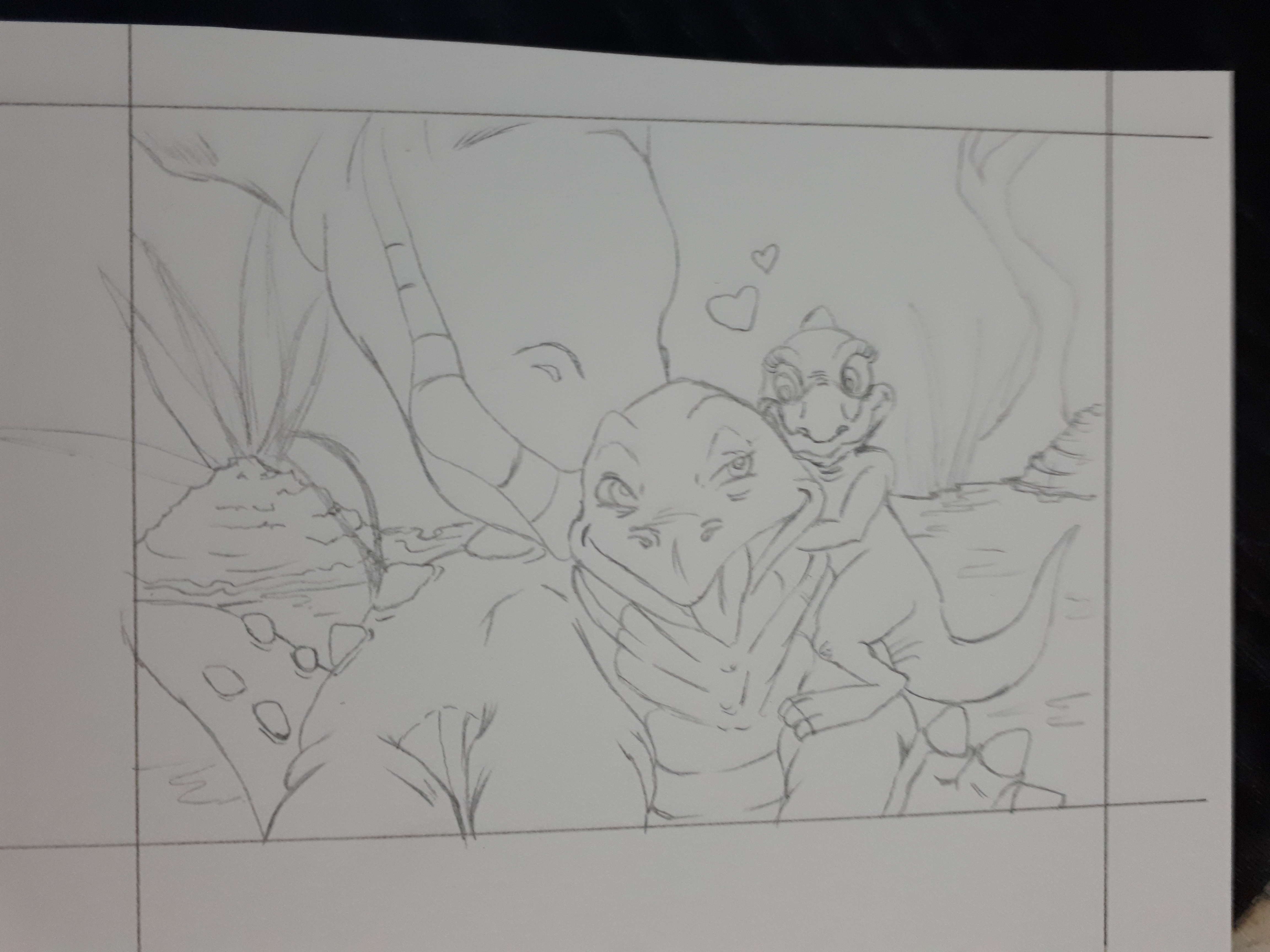 Und hier noch zwei weitere Skizzen, allerdings werde ich noch ein oder zwei mehr machen, weil mir noch einige Szenen sehr gut gefallen. Bei der linken Skizze spielen gerade Littlefoot und Zera mit den Kröten im Sumpf, kurz bevor Scharfzahn die beiden findet. Auf der rechten Skizze sieht man die Szene, wo der kleine Flieger Littlefoot seine Kirsche gibt, die er vorher von der Mutter bekommen hat. Ich finde die Szene soo putzig! Vor allem diese kleinen Babyflieger, deswegen habe ich sie noch einmal in Reihe gestellt. :D