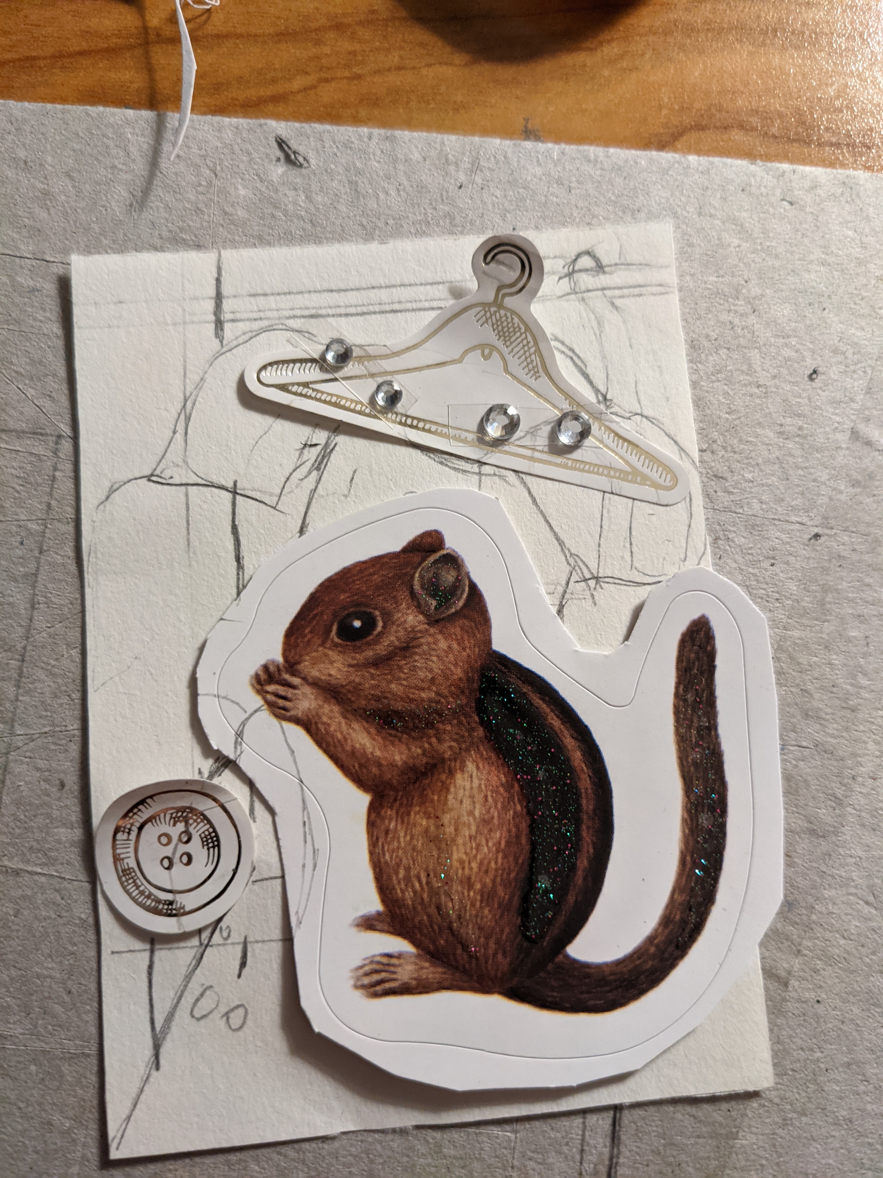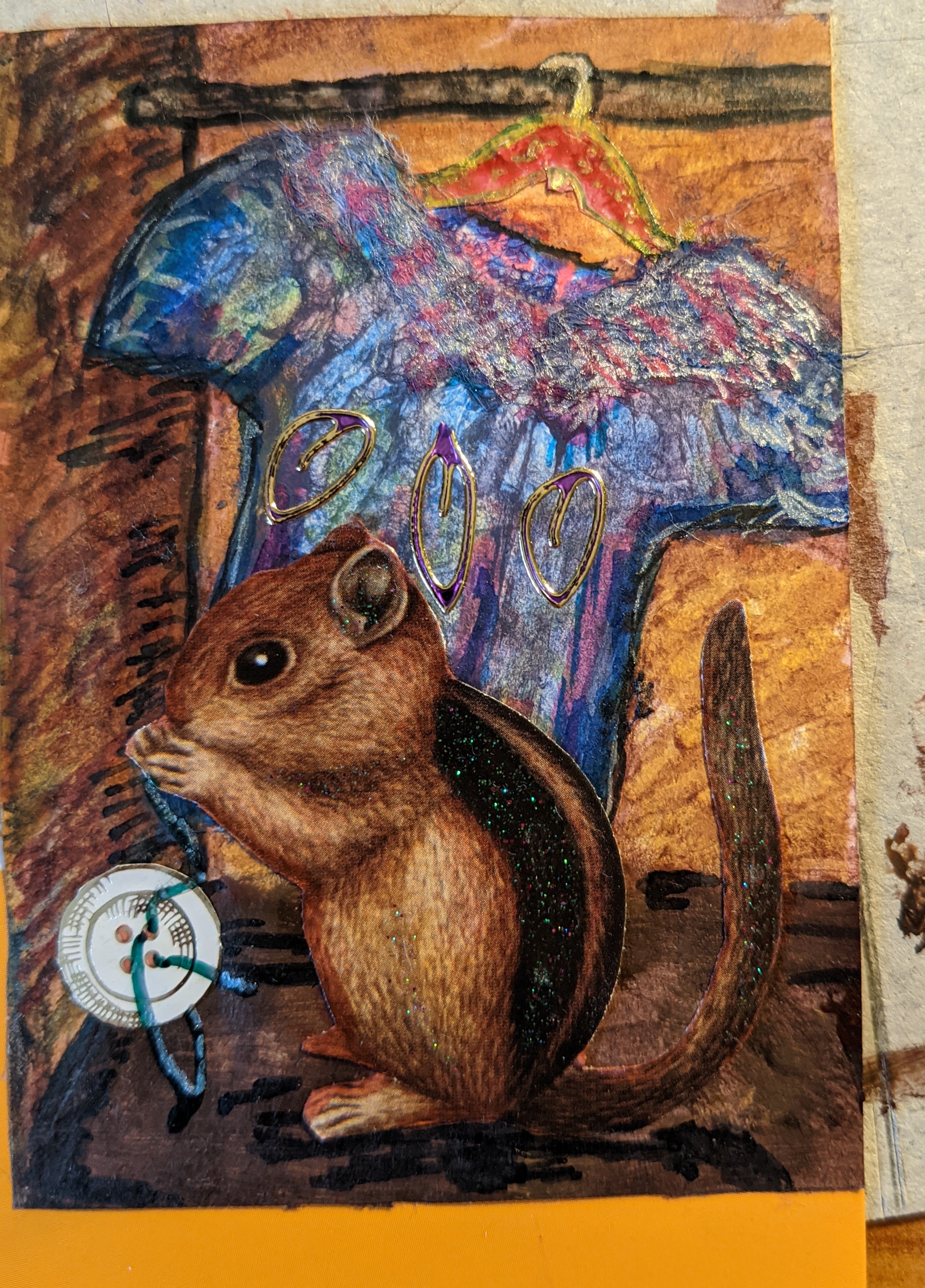 hier hat sich eine Haselmaus im Schrank verirrt und klaut einen Knopf. Im Hintergrund sieht man ein an einem Bügel aufgehangendes T_Shirt (vllt mit Strasssteinen muss ich mir noch überlegen). Allgemeine Frage die Sticker dürfen ja zurechtgeschnitten werden. Ist es hier auch möglich diese anzumalen. In diesem Fall den Bügel und den Knopf ?