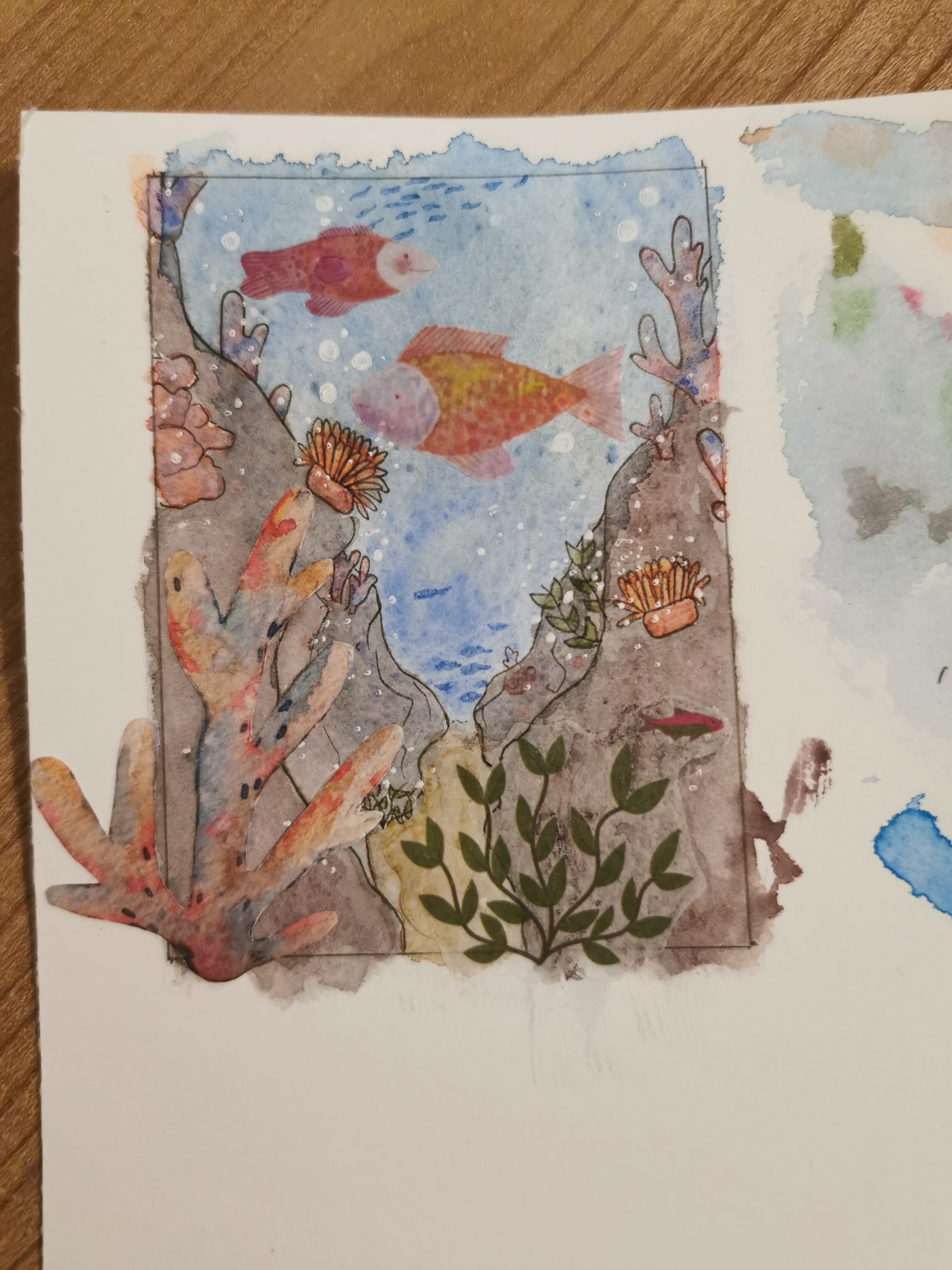 Ein Korallenriff! Hinter der Koralle befinden sich noch ein paar Details (den weißen Rand würde ich wegschneiden) und vermutlich rücke ich sie noch etwas nach rechts. Die Fische und Wasserpflanze bleiben so wie sie sind, anscheinend lässt sich der Rand dieser Sticker ein bisschen mit Aquarell bearbeiten, ich teste mal ob sich das dann gut an den Hintergrund anpasst ^^ Ich hoffe das ist so alles in Ordnung :)