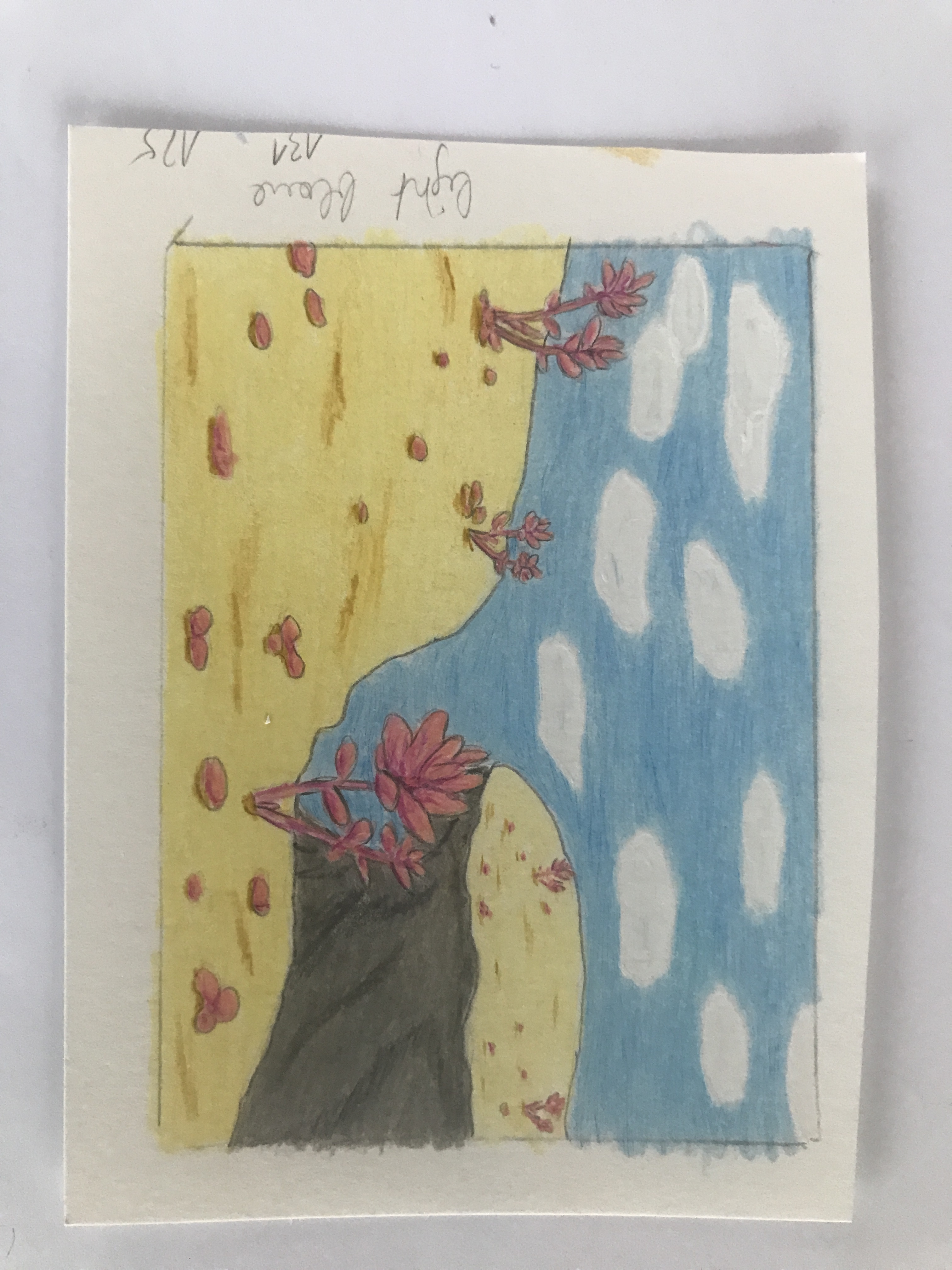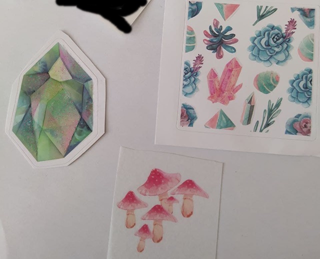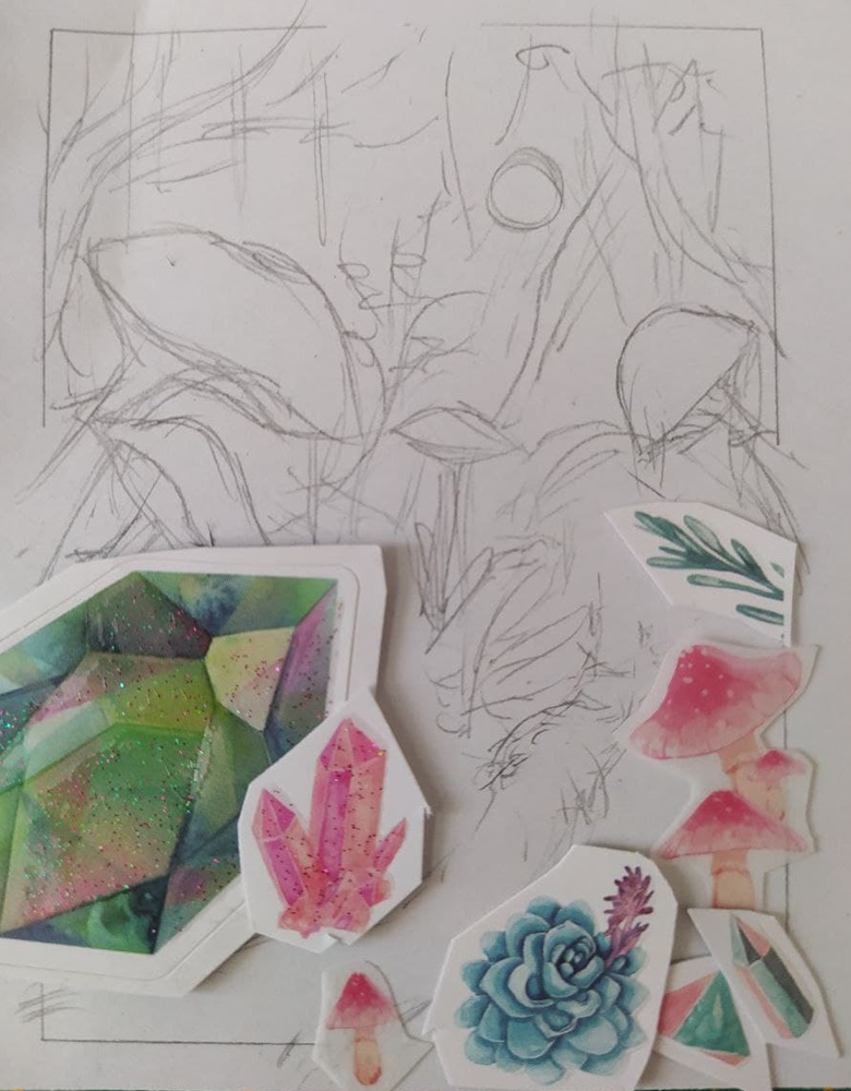 Ich dachte an eine Art Fantasy- Dschungel mit Pilzen und Kristallen, im Tageslicht, die Farben dann pastellig an die Sticker angepasst. ^^