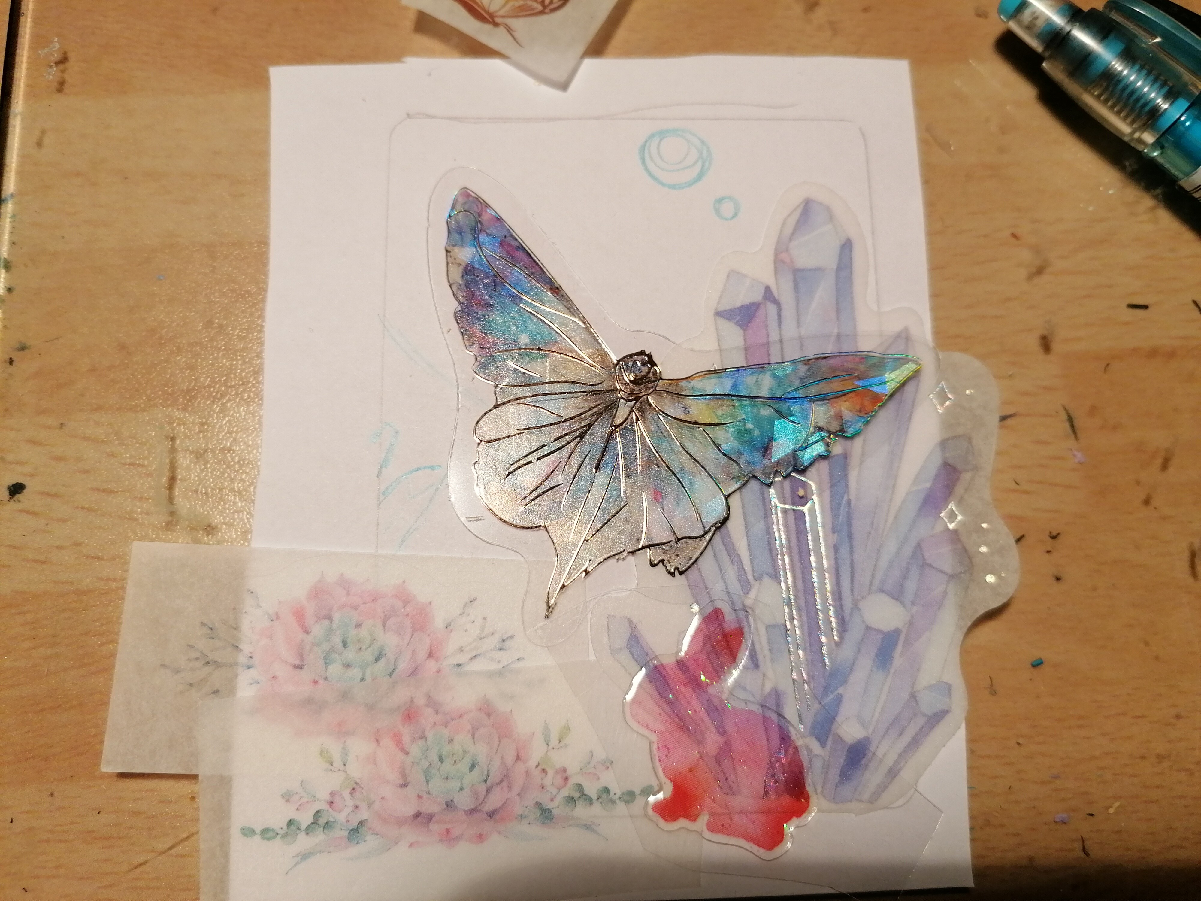Hier plane ich noch ein paar mehr gemalte Sukulenten und Kristalle im Hintergrund. Der große Kristallsticker ist von mir.