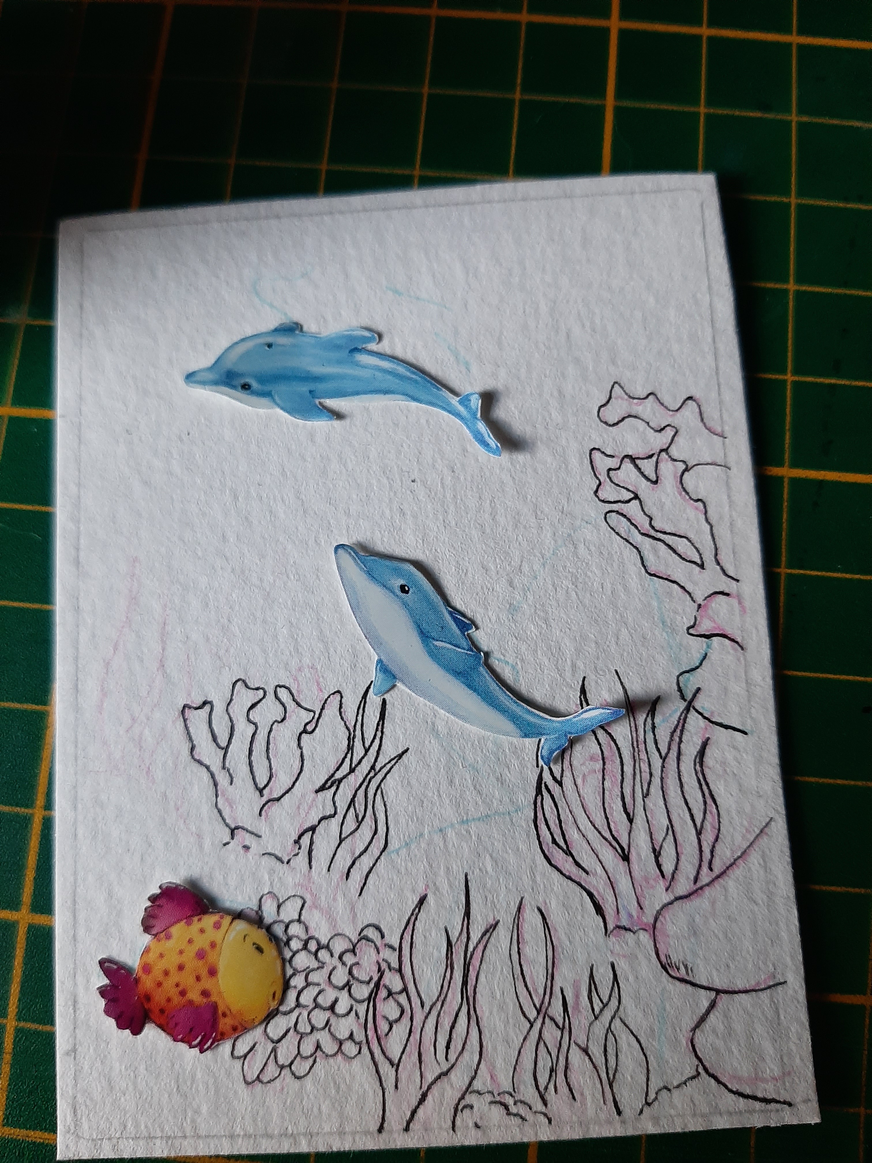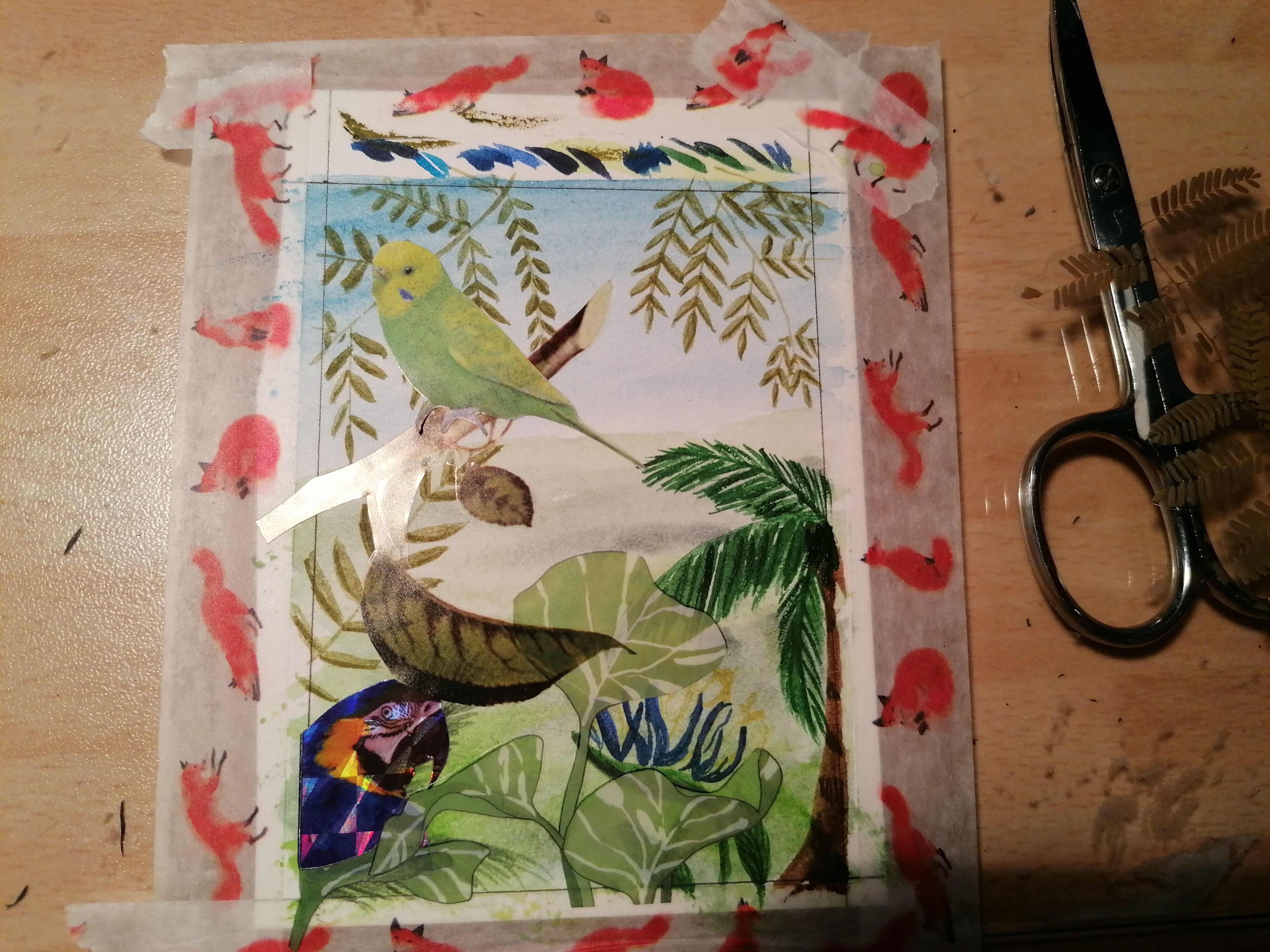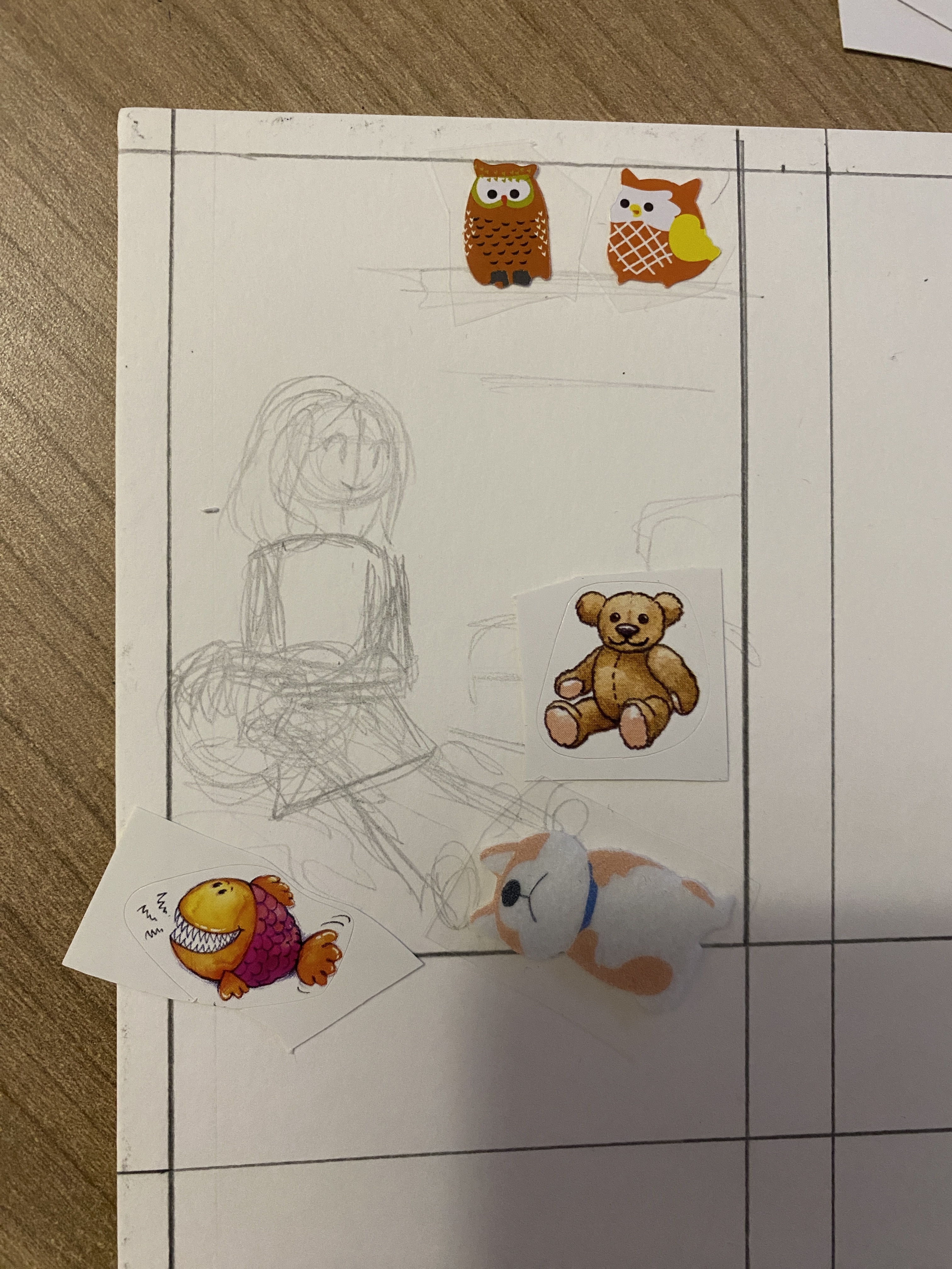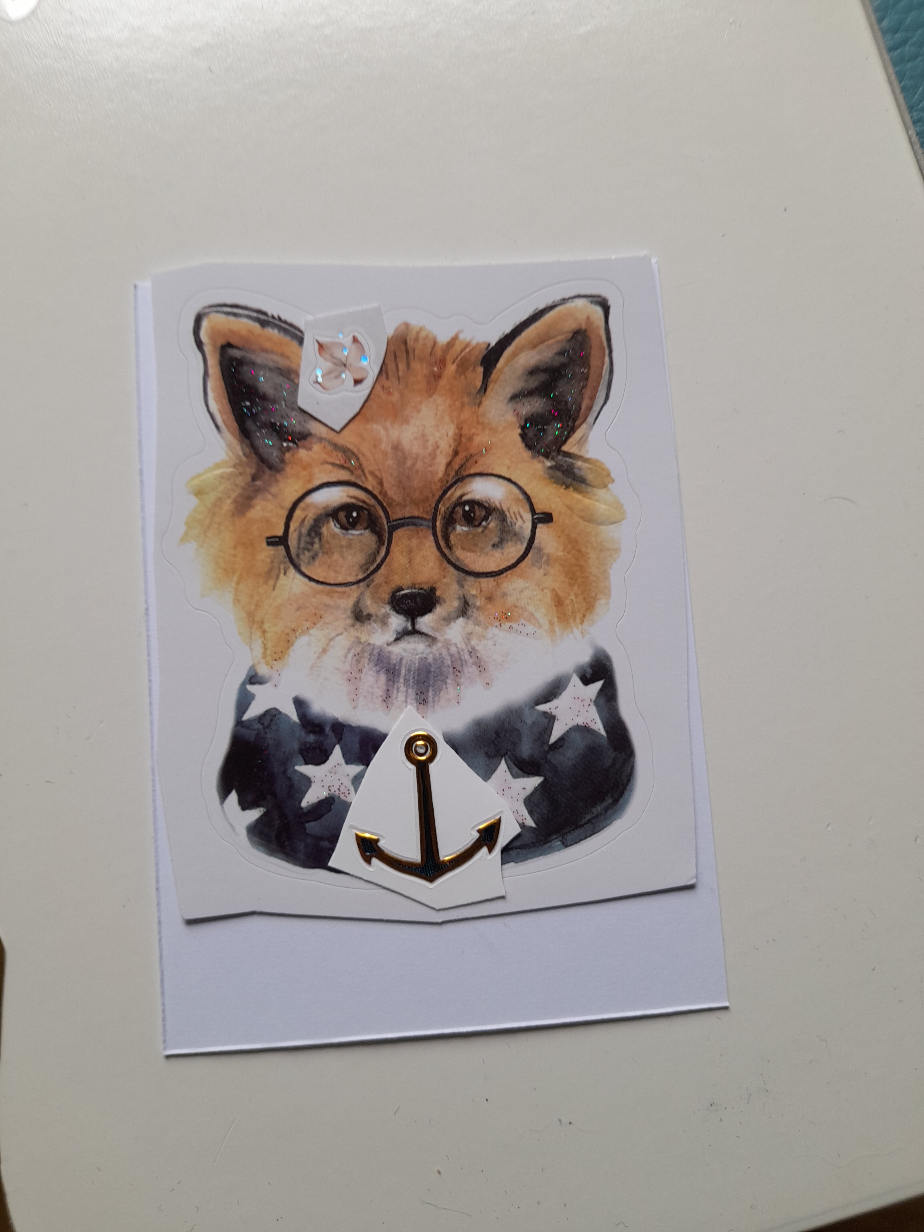 Hier würde ich den Fuchs noch weiter malen und ihm eine Art Halsband oder Kette über das Halstuch malen, an dem der Anker als Anhänger hängt, vielleicht mache ich das auch mit einem der Sticker. Was ich in den Hintergrund mache weiß ich nicht, da davon nicht viel vorhanden ist, aber vielleicht nutze ich ein paar der maritimen Sticker in Anlehnung an den Anker.