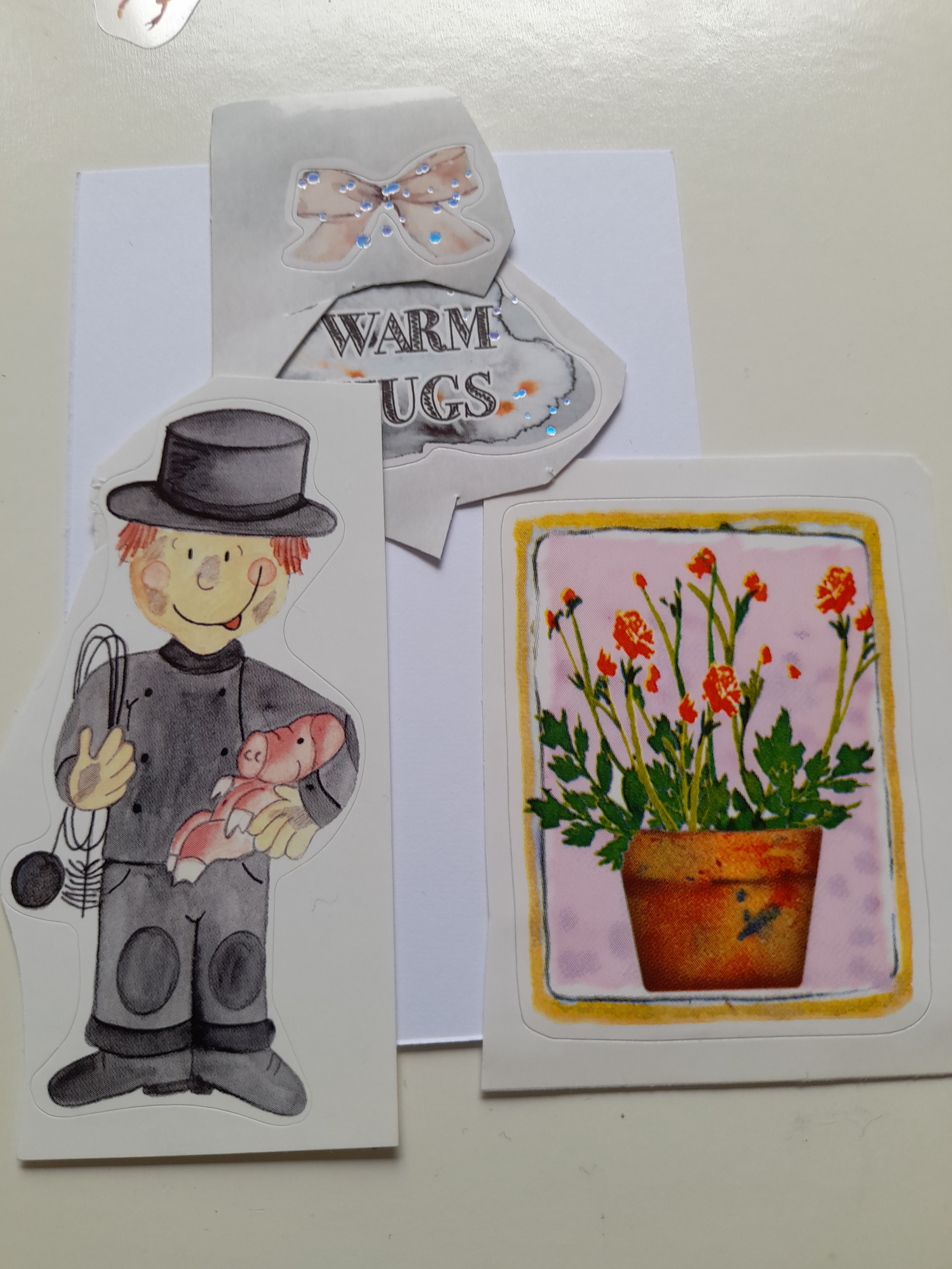 Aus der Schleife und dem „Warm Hugs“ werde ich ein Türschild machen und den Blumentopf würde ich (wenn erlaubt) ausschneiden und im Hintergrund würde ich generellen eine Hauswand mit Eingangstür malen