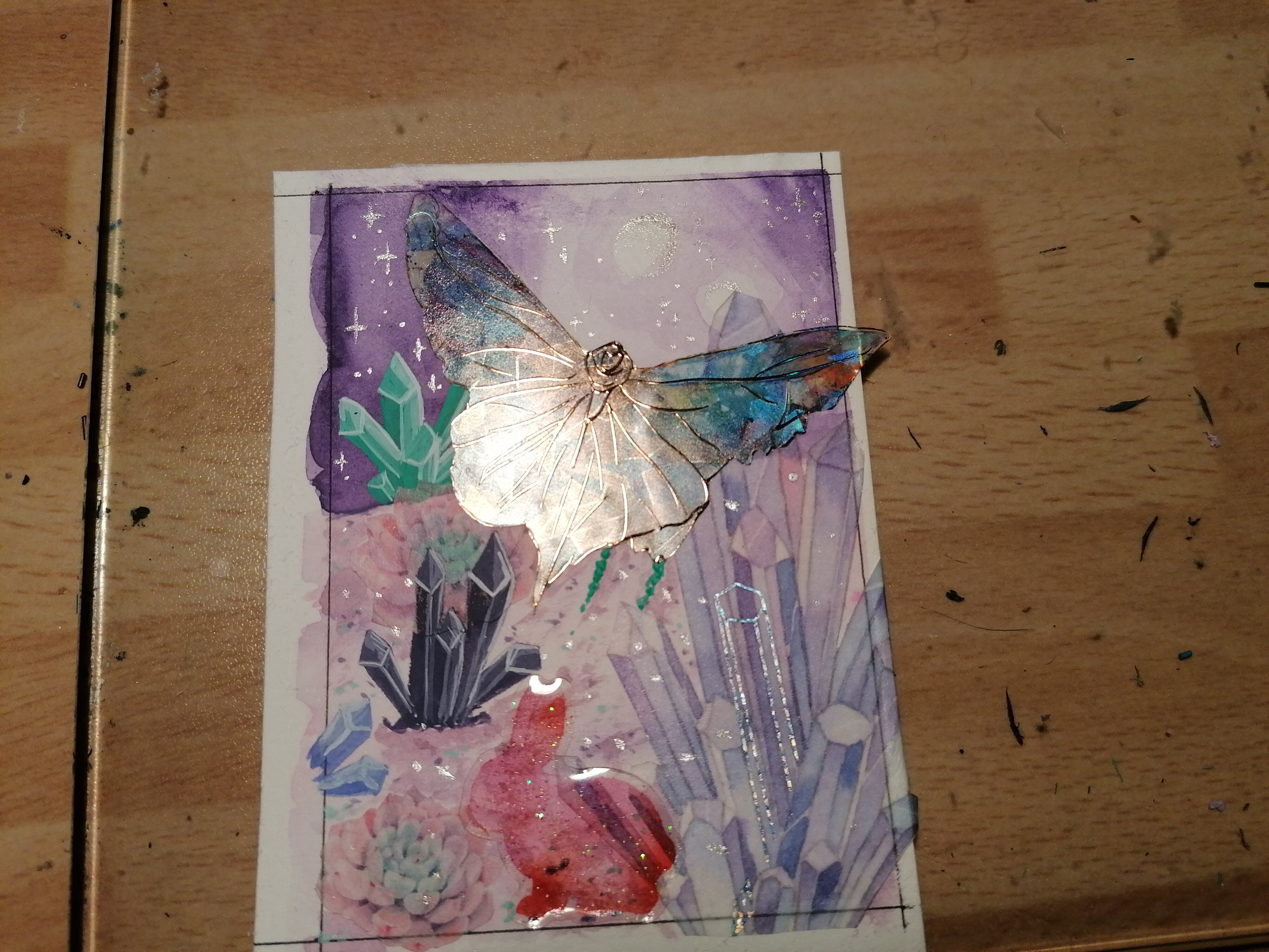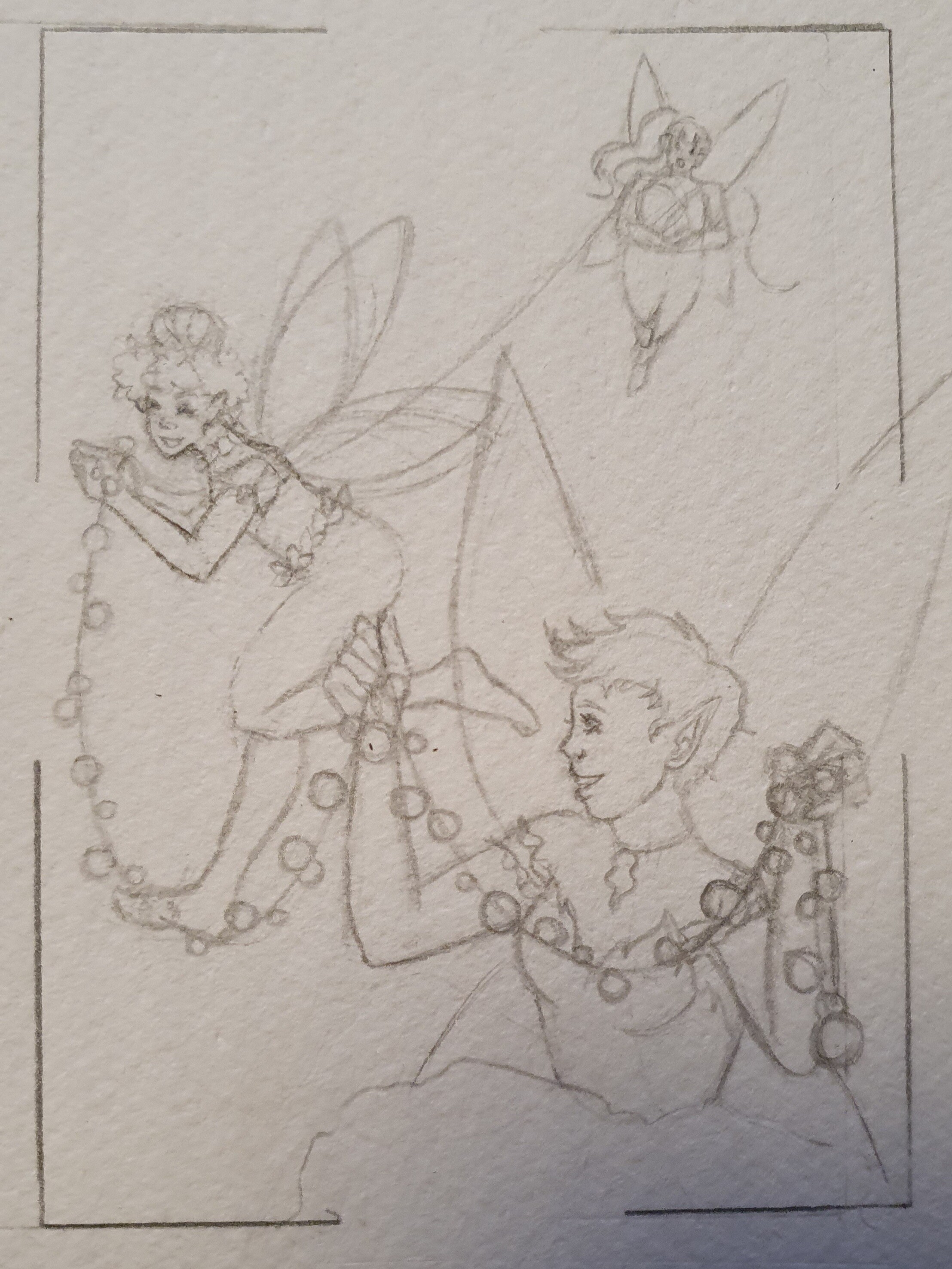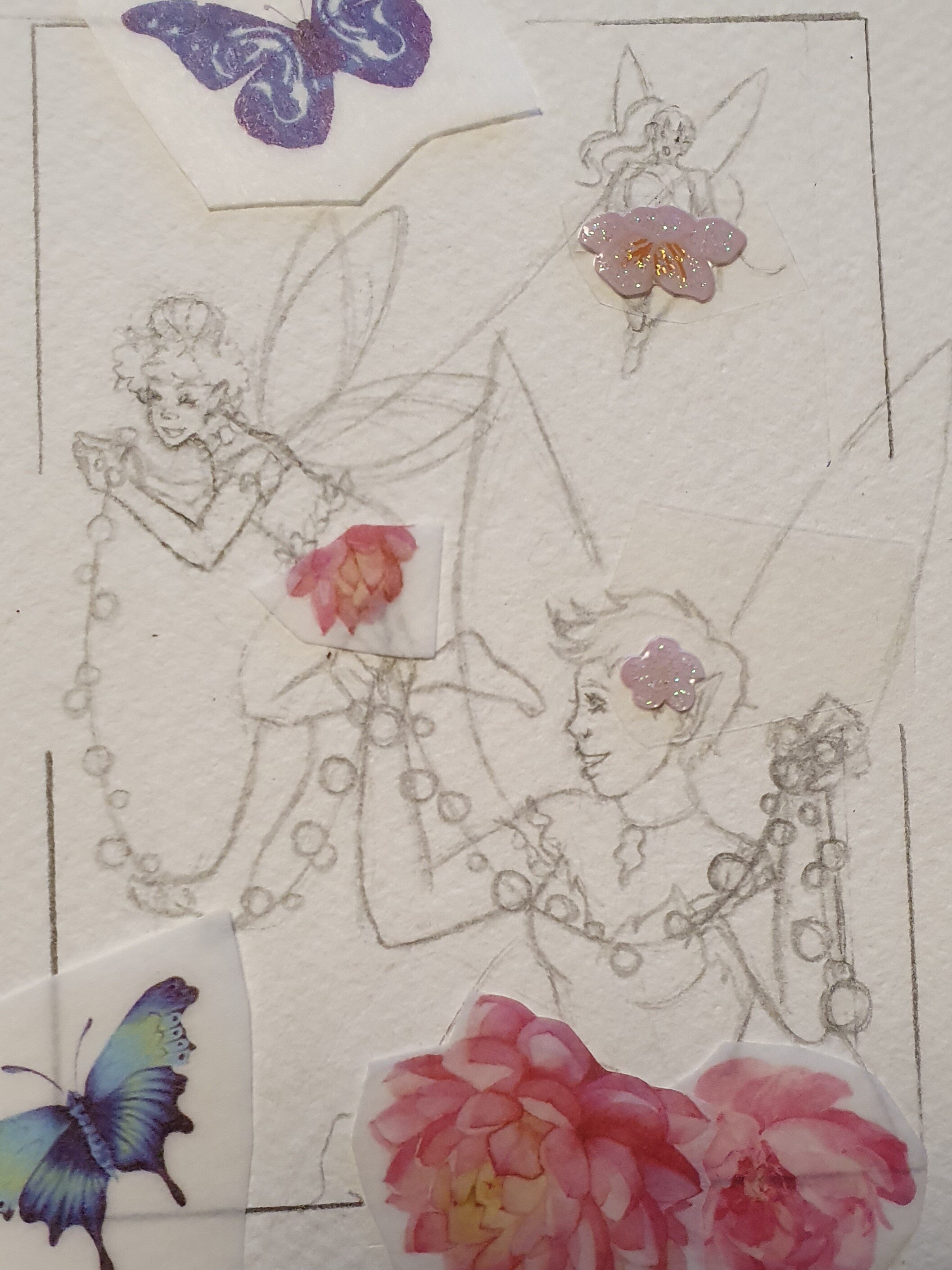 Ein paar verspielte Feen, die gerade eine Lichterkette aufhängen. Hier würde ich vor allem auch die unterschiedlichen Blumensticker, die in der Wundertüte dabei waren, benutzen c: Sollten die Schnetterlinge auf der Karte landen, werde ich sie wahrscheinlich noch um einige gezeichnete Schmetterlinge ergänzen. Der Hintergrund wird wahrscheinlich in Richtung Baumkronen/Feendorf mit Baumhäuswrn gehen :D