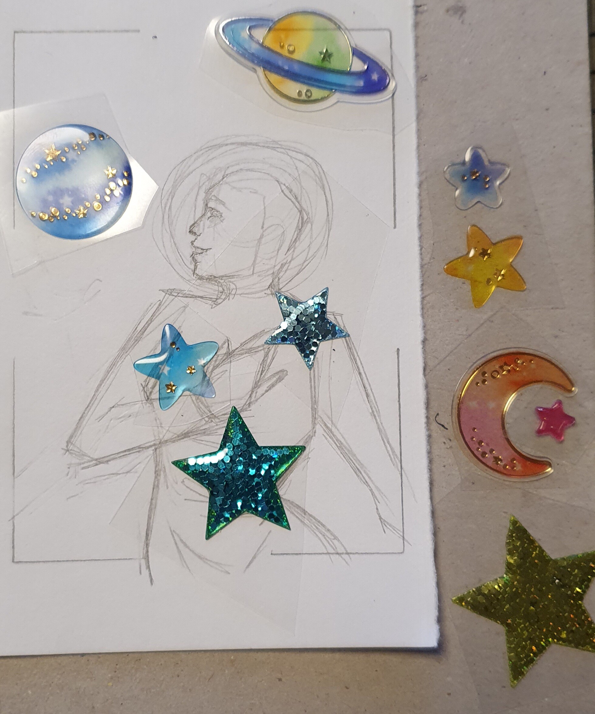 Bei diesem Motiv bin ich noch am überlegen, ob es eine unrealistische Astronautin oder eventuell eine Superheldin wird~ Die bunten Sterne würden sich finde ich auch für den Anzug einer Superheldin anbieten c: