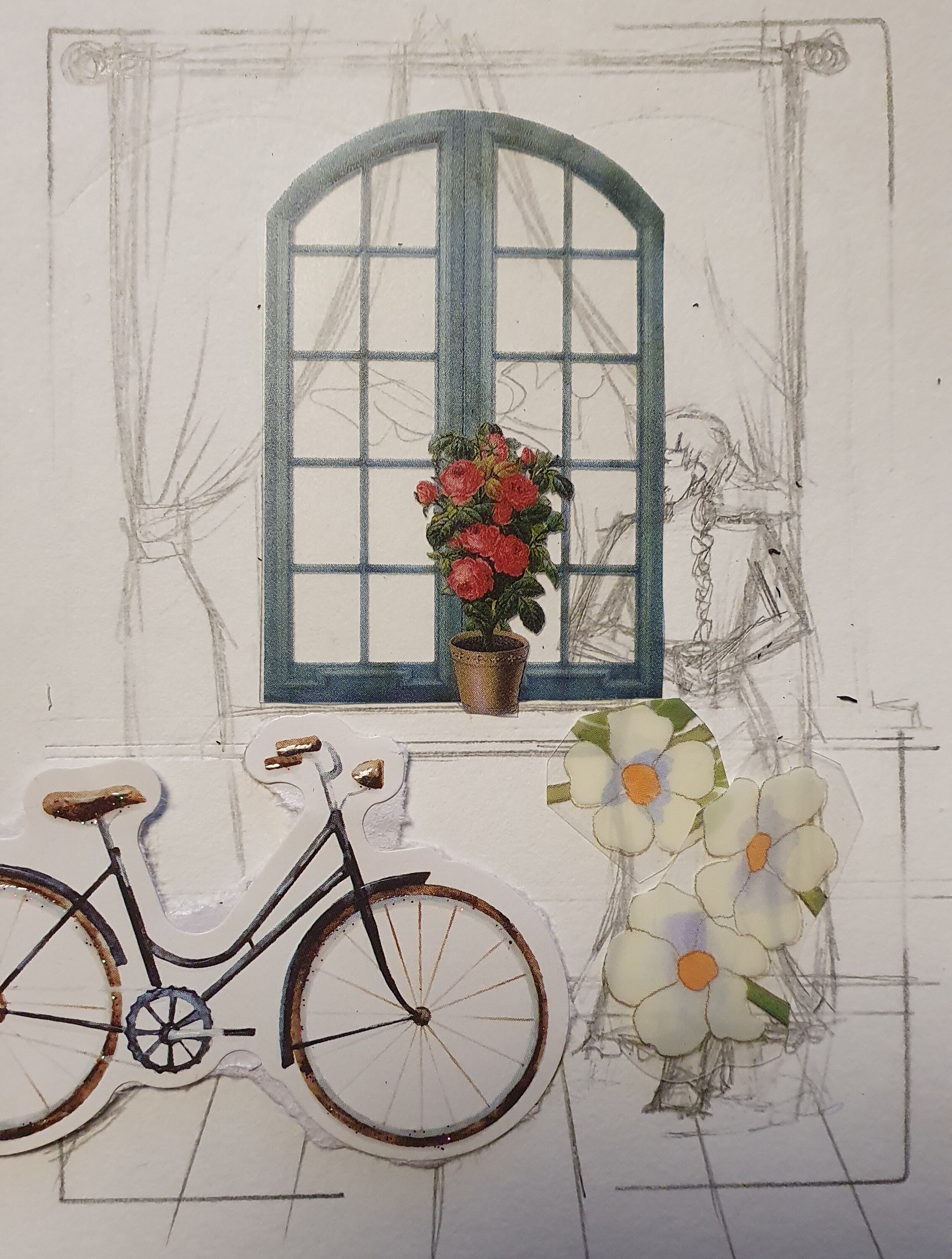 Eine Ansicht einer Wohnung, in der gerade jemand am Fenster einen Kaffee oder Tee trinkt. Das Fahrrad würde ich super gerne verwenden, habe aber etwas Sorge, ob ich das vernünftig ausgeschnitten bekomme. Die Blumen auf dem Kleid sind von dem großen Erdbeersticker und würde ich auf der richtigen Katze natürlich noch exakter zuschneiden/anpassen. Hatte außerdem noch Strasssteine/Nagelsticker in der Wundertüte, die hier eventuell zum Einsatz kommen werden.