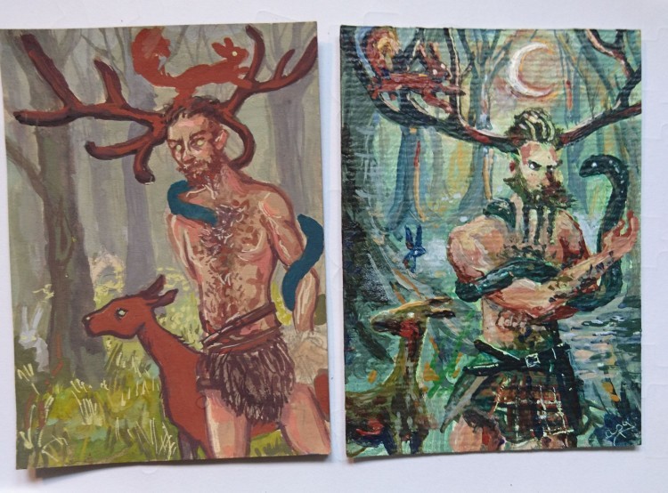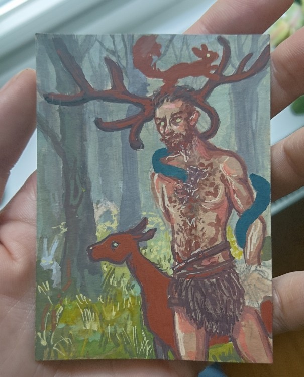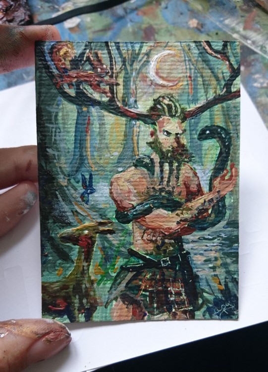arbeite an Cernunnos (mit tierfreunden im wald rumstehend). hab gestern stundenlang dran rumgepinselt, aber ich bin absolut nicht glücklich mit den farben und kontrasten … (abgesehen von den details, die noch fehlen, wie zB hände xD)
