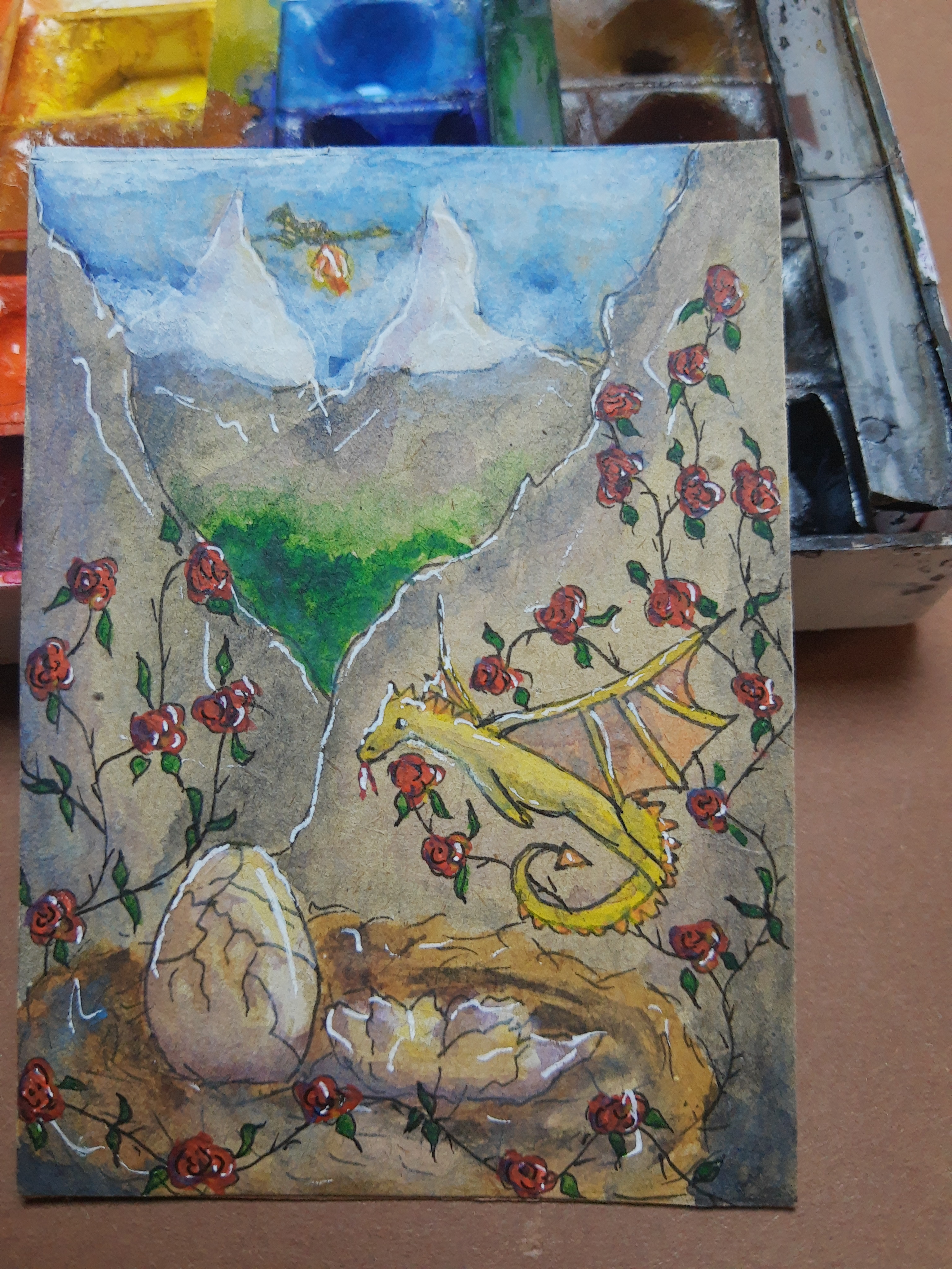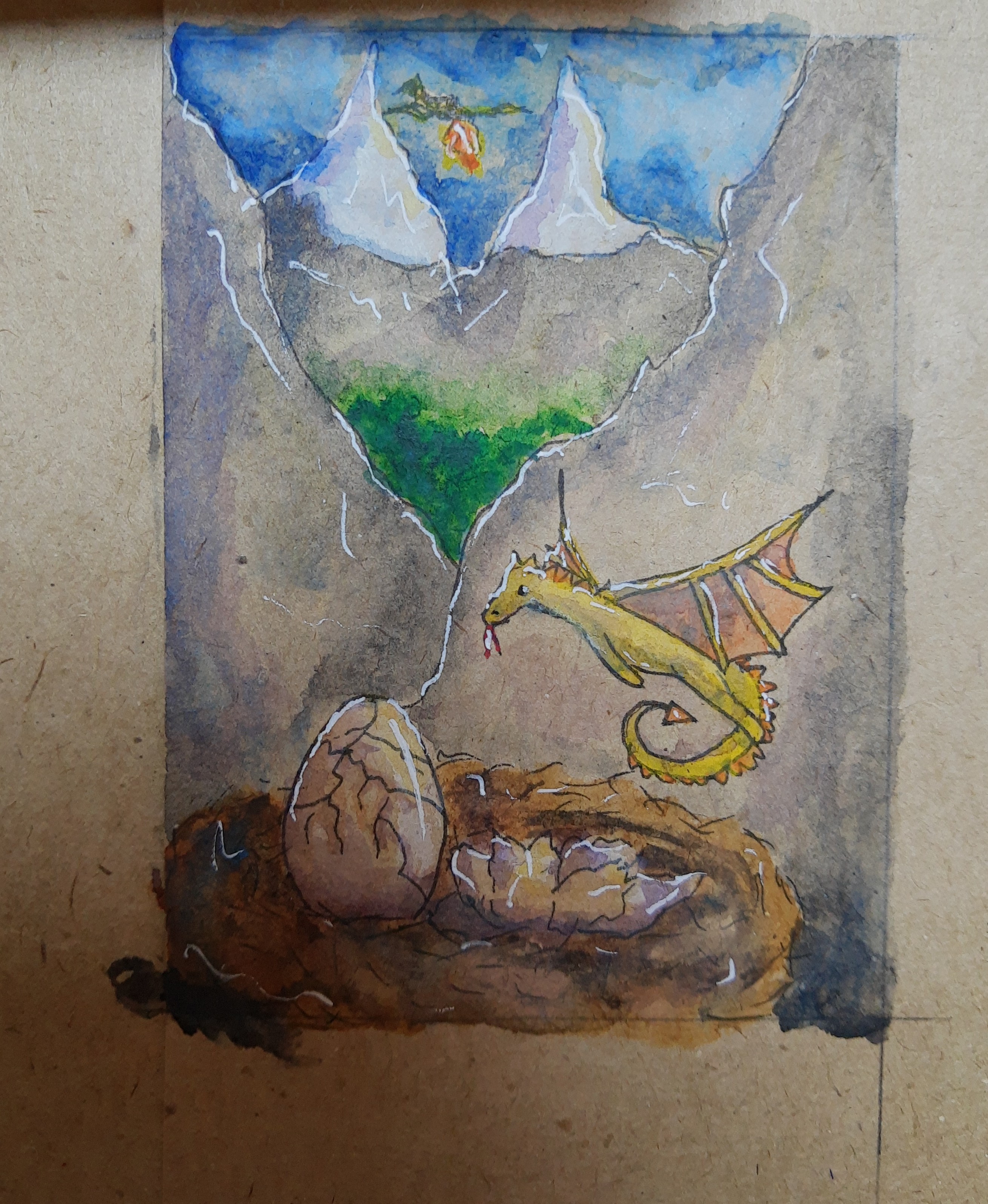 Wenn du magst, könntest du noch links und rechts beim Nest vor dem Felsen Äste mit Blättern reinragen lassen, als ob das Nest noch mal durch Blätter geschützt wird.
