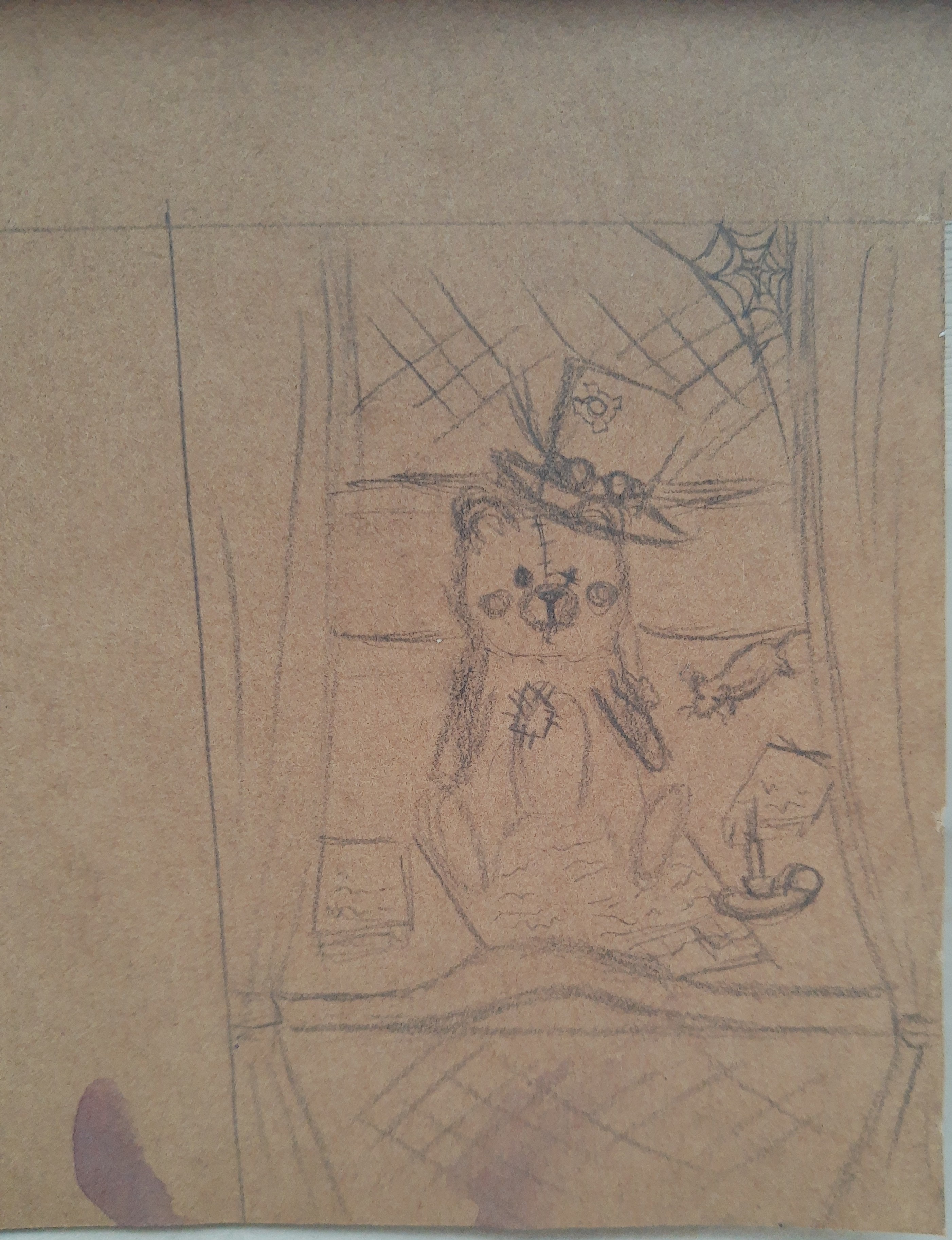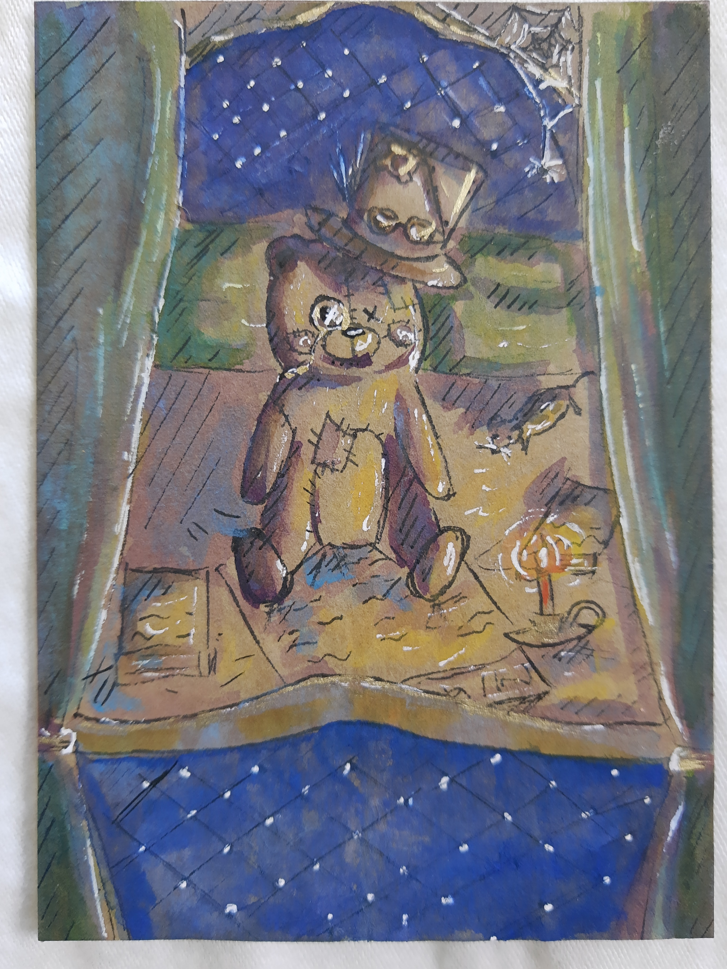 Jap, er sitzt in einem Bettchen, auf einer Zeitung. Er sollte so bisschen wie ein altmodischer dedektiv oder Wissenschaftler aussehen, deswegen hab ich ihm so bisschen steampunkartige, viktorianische Elemente gegeben… Und da er ein Teddy ist wollte ich ihn in einem Bett darstellen. Ansonsten hab ich keinen weiteren krassen Hintergedanken gehabt, man kann sich ja reininterpretieren, was man mag, vielleicht forscht er ja gerade
