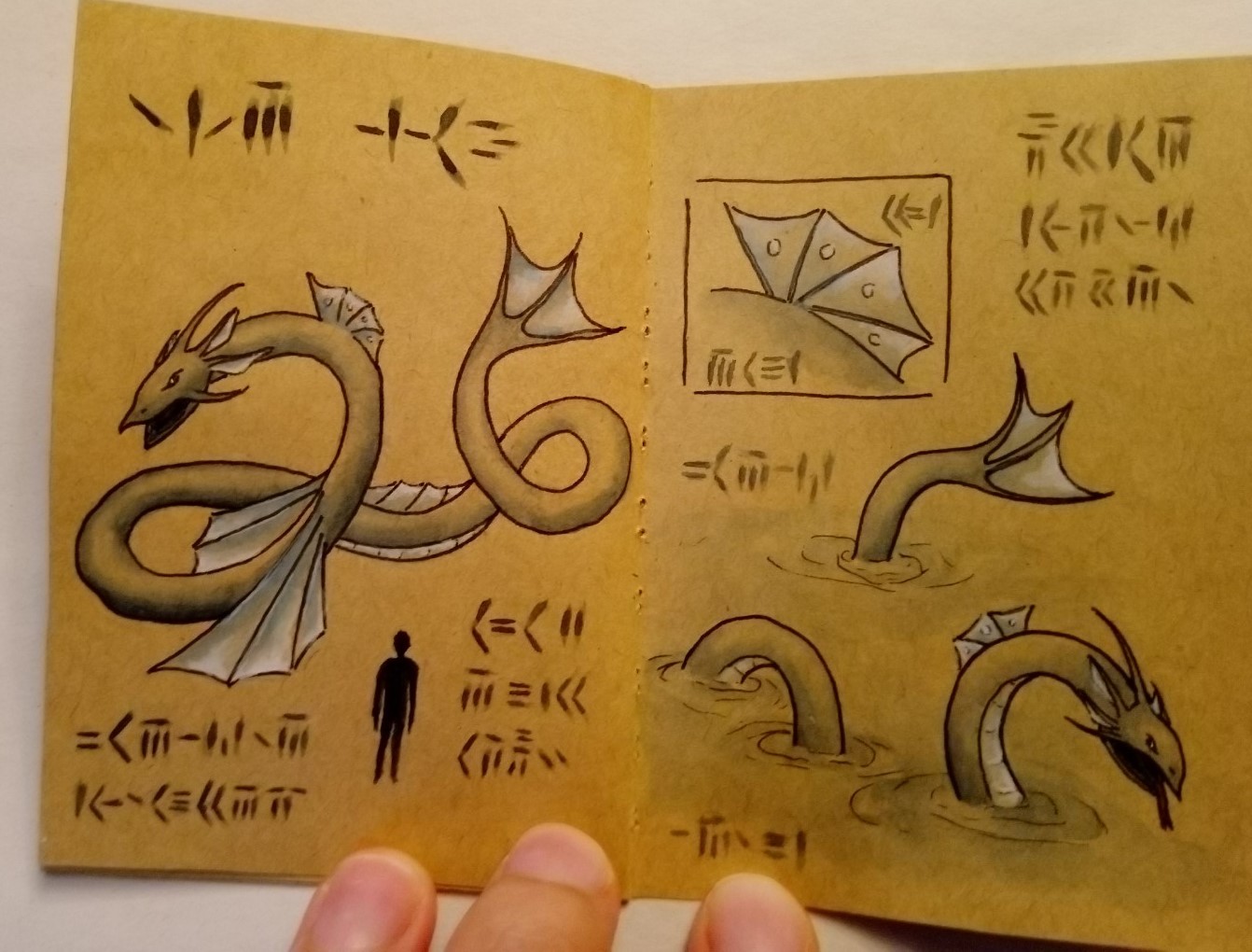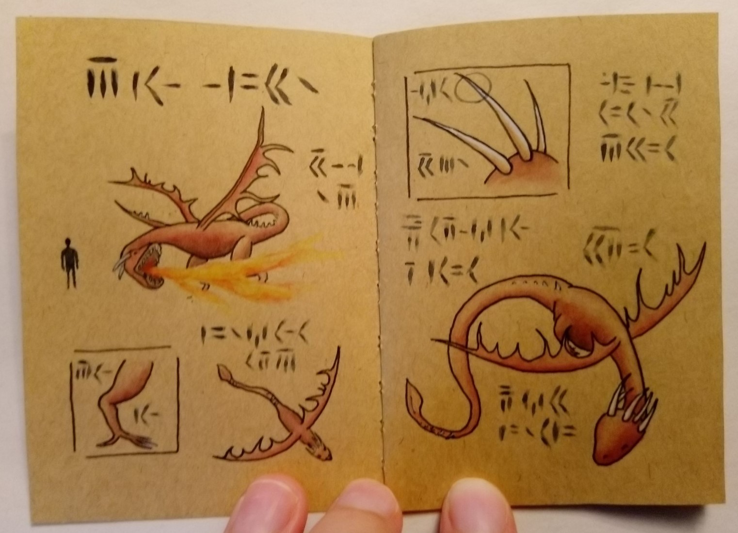 Wo ich mir noch nicht 100% sicher bin ist, ob noch mehr Drachen ähnlich wie der Wasserdrache auf seiner zweiten Seite eine angedeutete Umgebung braucht. Also nicht konkrete Objekte, sondern einfach ein wenig Farbe. Ich tendiere aber eher dagegen, da aktuell nur die zwei Bilder, die die Drachen direkt in Umgebung zeigen auch Umgebung enthalten.