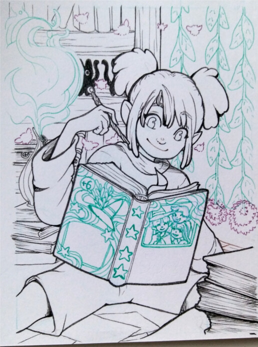 Wahrscheinlich muss ich mir das Mädchen nochmal größer übertragen. Auf der Miniatur-Konzeptskizze oben sitzt sie neben einer Schranke und unter einer Sonnenblume.