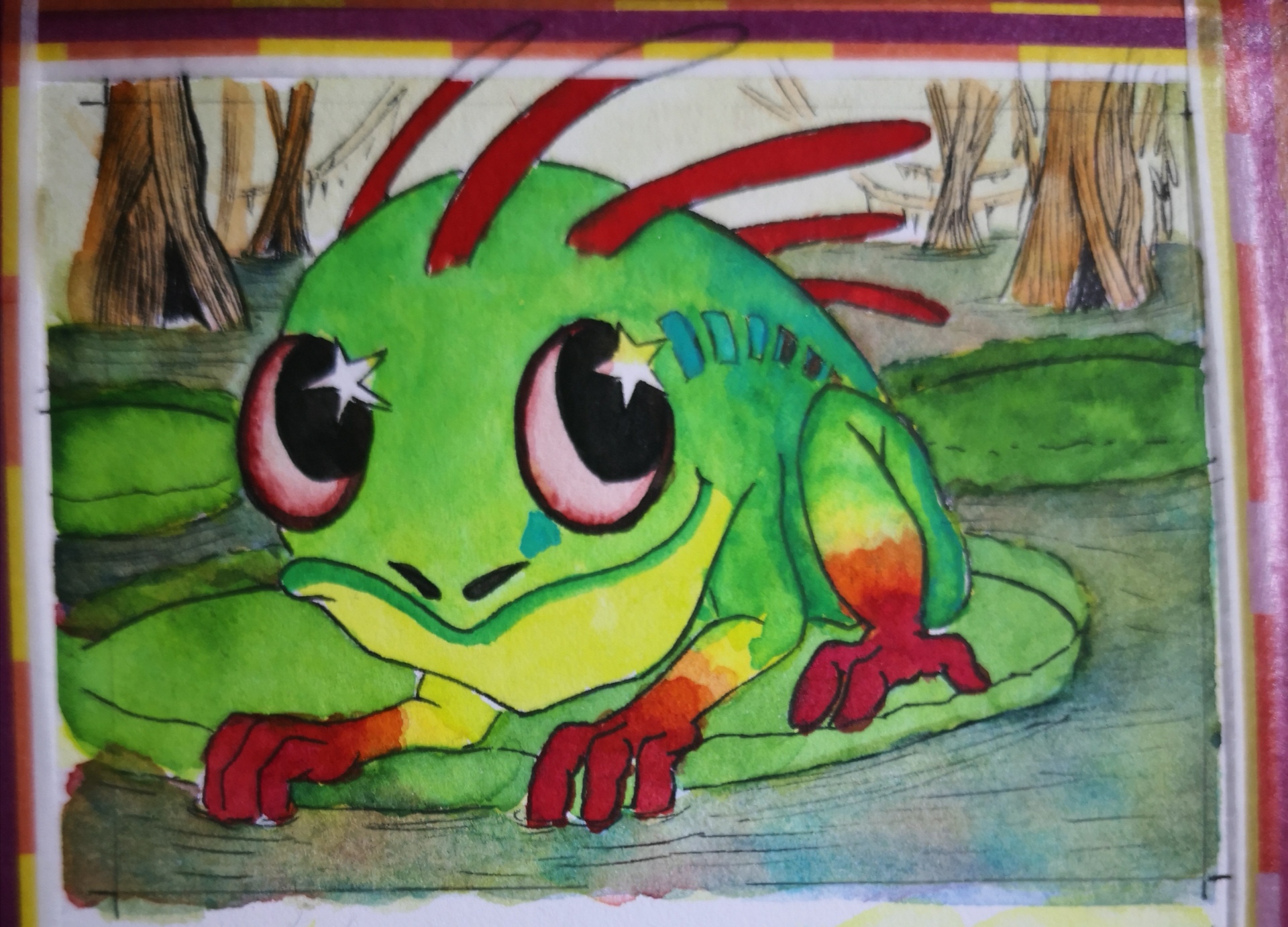 In meinem Kopf sind die mit Fröschen verwandt und Seerosen und Sumpf passt doch ganz gut. Dann kann ich den Hintergrund gedämpft grün halten und den Murloc knallig bunt machen.