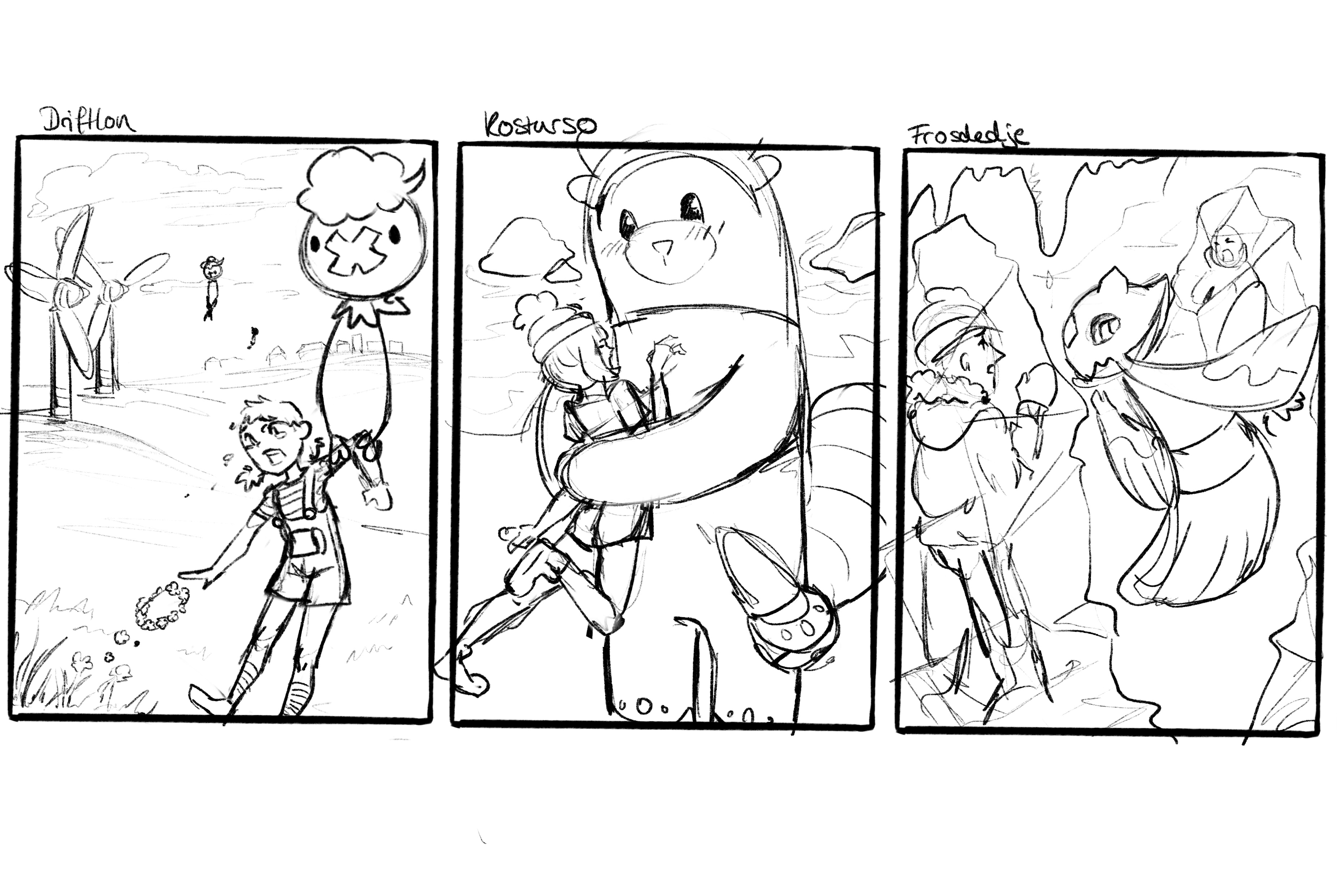 Das hier wären meine ersten Skizzen. Bei Driftlon wird der Hintergrund mit bunten Blumenwiesen gefüllt weil ich dabei an die Gegend bei Flori beim Windkraftwerk in Sinnoh dachte. Die kleinen Figuren im Hintergrund in der Luft sind weitere Driftlon mit Kindern.