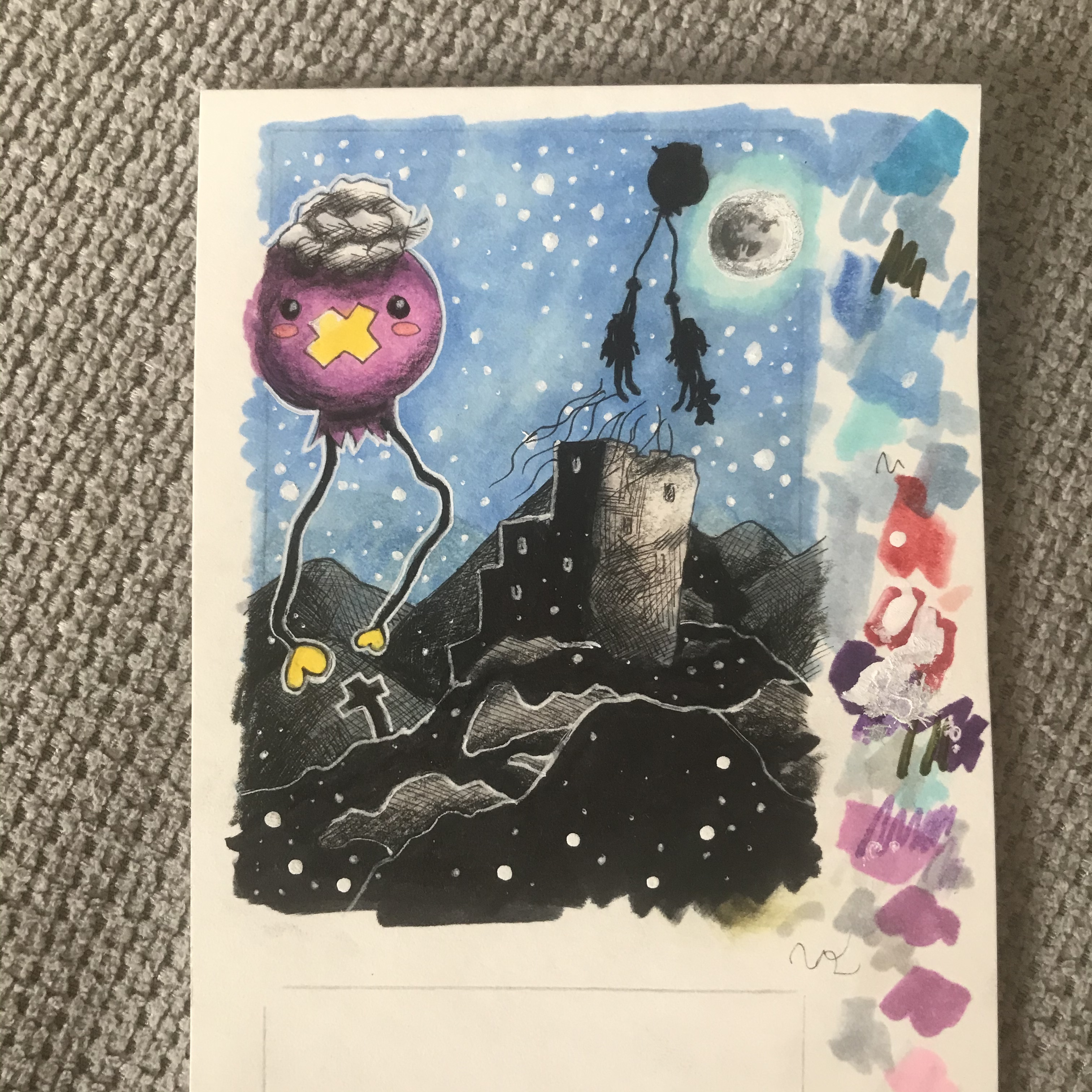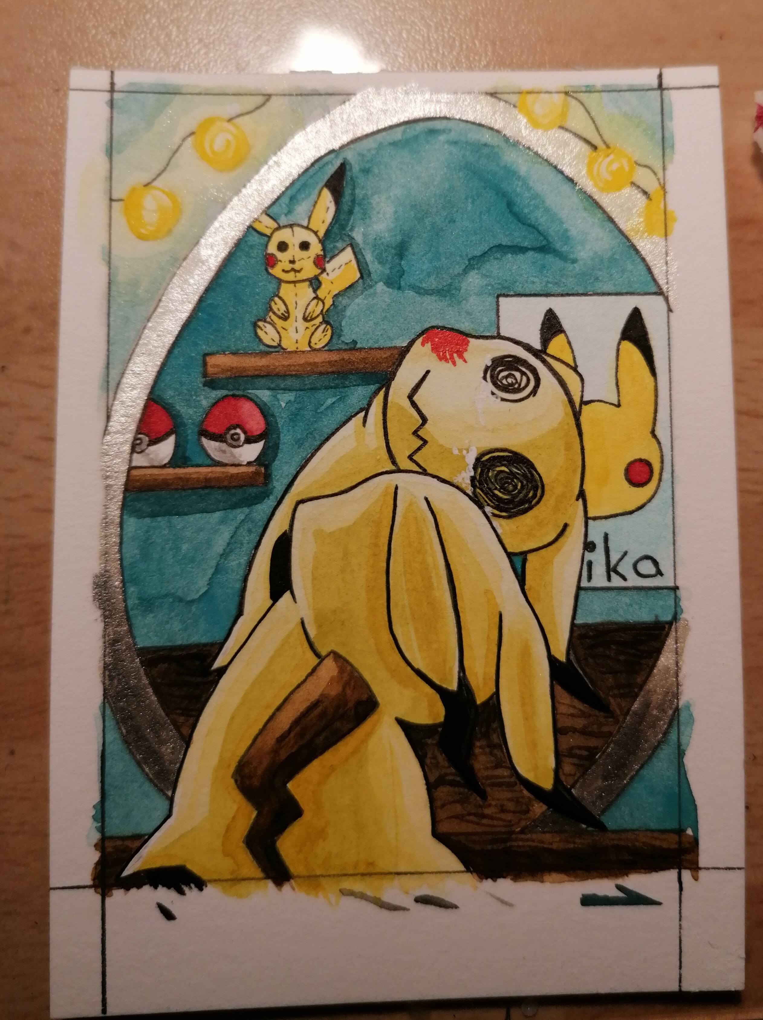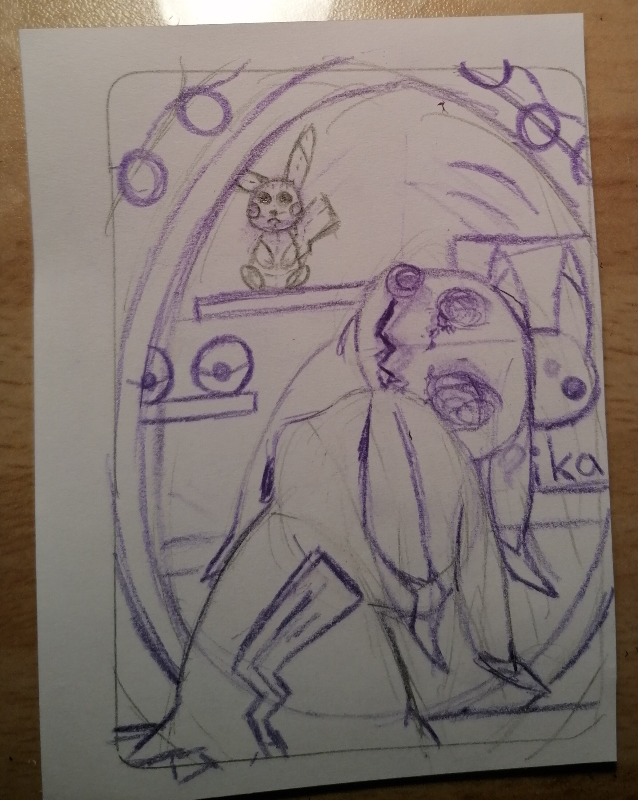 Ich hätte hier meine erste Skizze, sie ist ein bisschen messy geworden. Dem Mimigma laufen Tränen aus den Augen seines Kostüms. Das im Hintergrund soll ein Pikachu Plüschtiere sein.
