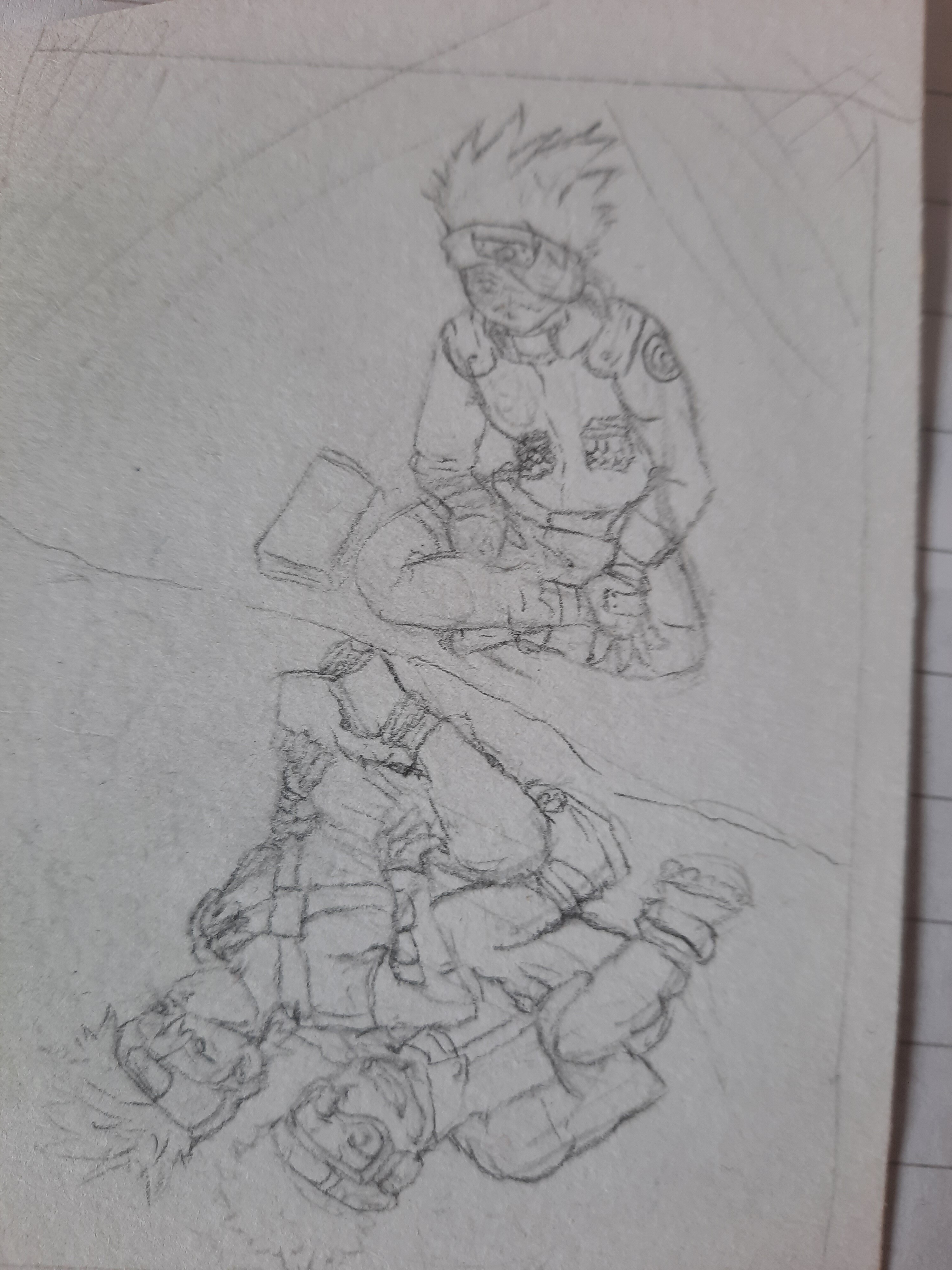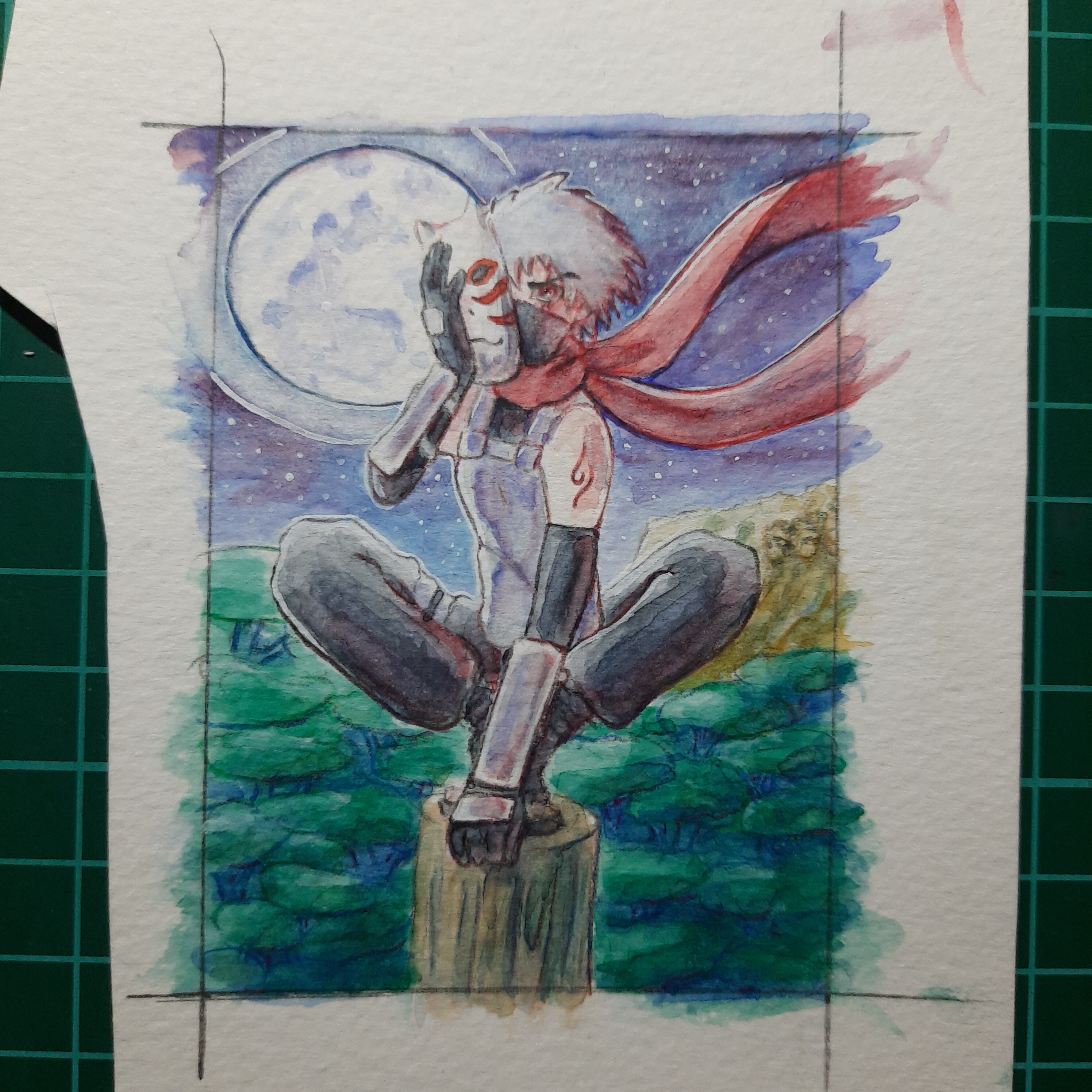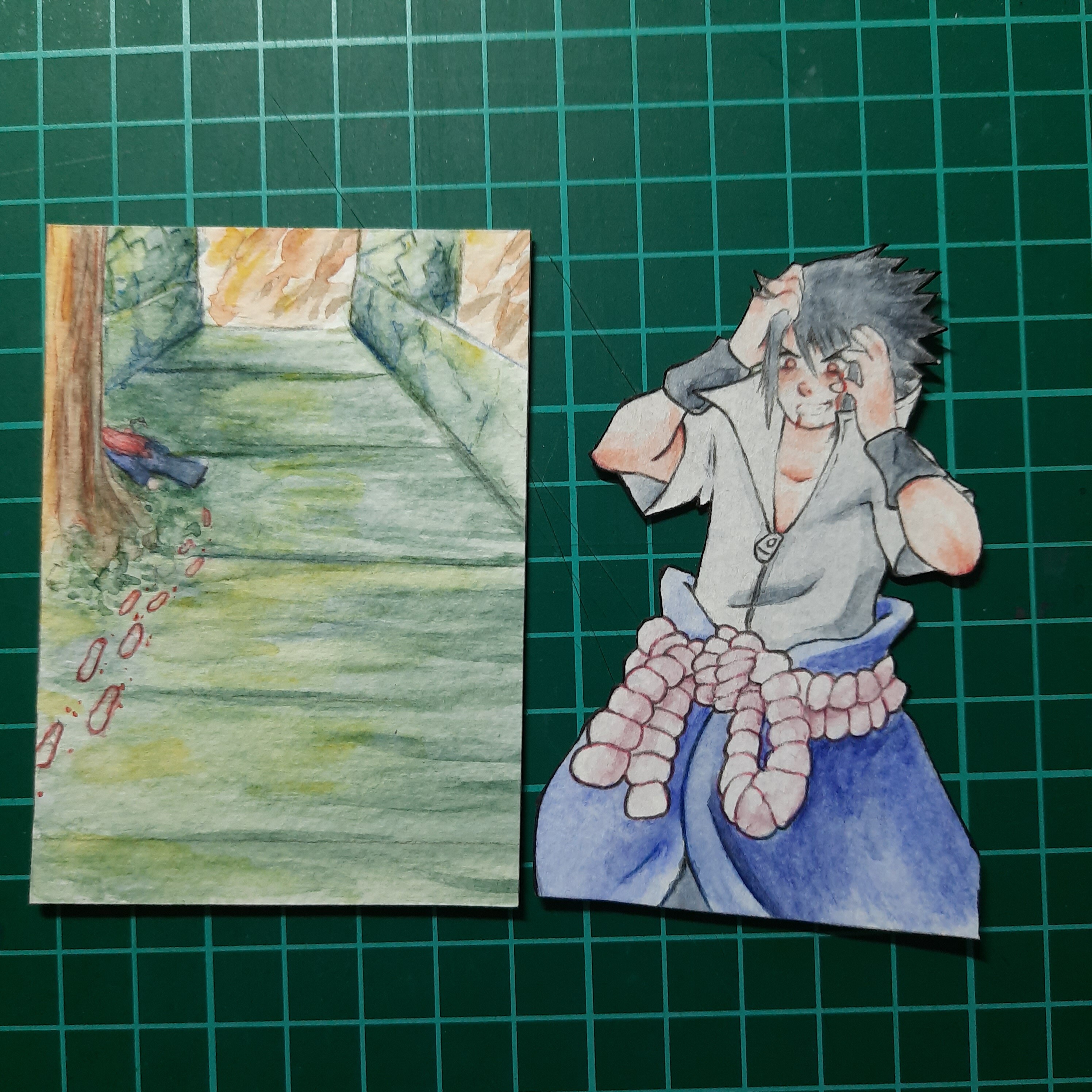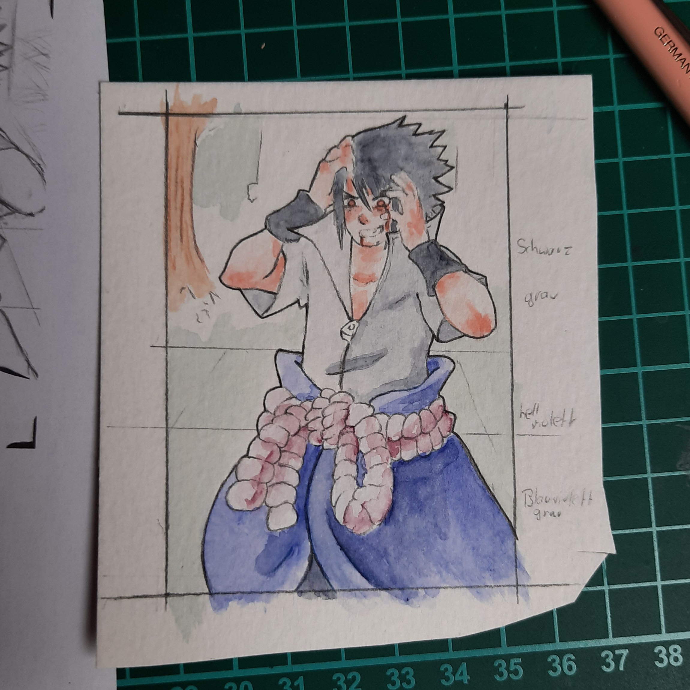 Ich hab Sasuke ausgeschnitten, da ich das Papier vom letzten HG mit dem Radierer aufgeraut habe, aber ich ihn nicht entsorgen wollte, da ich ihn doch recht gelungen fand. Den Hintergrund habe ich dann separat gezeichnet und Sasuke ein wenig versetzt darauf platziert, damit ein leichter 3D Effekt entsteht.
