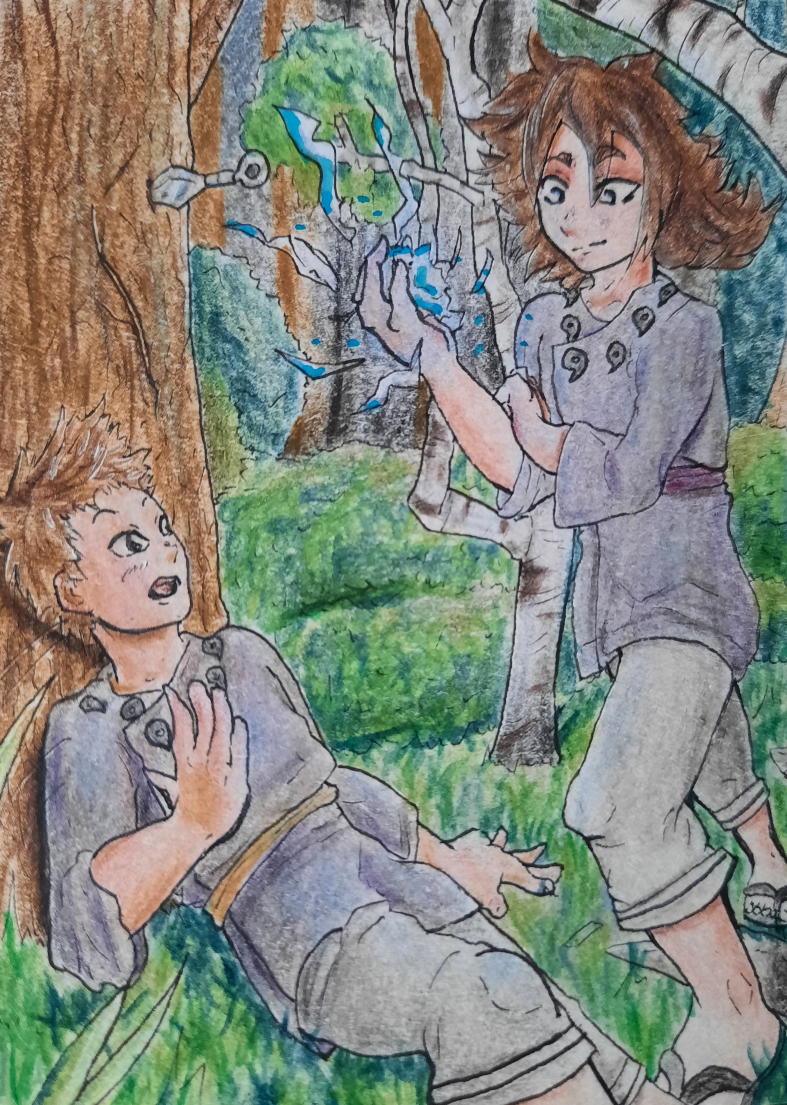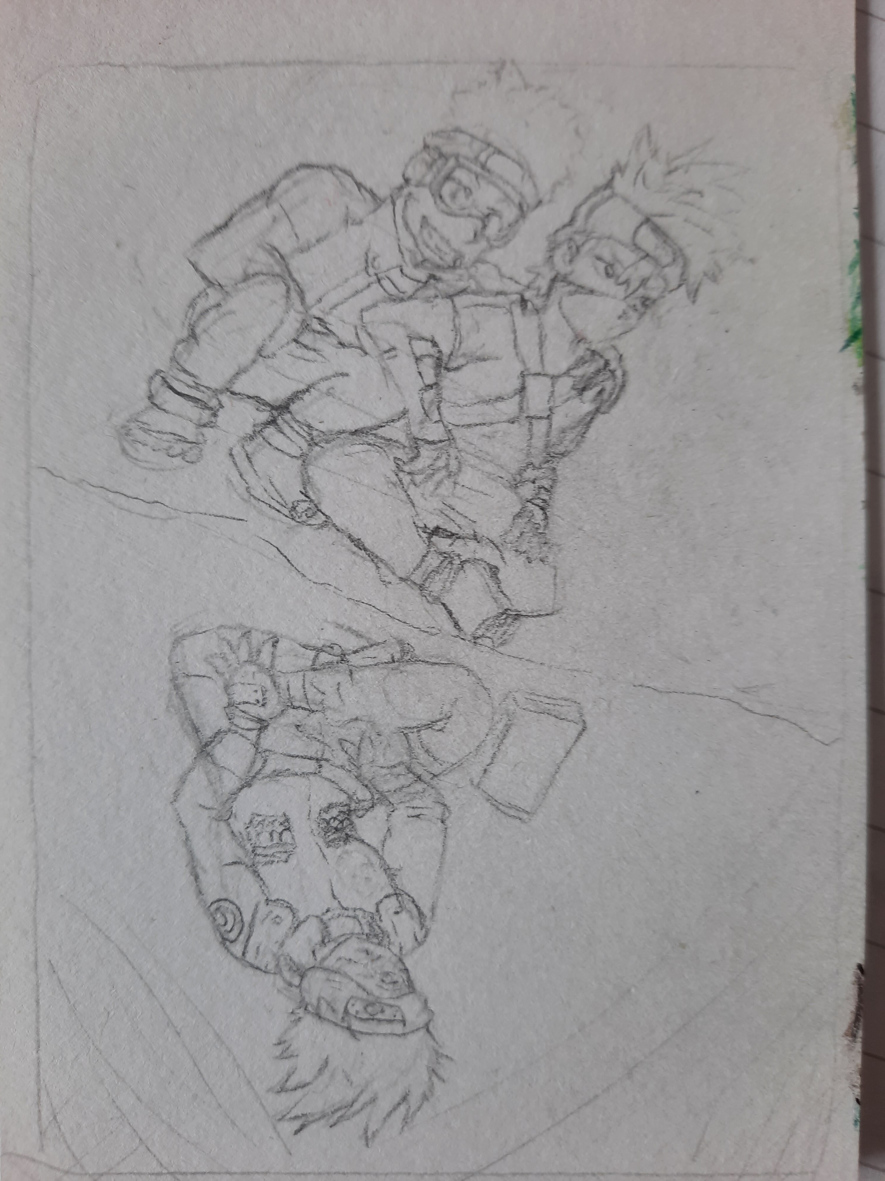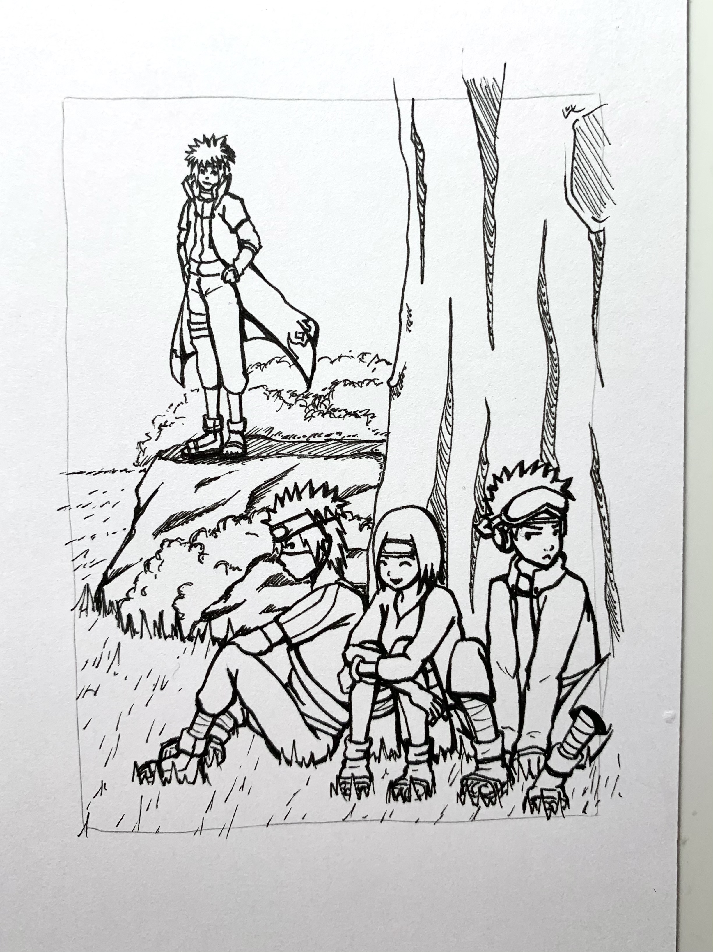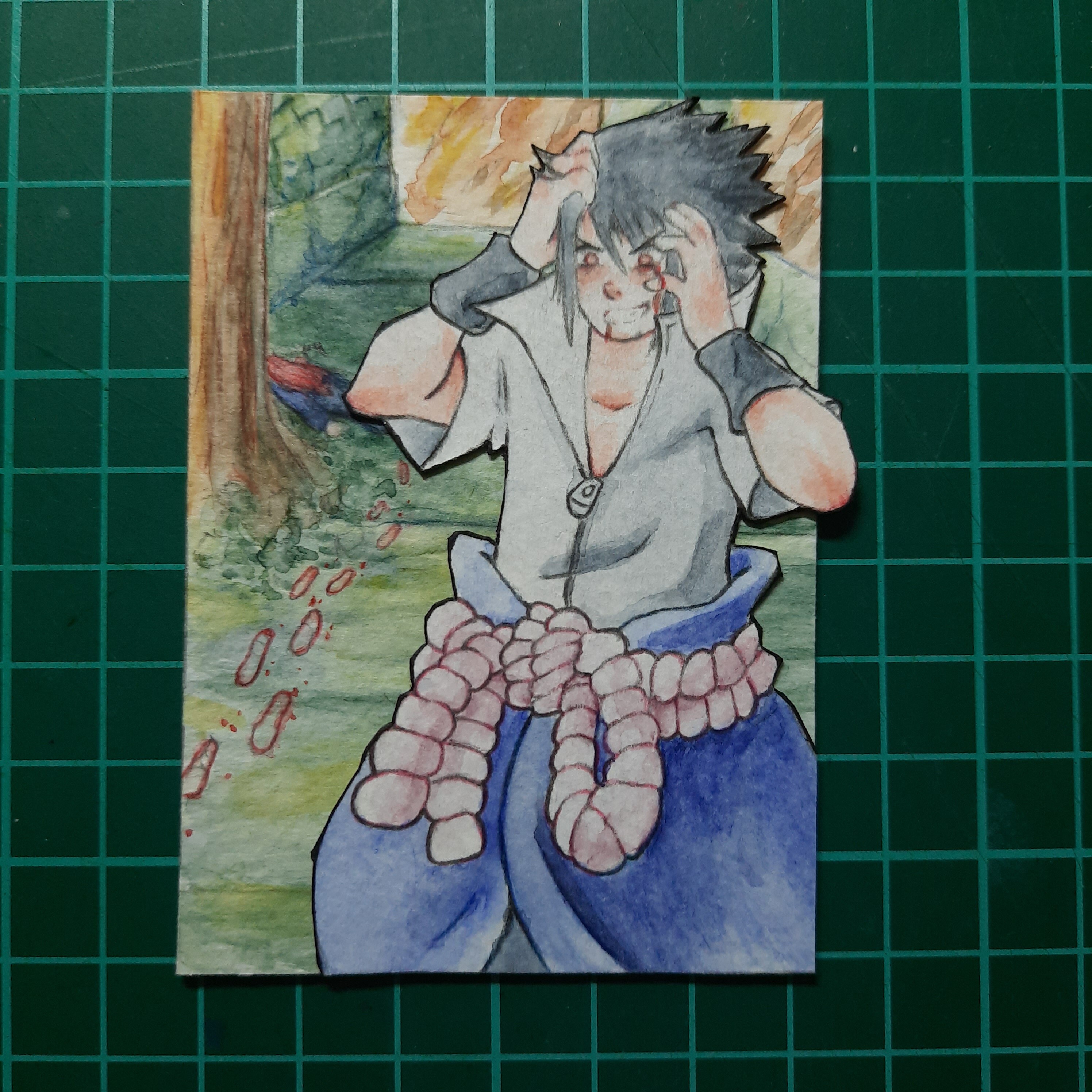 Ich hab Sasuke ausgeschnitten, da ich das Papier vom letzten HG mit dem Radierer aufgeraut habe, aber ich ihn nicht entsorgen wollte, da ich ihn doch recht gelungen fand. Den Hintergrund habe ich dann separat gezeichnet und Sasuke ein wenig versetzt darauf platziert, damit ein leichter 3D Effekt entsteht.