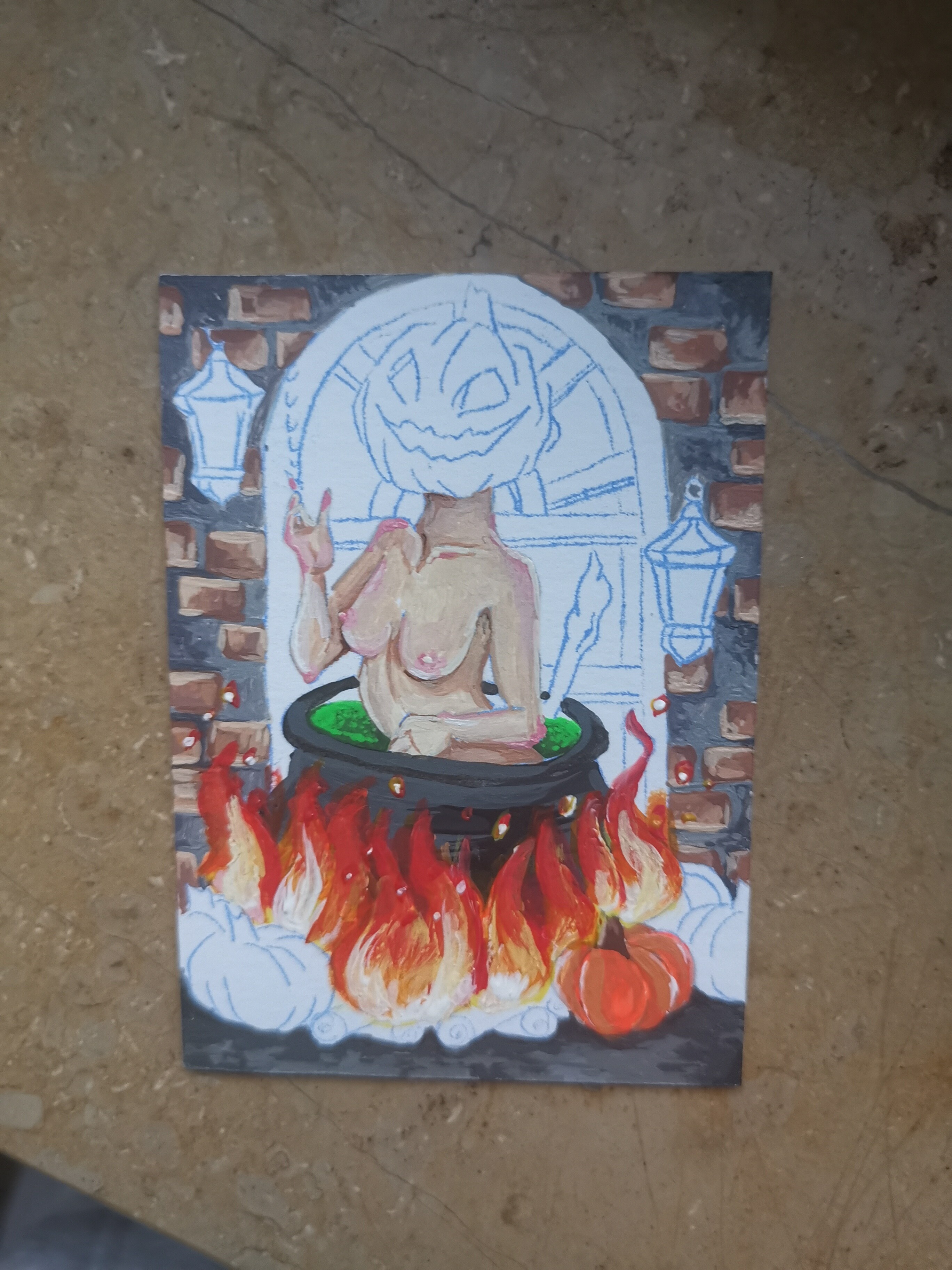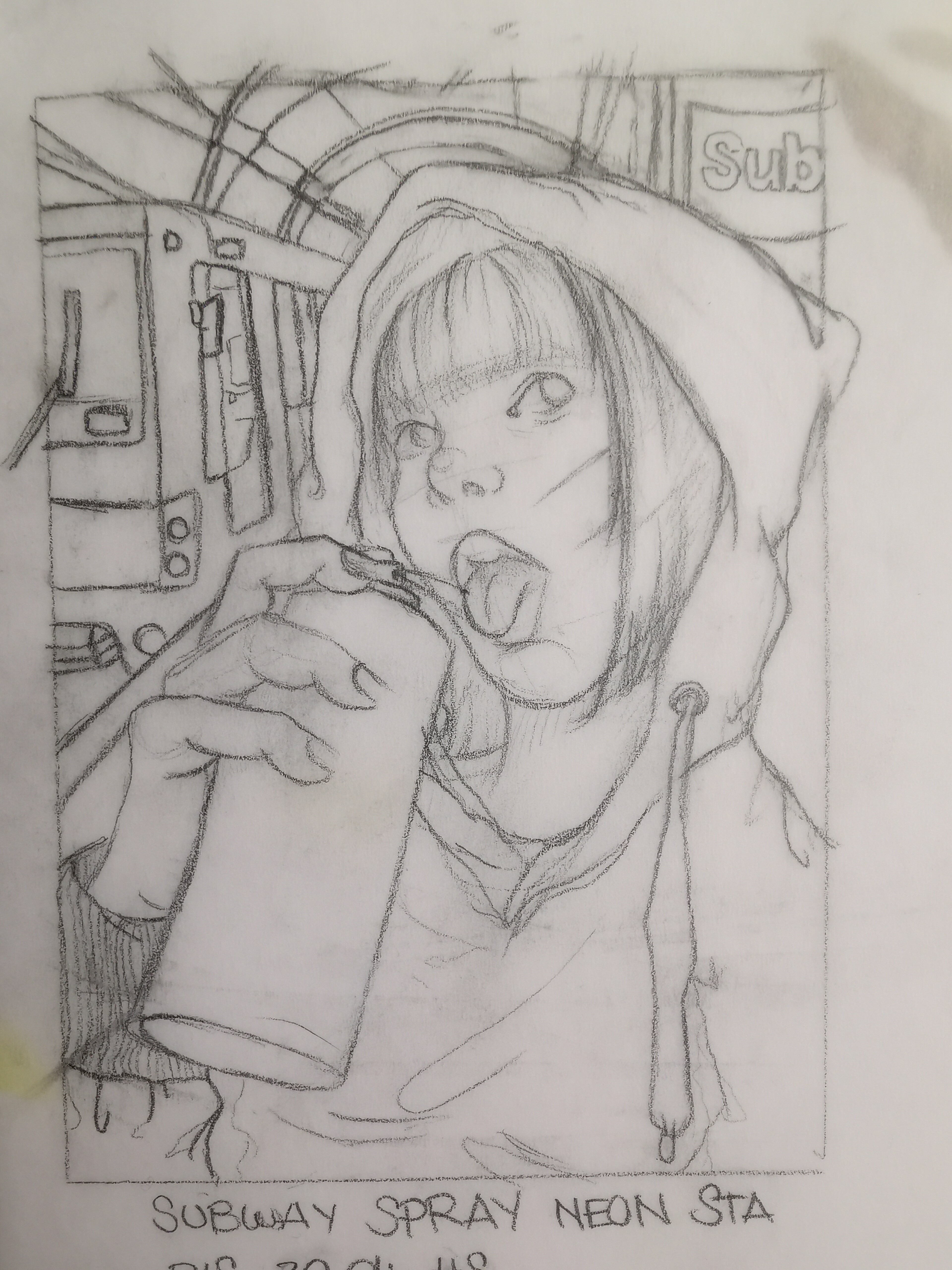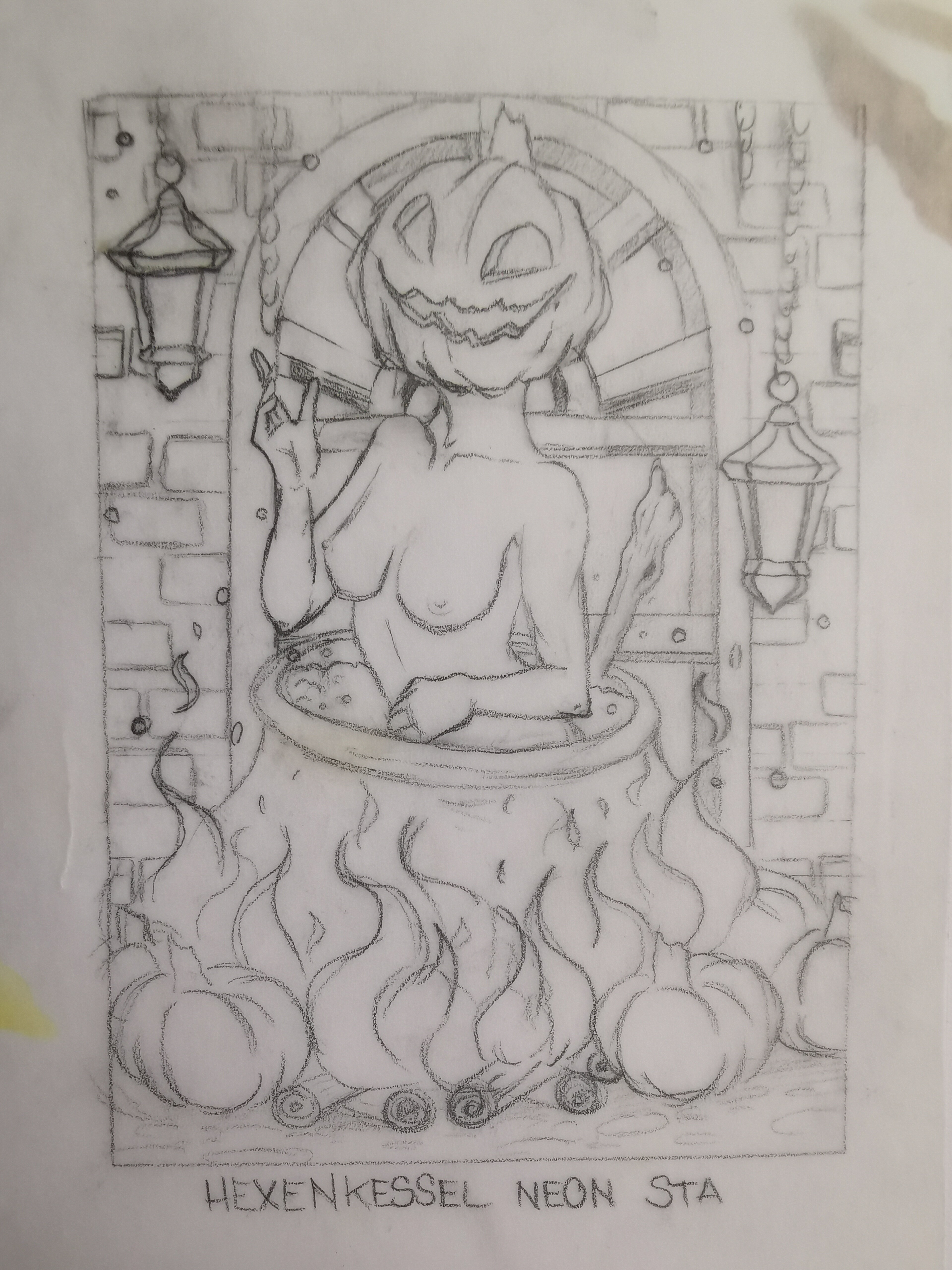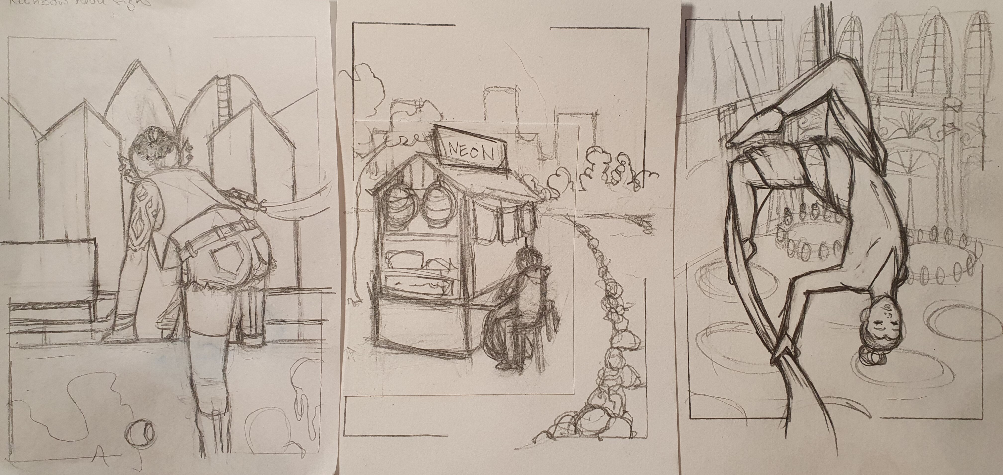 Mitte: Etwas gröbere Skizze. Ein Ramenstand mit Laternen und Neonschild, wo aktuell der Platzhalter ist. Wird wahrscheinlich irgendein Motiv (eventuell eine Glückskatze oder so) und kein Text (: