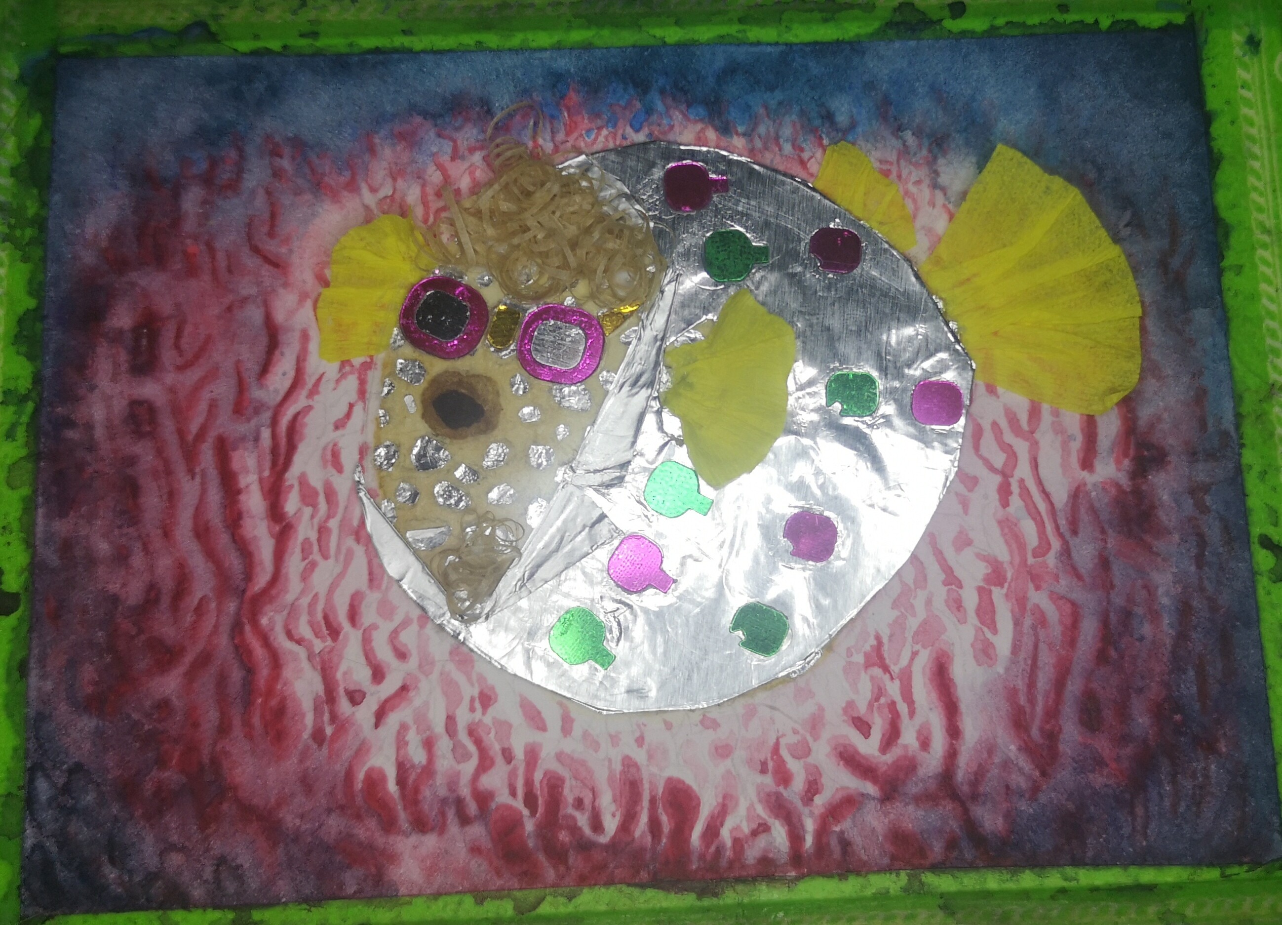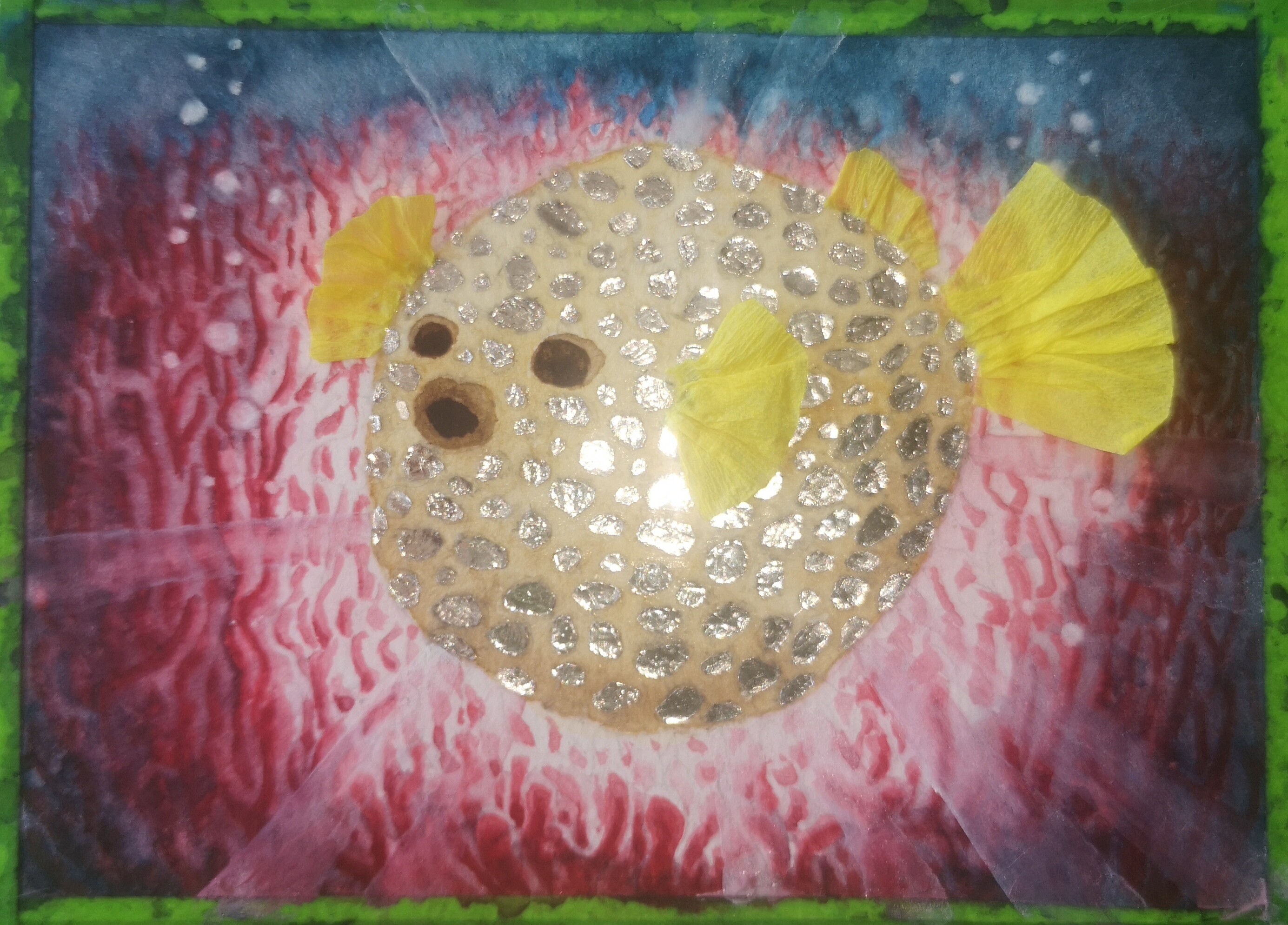 Der Kugelfisch ist jetzt vollständig beklebt und die Plättchen nochmal vorsichtig anpoliert, dass sie schön glänzen. In die Korallen am Rand bin ich auch nochmal reingegangen, auch wenn das meiste davon am Ende tatsächlich weggeschnitten wird