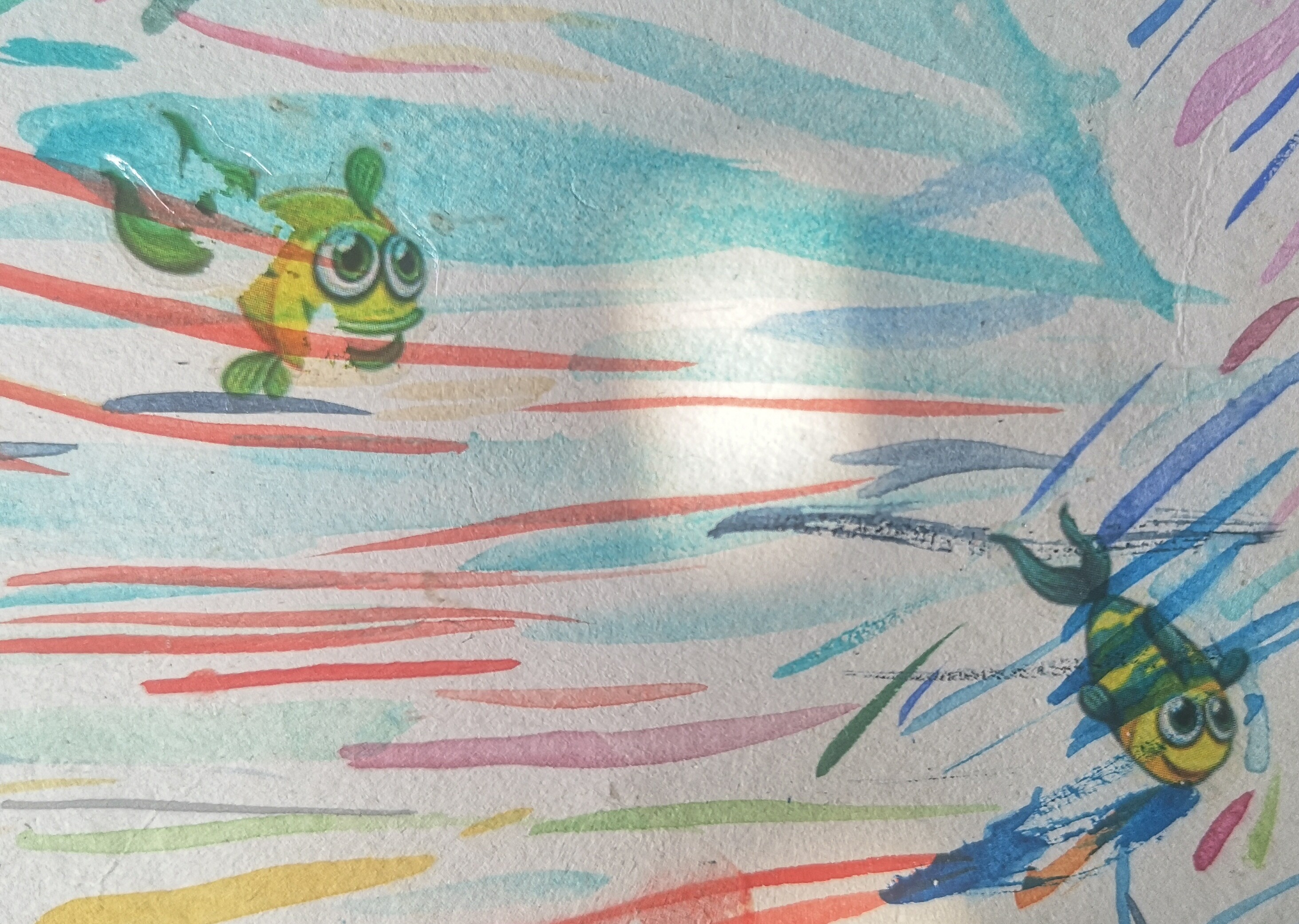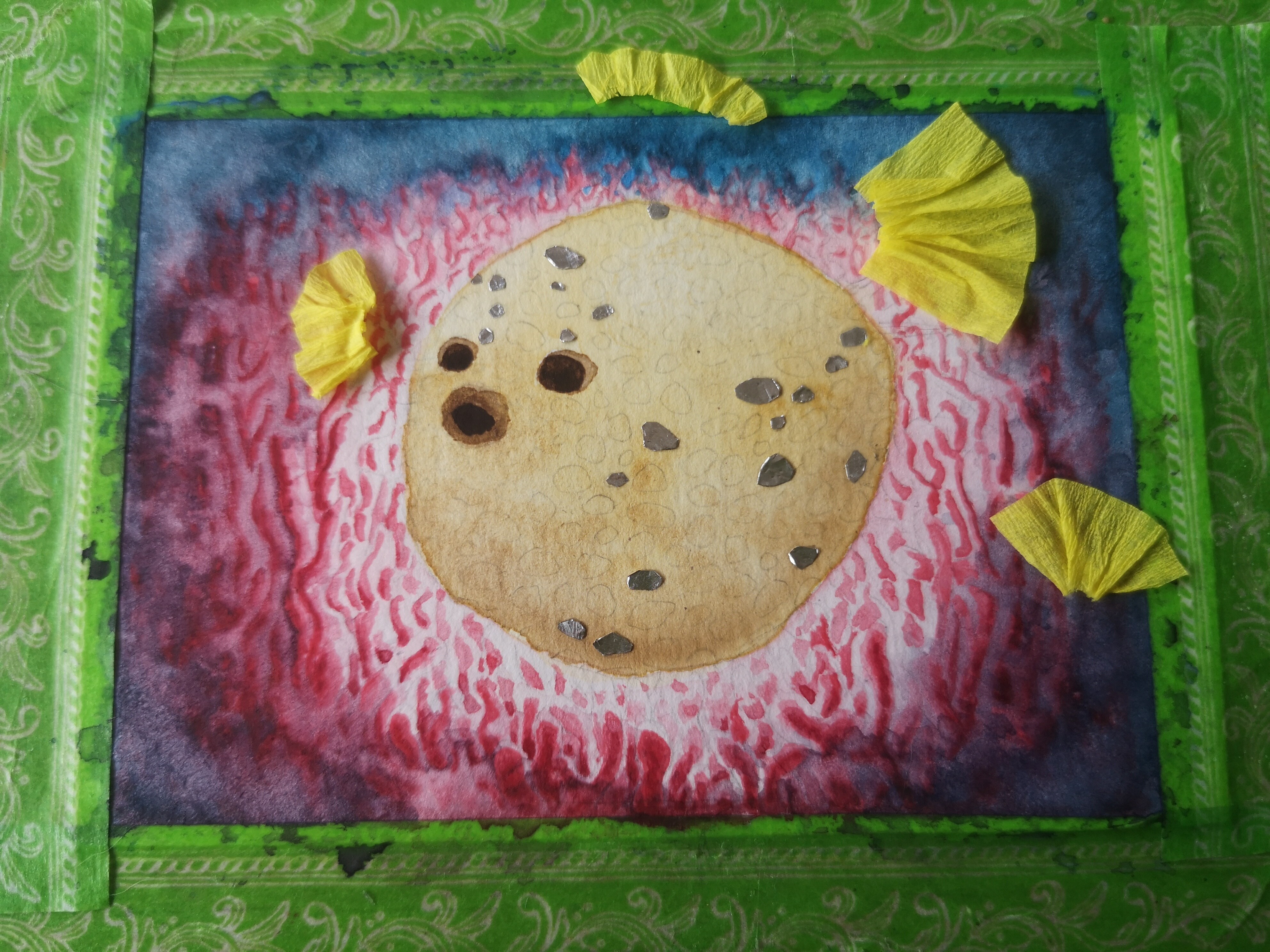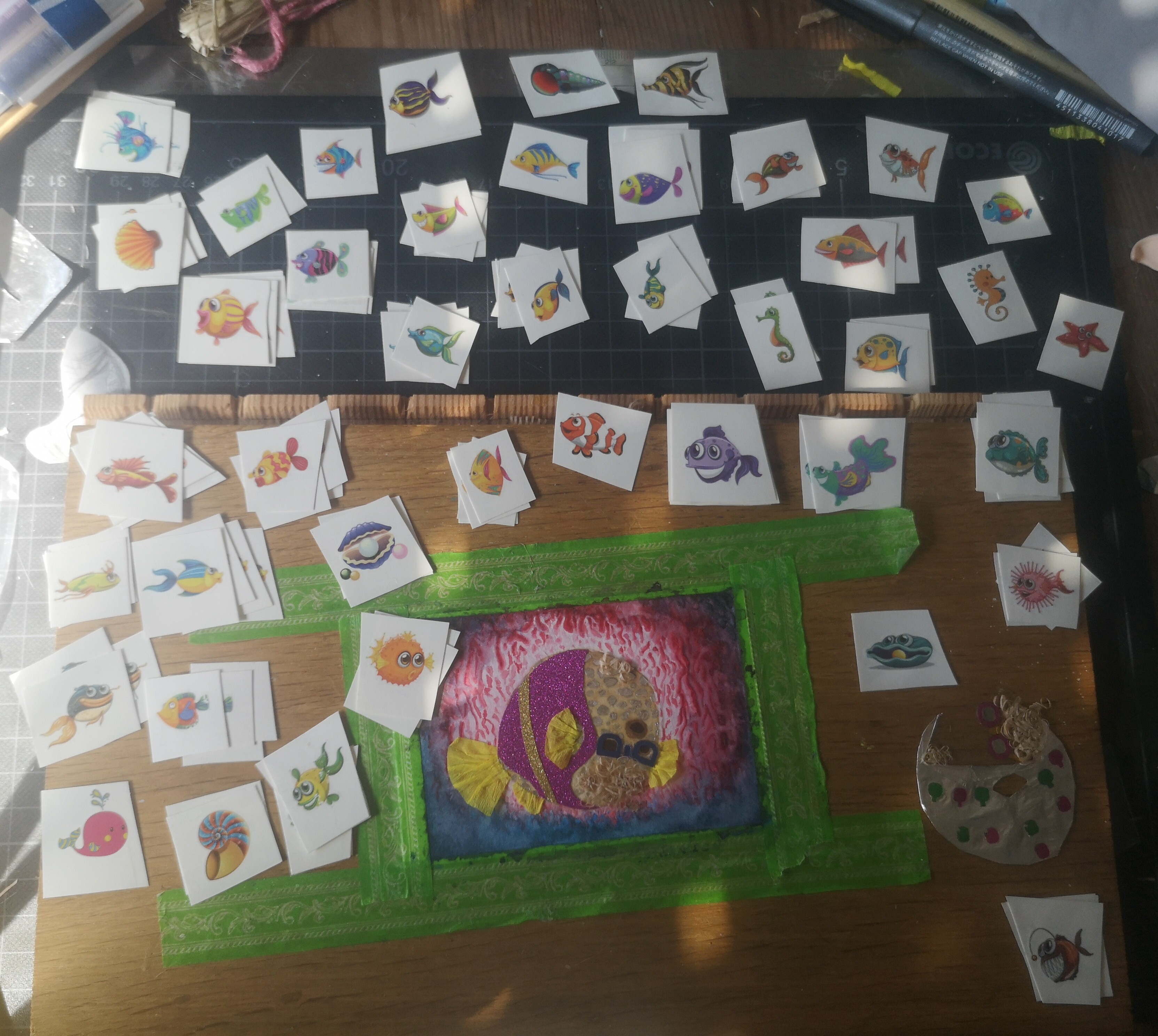 Motivpapier an sich hab ich nicht gefunden, aber mir ist eibgefallen, dass ich von einer meeresthematisierten Party aus der Fortbildung noch so Abziehbildchen hab. Bin sehr geneigt, auszuprobieren, wie die auf bemaltem Papier halten und dann da zwei oder drei zum Kugelfisch dazu zu bappen, wenn das genehmigt würde?