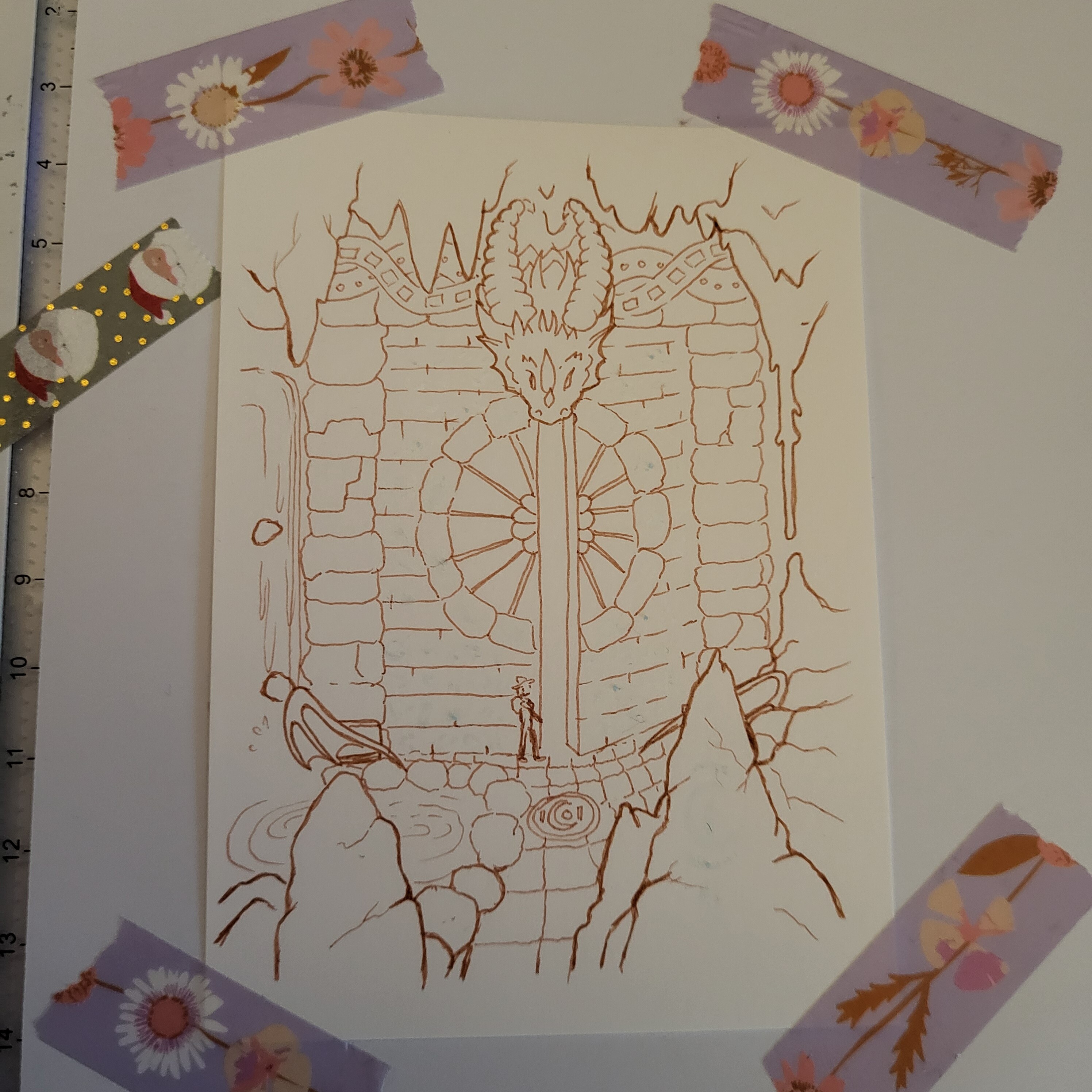 Die Tür wird einen grell leuchtenden Durchgang enthüllen, das Feuer (Kohlepfannen) wird etwas leuchten und etliche mystische Symbole in der Tür und dem Felsen.