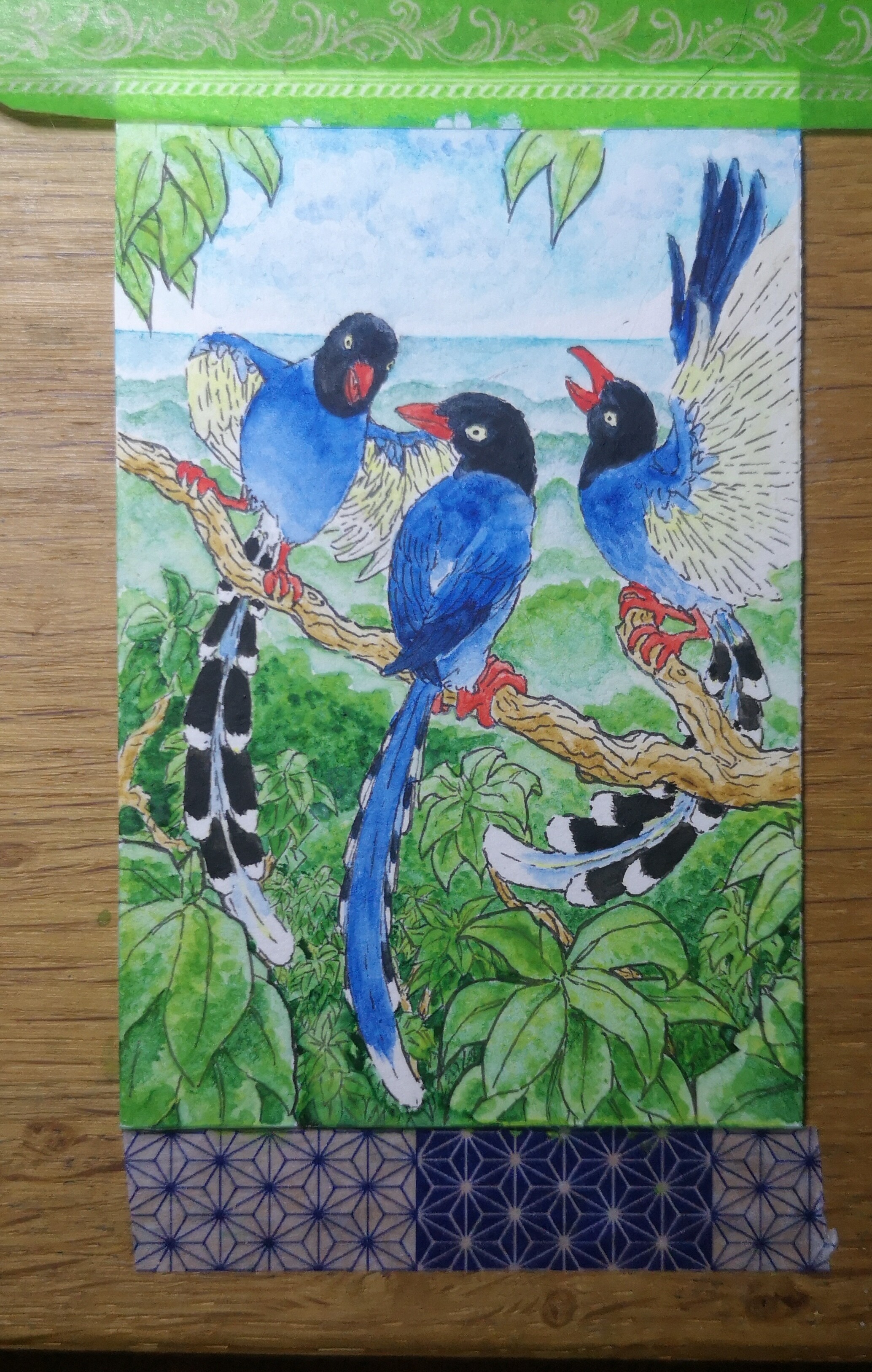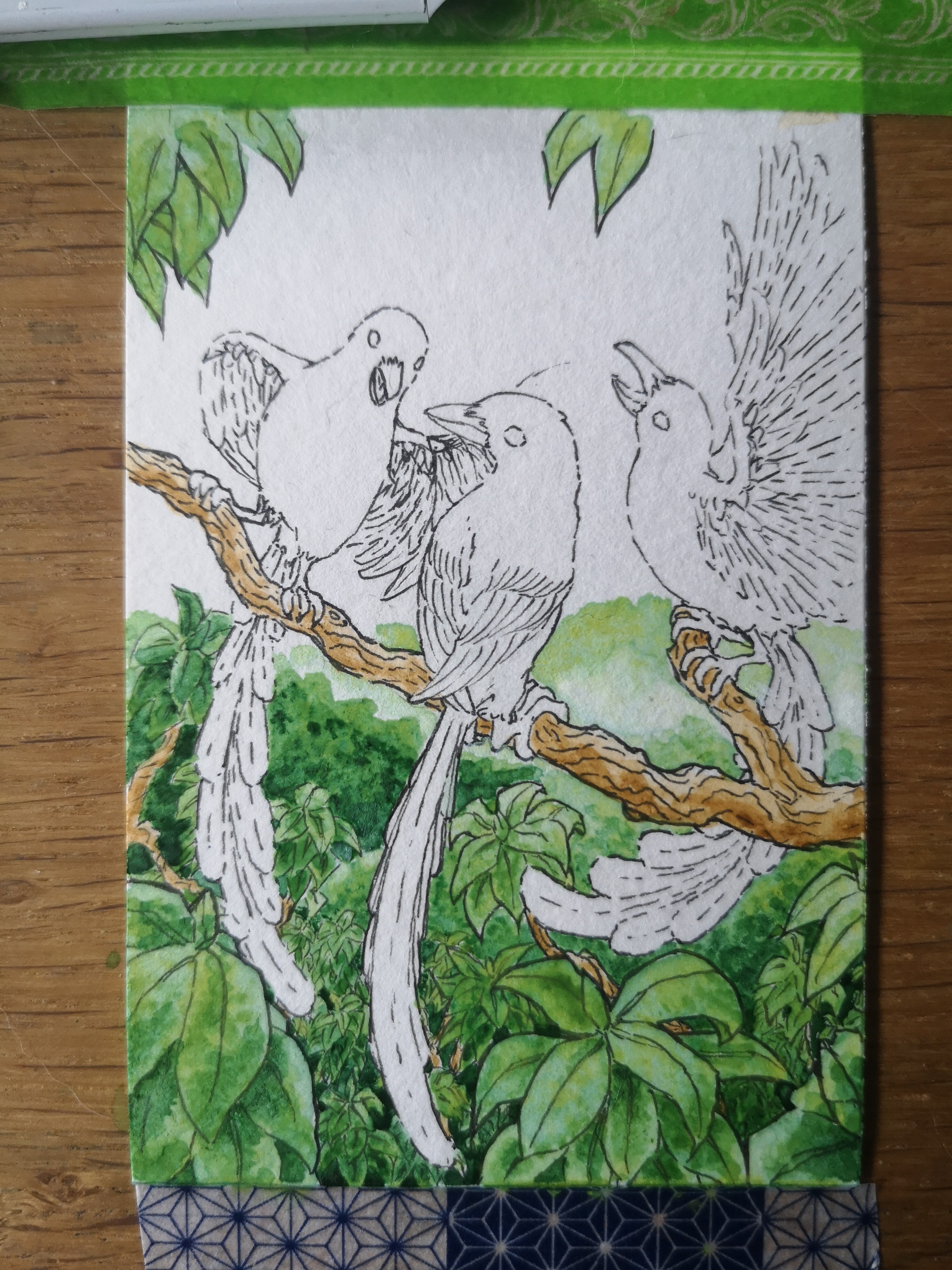 Als nächstes sind dann die Kittas dran. Wenn die ihre Farbe haben, seh’ ich auch besser, wo noch Fehlstellen im Blattwerk sind und wie ich den oberen Teil des Hintergrundes gestalte.
